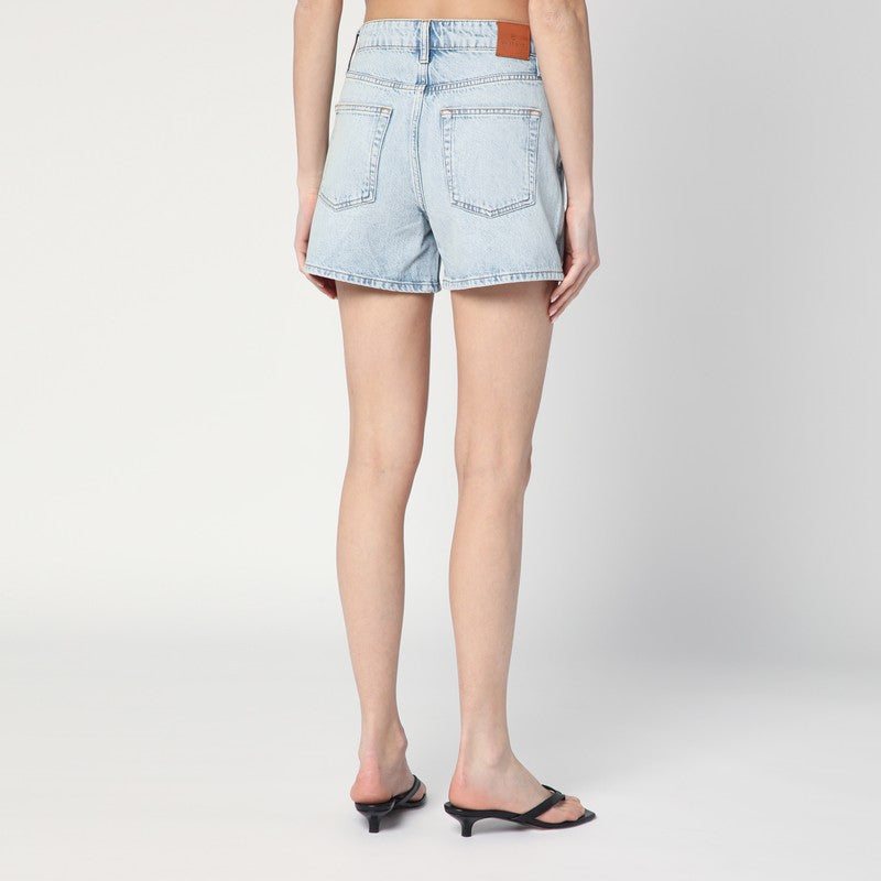 Shorts par Anine Bing dans le denim Blue Organic Cotton Blend, avec une fermeture à fermeture éclair et de bouton avant, des boucles de ceinture, cinq poches classiques et un patch de logo arrière.