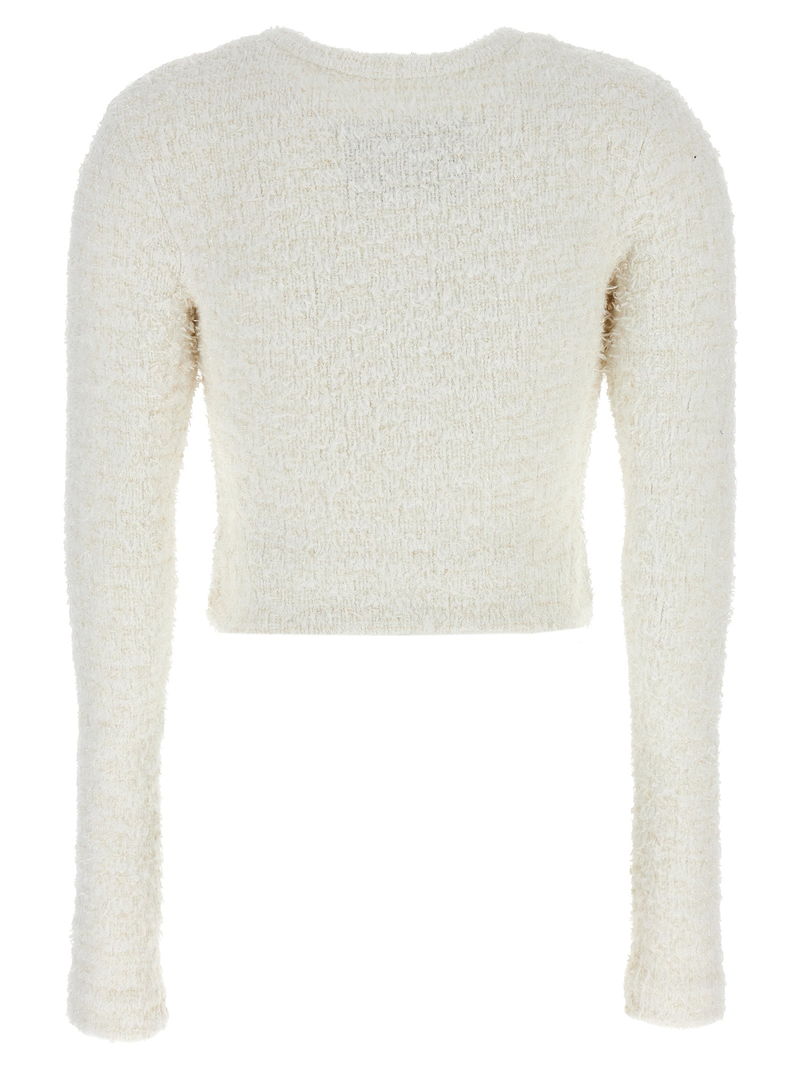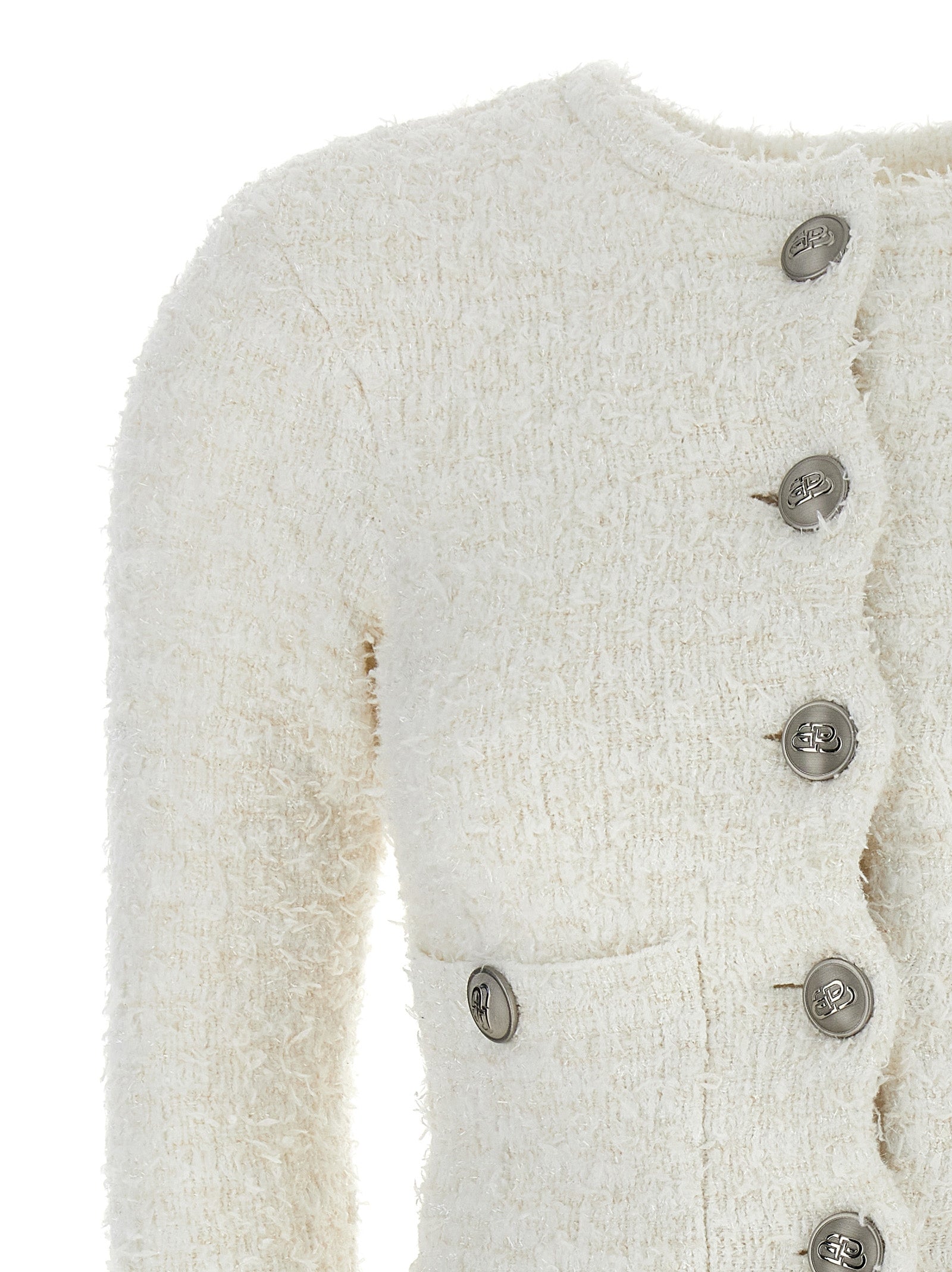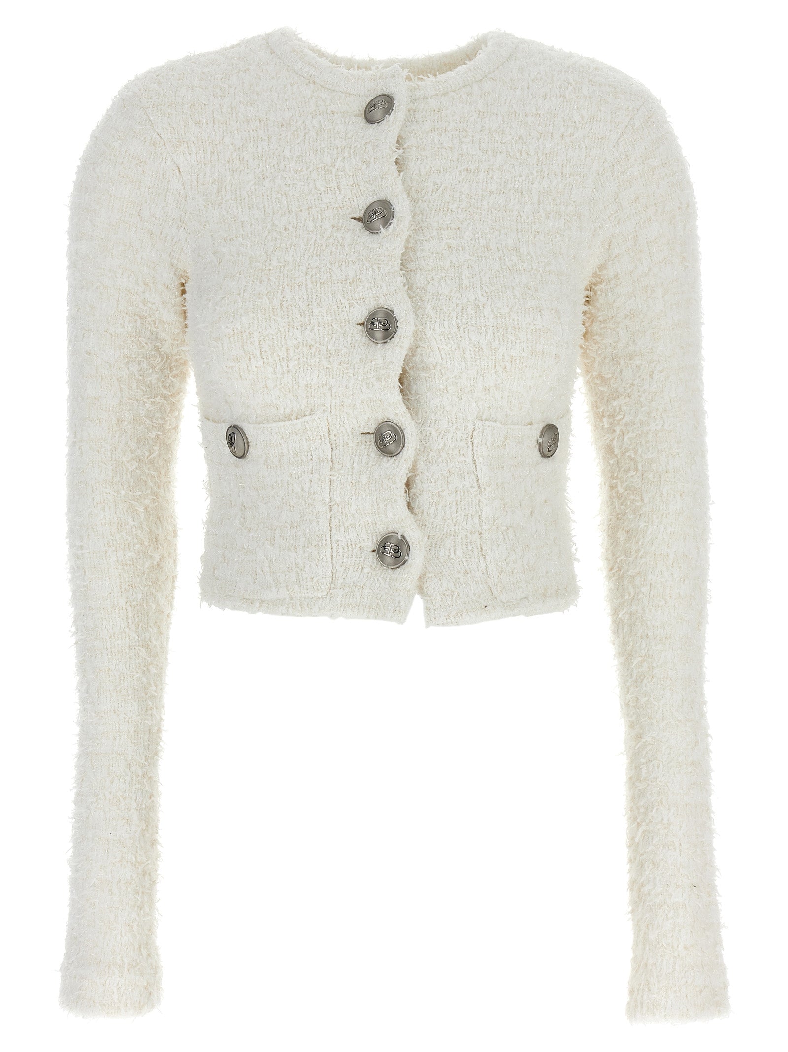 Cardigan «recadré» dans un mélange de coton extensible, cou de l'équipage, fermeture avant avec boutons de logo, poches, manches longues.