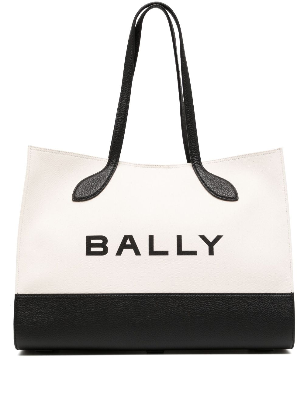 Bar Sac fourre-tout à imprimé logo de Bally avec ECRU, noir, cuir, imprimé de logo à l'avant, tampon de logo interne, fixation magnétique, deux poignées supérieures, compartiment principal et poche de raccordement zippé interne.