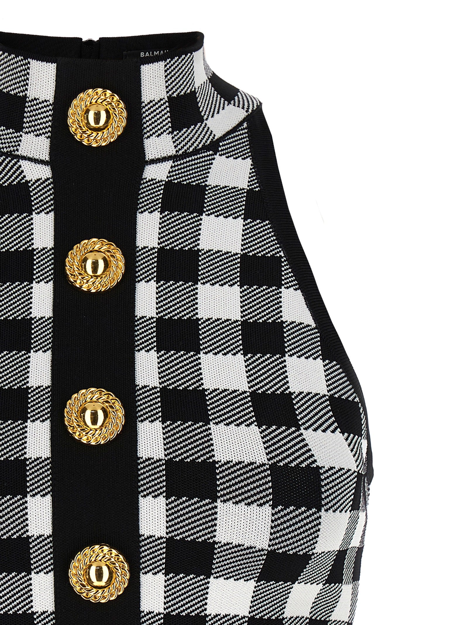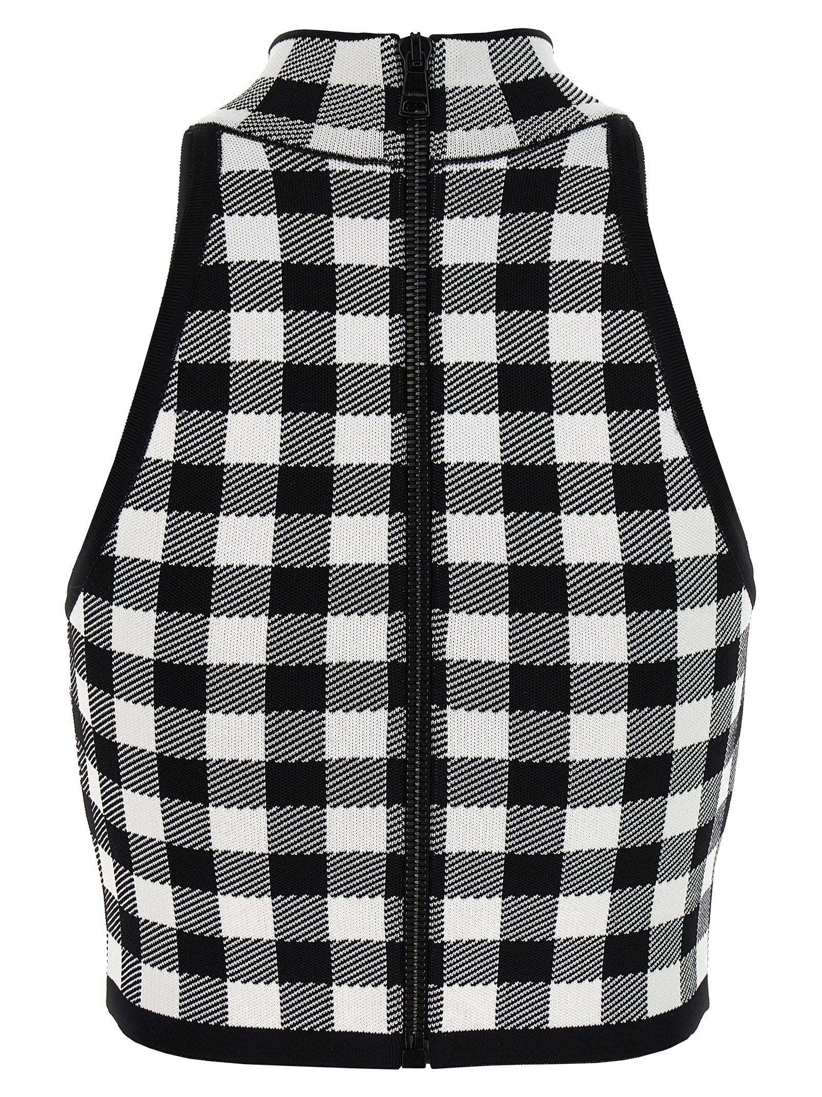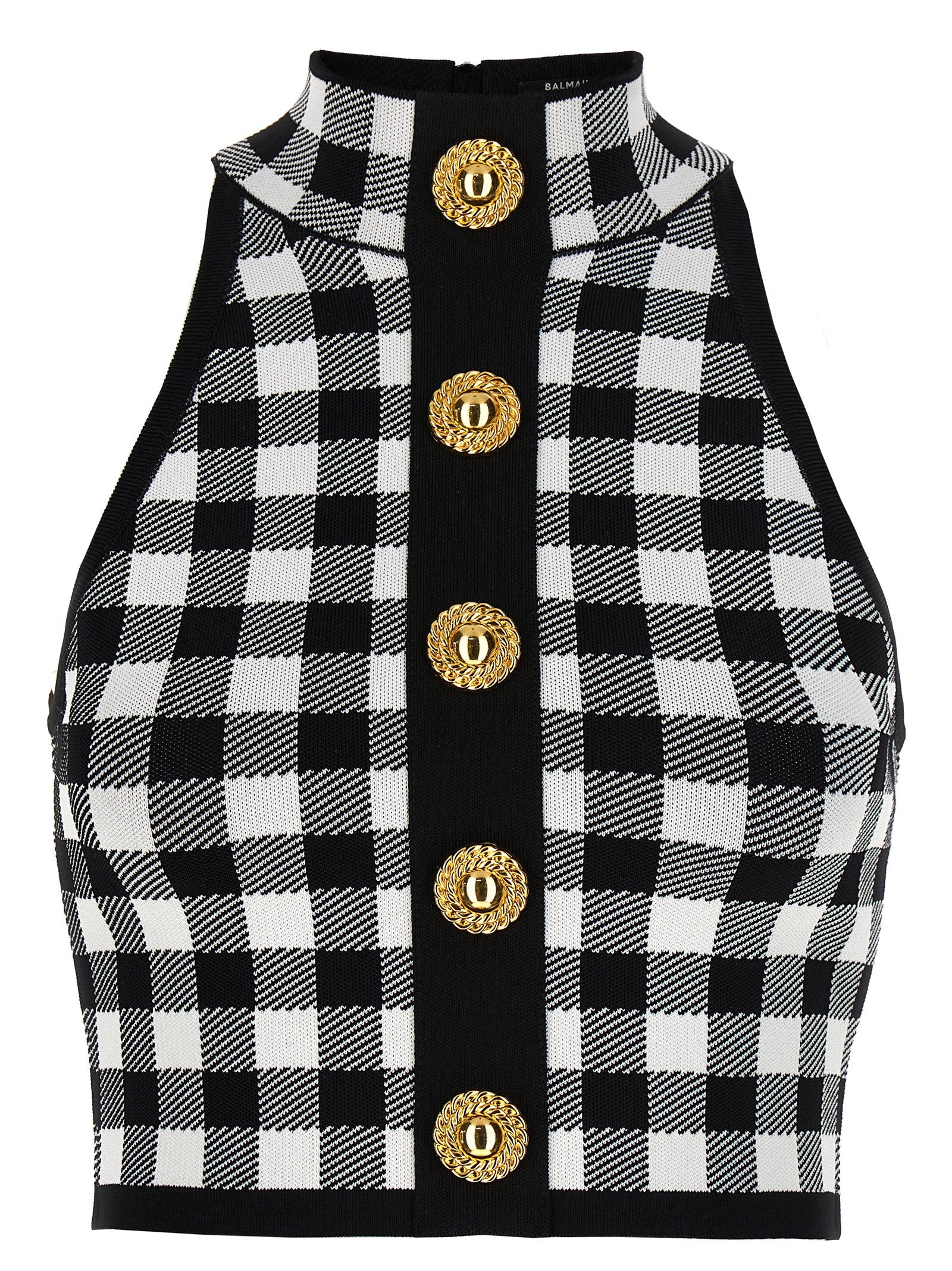 Top recadré sans manches dans un tricot de mélange de viscose avec un col haut, un détail du bouton de logo avant, une fermeture de fermeture éclair arrière.