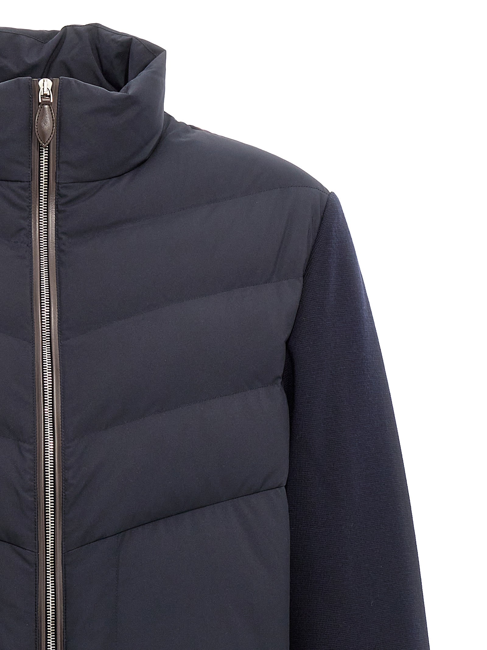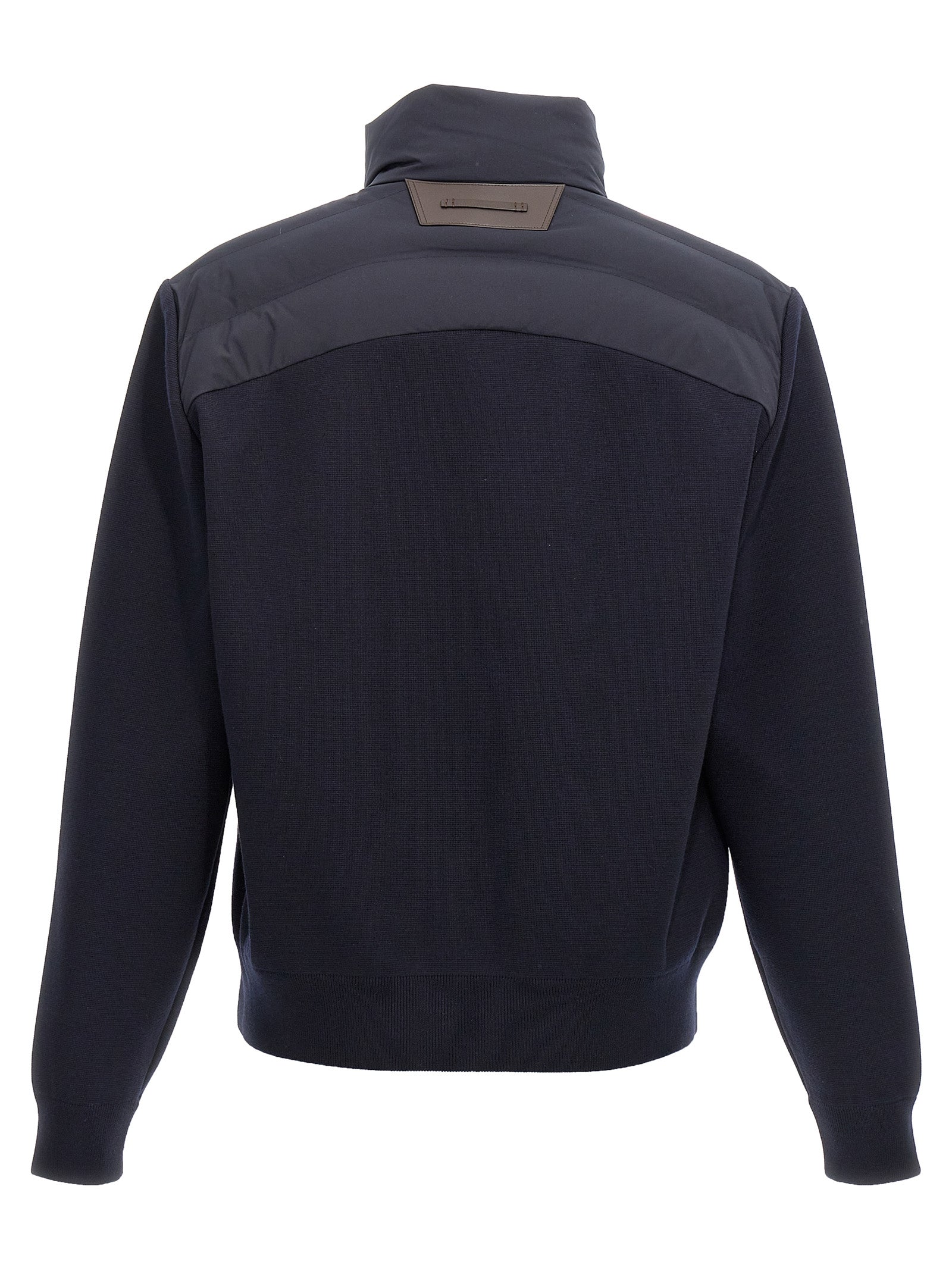 Veste en nylon en nylon à deux matériaux, inserts en tricot en laine et détails en cuir, fermeture à fermeture éclair, manches à remise à long terme.