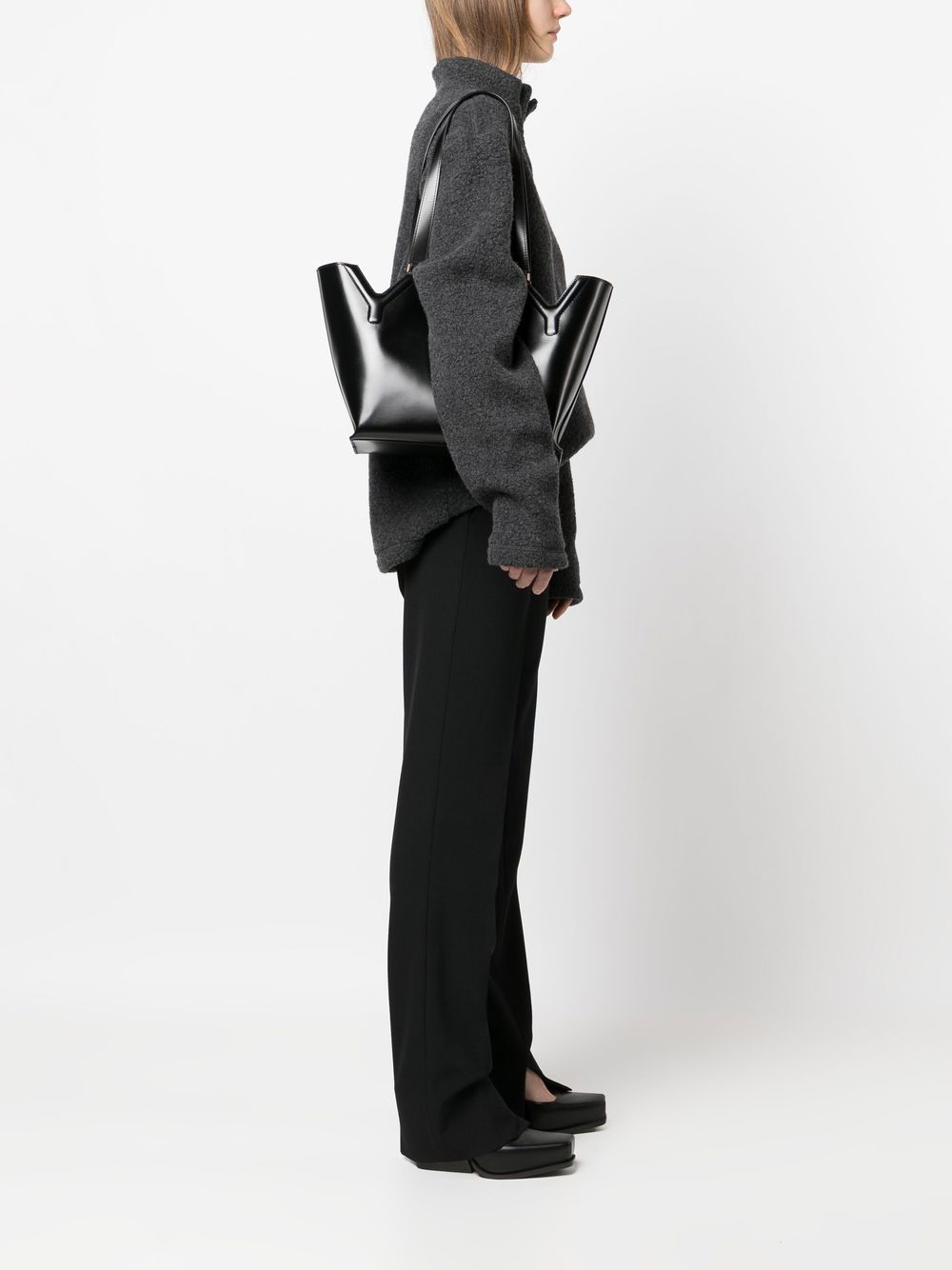 Yy West Leather Tote Bag de Boyy avec noir, cuir de veau, détails découpés, quincaillerie à tons dorés, deux poignées de haut long, une poche amovible, un compartiment principal, une doublure en daim et une poche interne pour zipation.