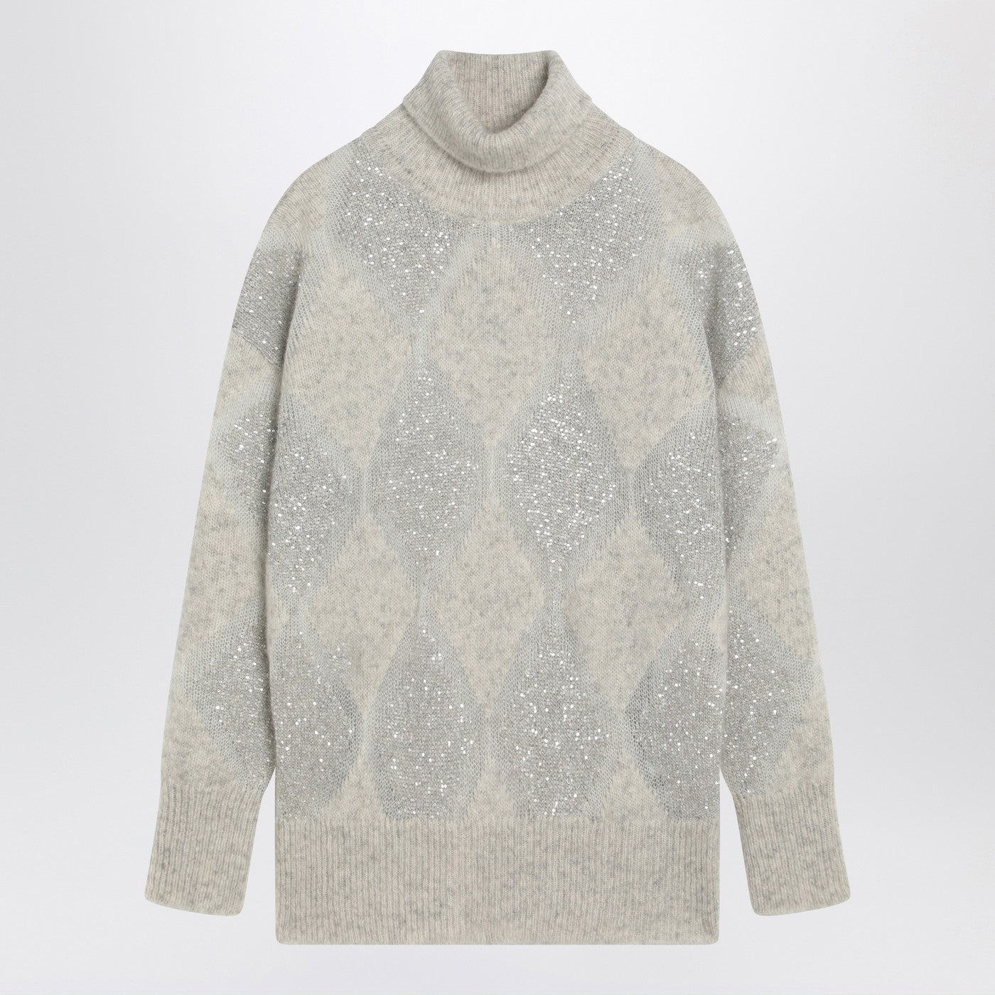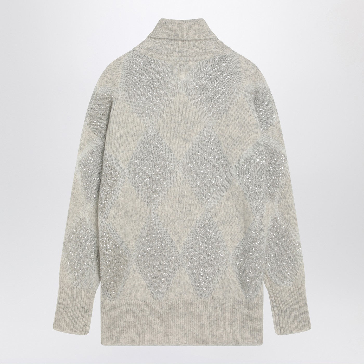Laine gris perle et pull mohair de Brunello Cucinelli avec un col roulé, des manches longues, un motif de diamant avec des paillettes, des garnitures côtelées et un ajustement détendu.