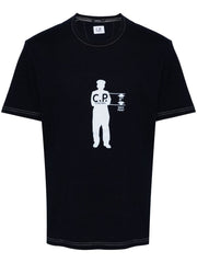 Navy Blue Cotton Jersey Texture Contraste Couxage Round Cou Round Garnières Logo Impression à l'avant et à l'arrière Straight Hem