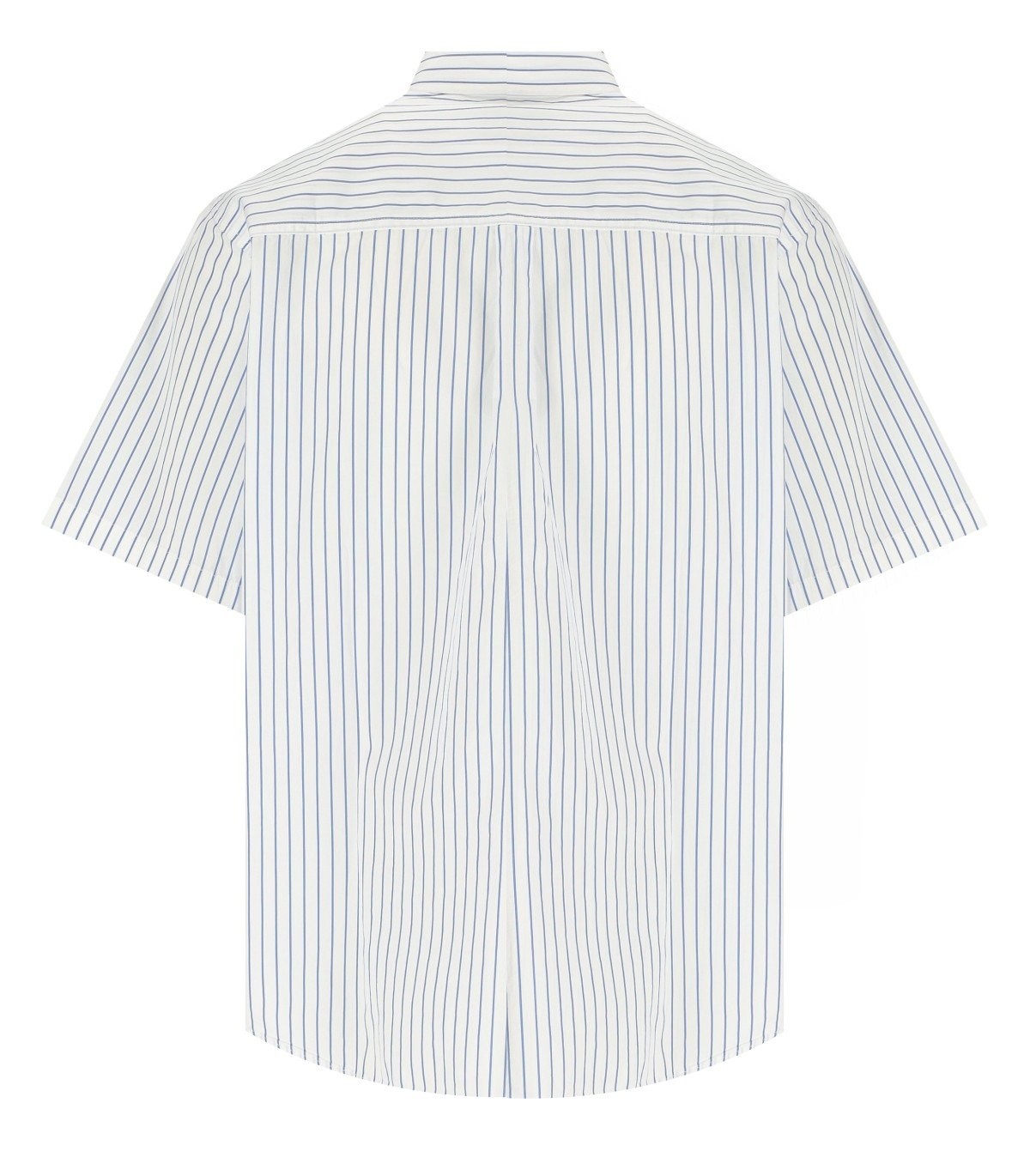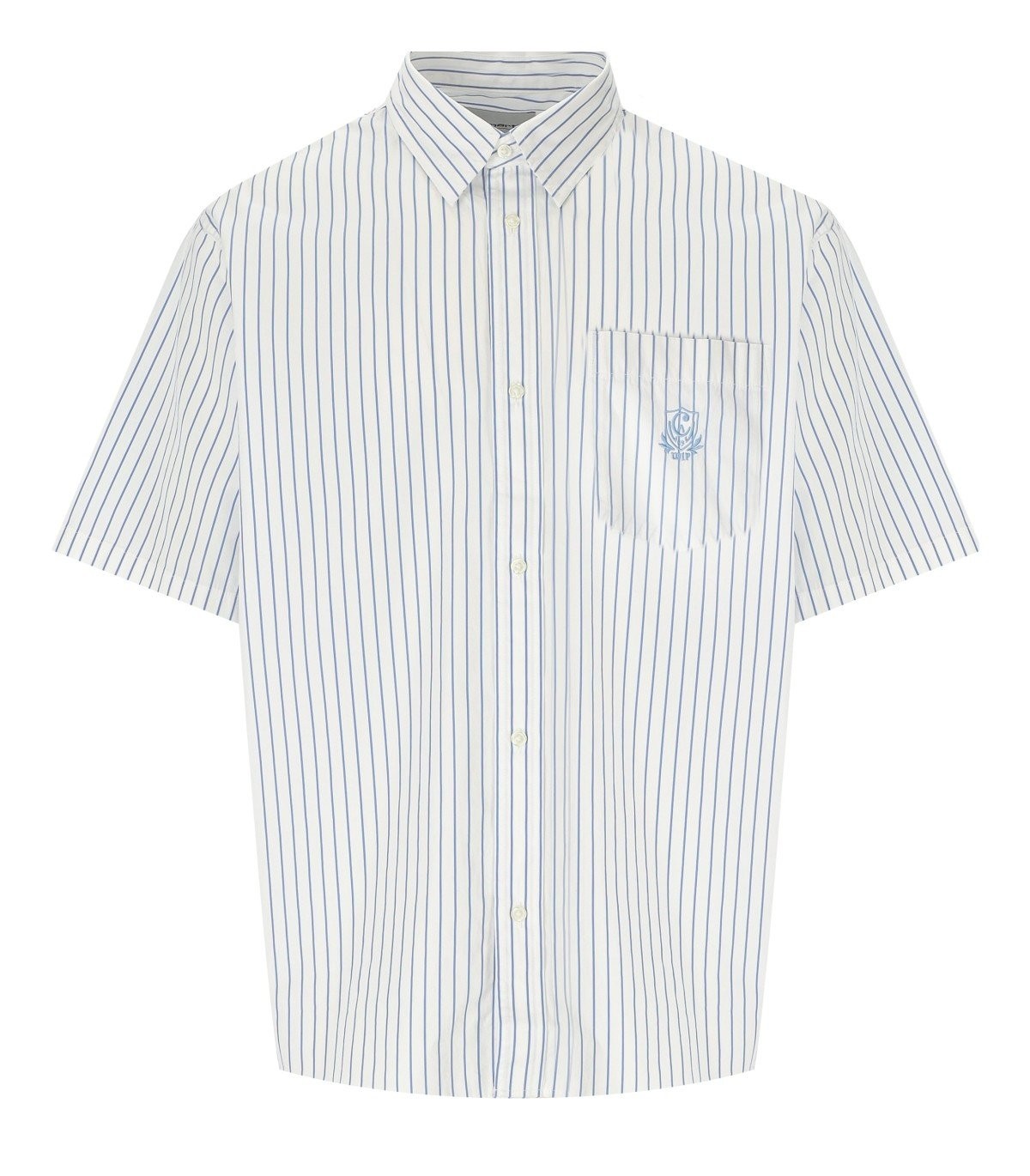 S/S Linus Shirt by Carhartt Wip fait de popline en coton blanc léger, avec un motif de bande vertical dans des nuances de bleu clair. Broderie sur le coffre, fermeture de bouton. Ample. Le modèle mesure 186 cm de hauteur et porte une taille M. Composition: 100% coton.