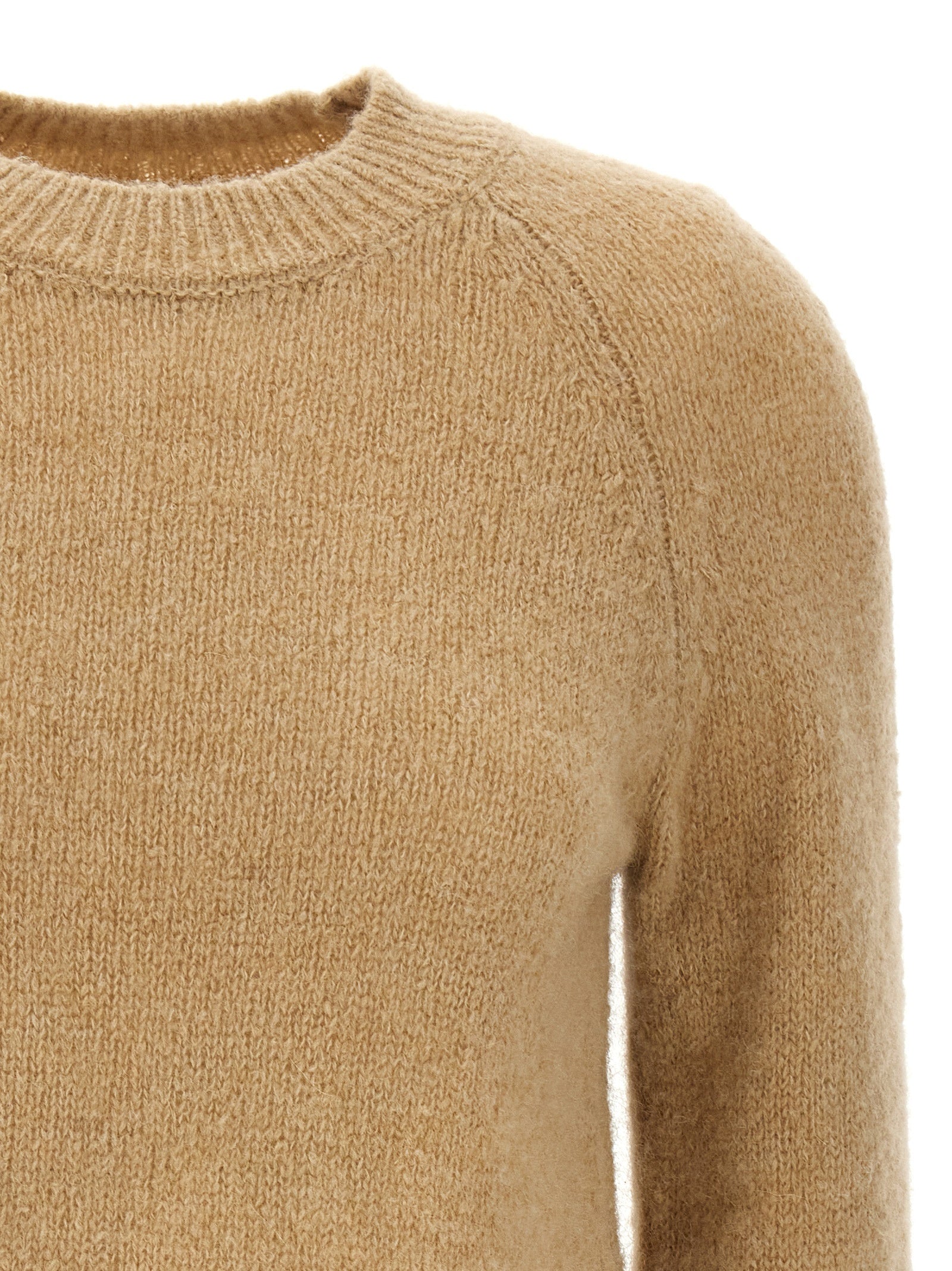 L'alpaga «Texas» mélange un pull avec le cou à l'équipage et les manches à revers longues.