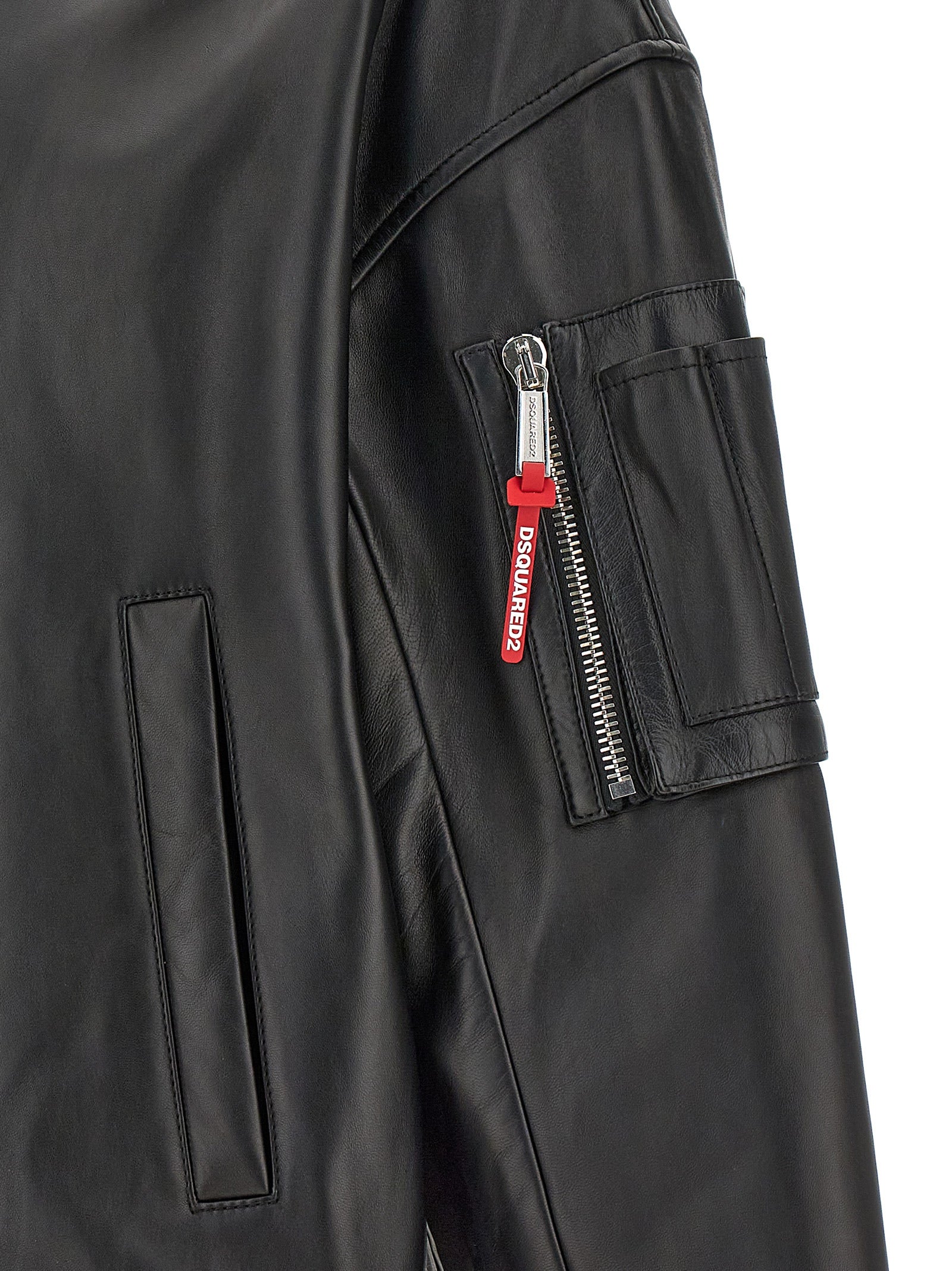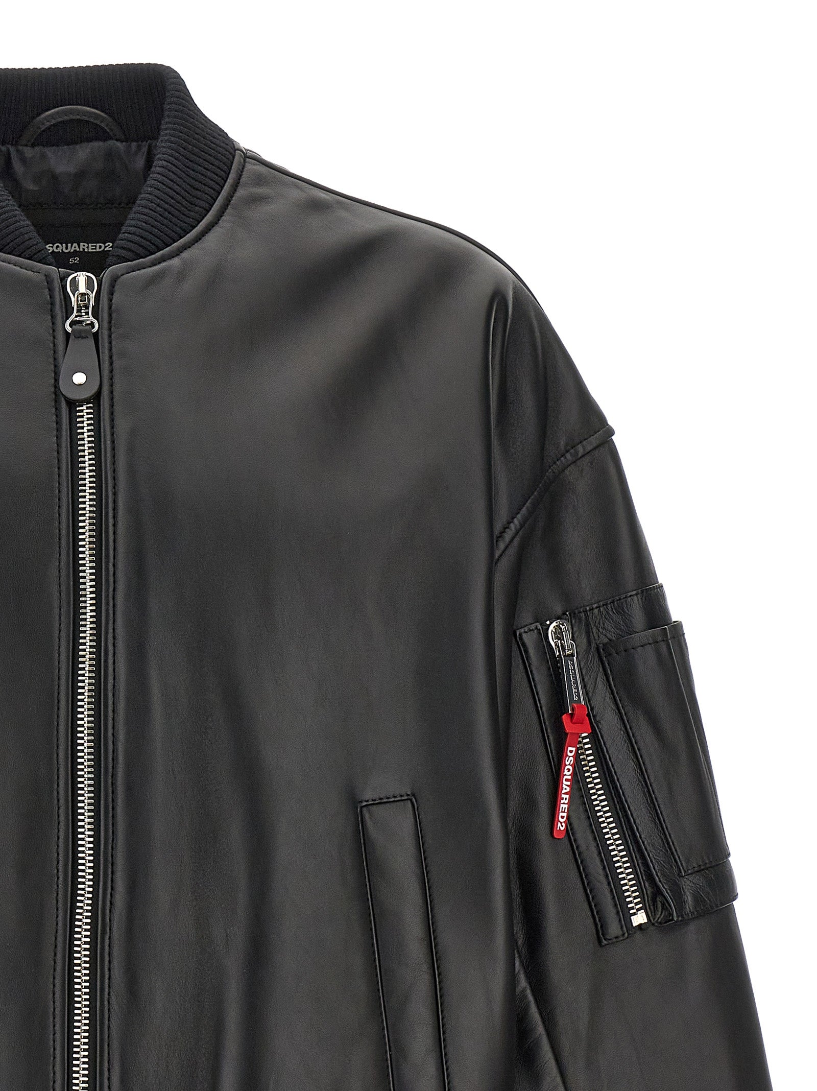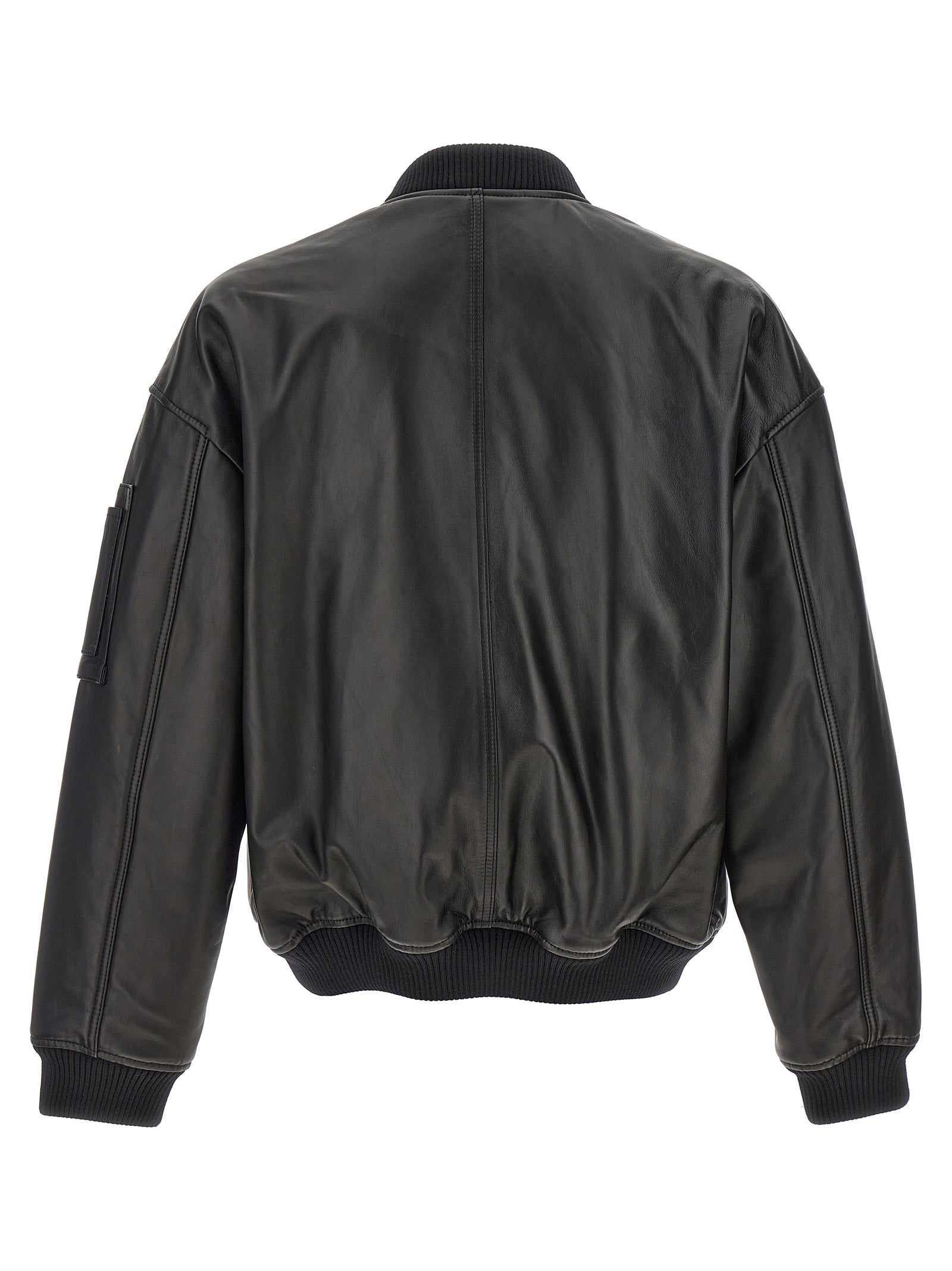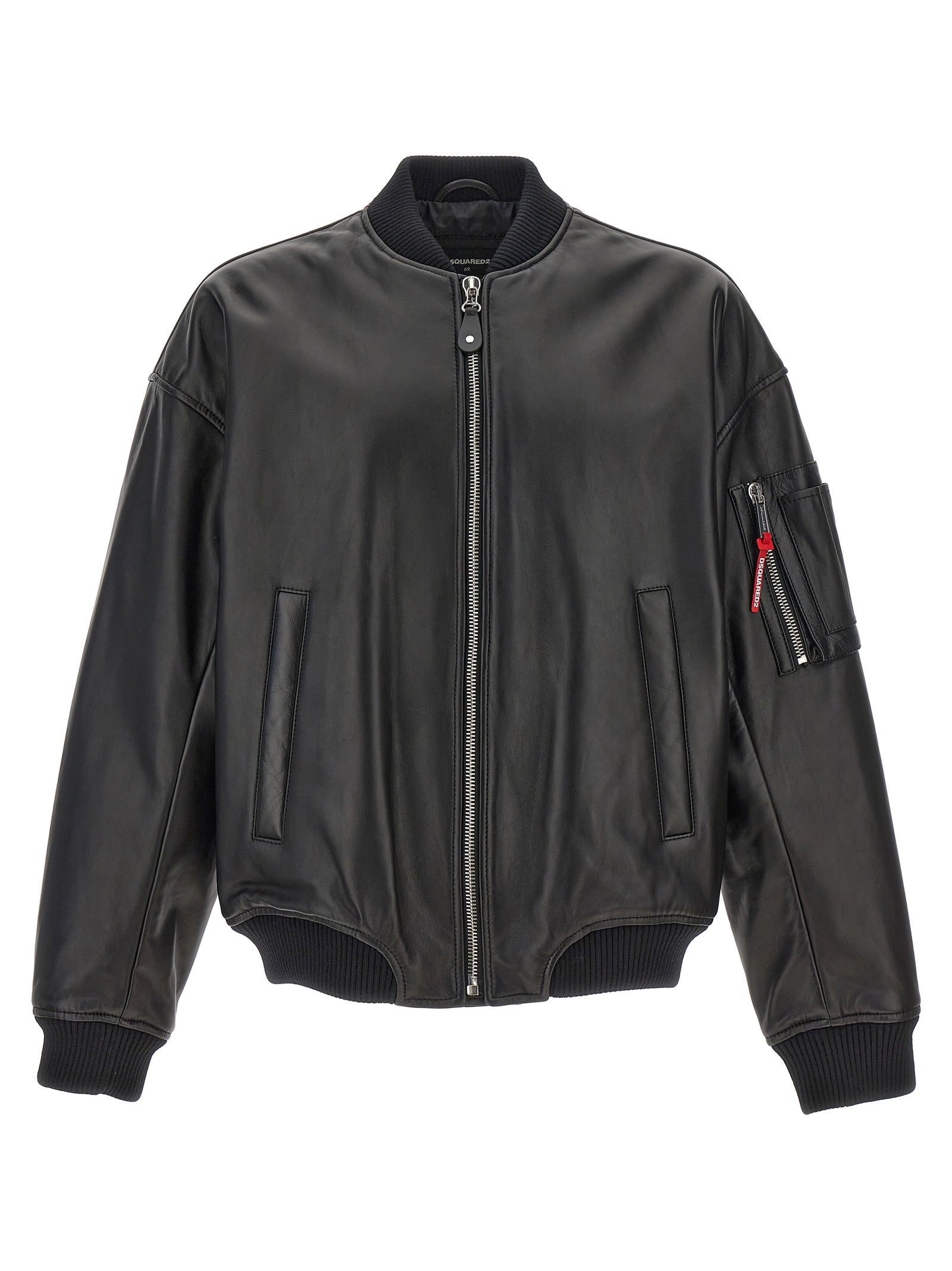 Bomber en cuir, fermeture de fermeture éclair, poches, manches longues avec poignets tricotés.