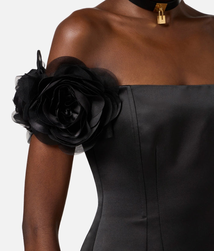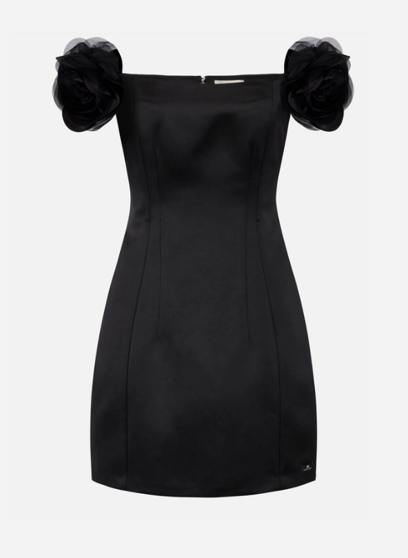 Robe de duchesse. La robe a des épaules ouvertes et une construction interne avec désosser pour donner une silhouette harmonieuse. Une dernière note de style avec des fleurs appliquées dans le ton, la décoration des manches et le volume. Ajustement régulier.