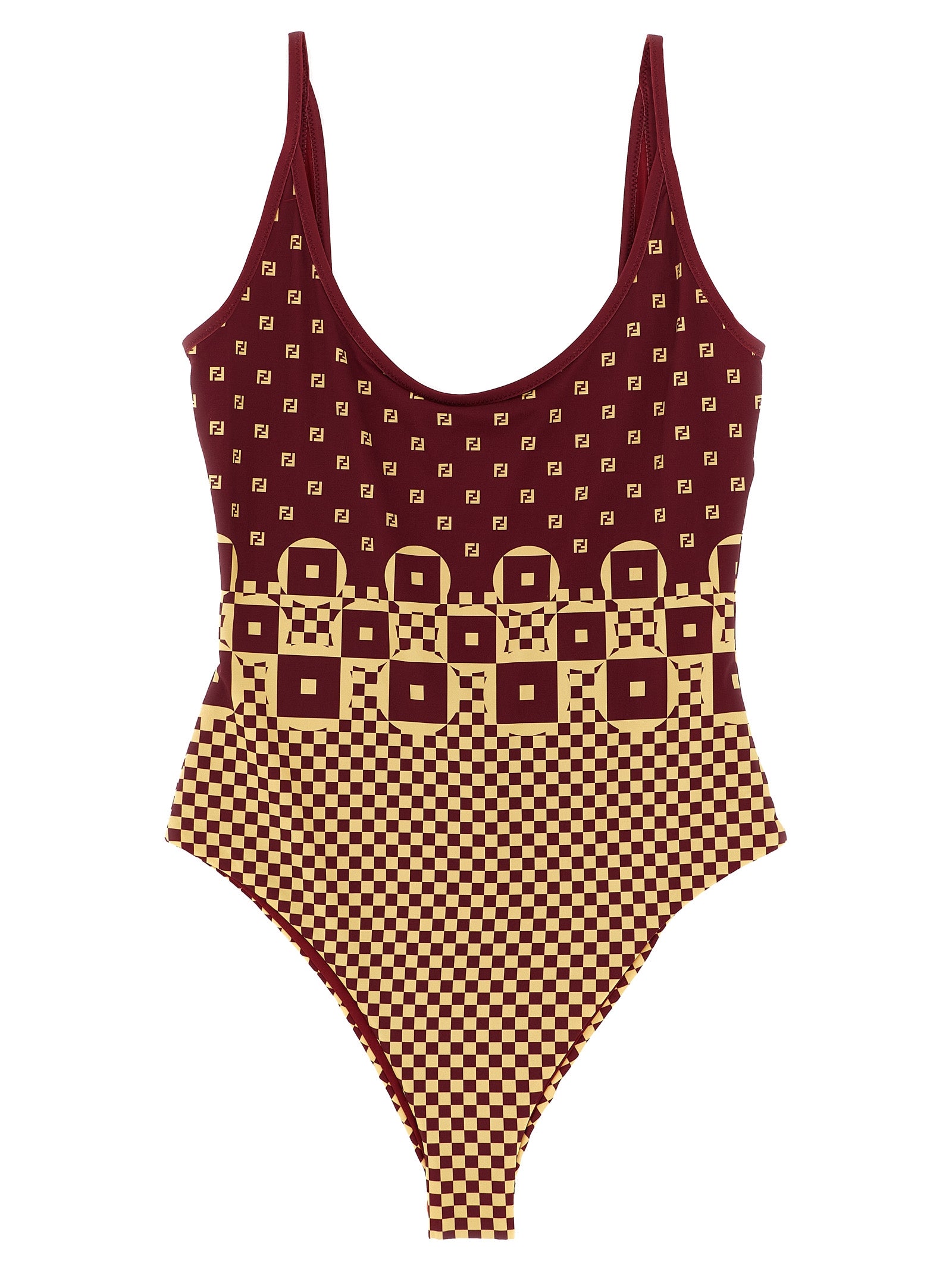 Le maillot de bain en une pièce LYCRA® avec micro-imprimé patchwork qui reproduit un mélange de logos et de motifs d'archives, de sangles minces, de décolleté rond à l'avant, d'un large décolleté rond à l'arrière et de la patte de haute.