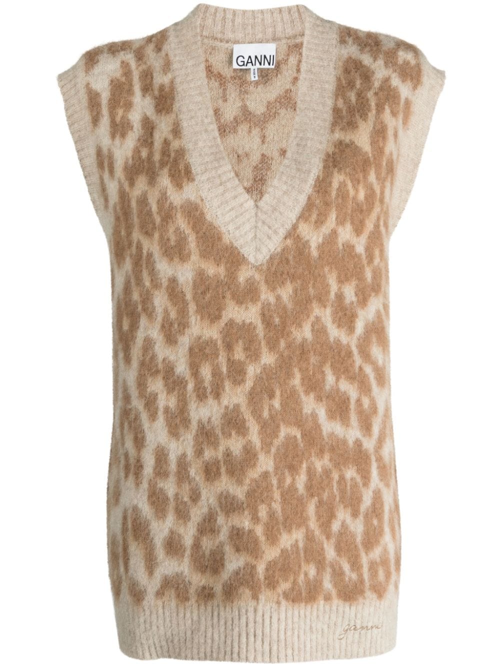 VIE LEOPARD-JACQUARD de Ganni avec un mélange en laine d'alpaga, une construction tricotée, un imprimé léopard, un logo brodé à l'avant, un col en V, un ourlet côtelé, un ourlet côtelé / brun / beige. Cet article est fabriqué à partir d'au moins 50% de matériaux recyclés ou recyclés. Pour les produits de vêtements synthétiques recyclés, nous vous recommandons fortement d'utiliser un sac à laver en microfibre pour s'assurer qu'aucune microplastique qui peut polluer l'eau n'est libérée dans le processus.