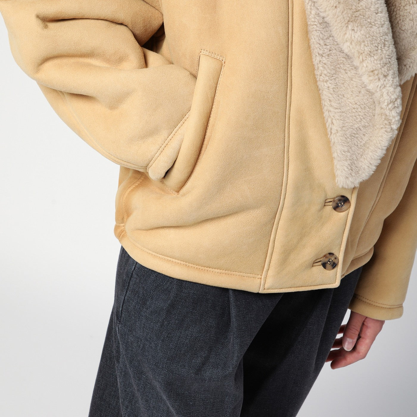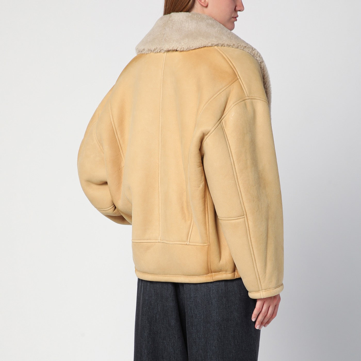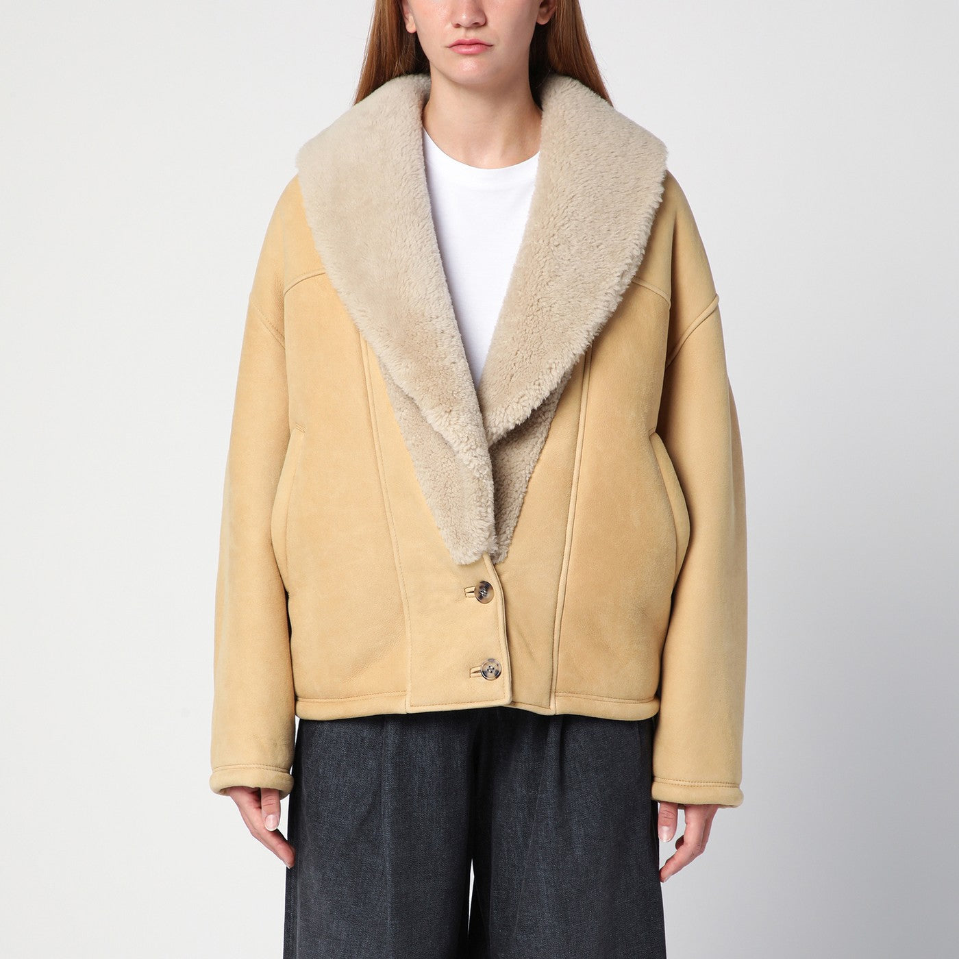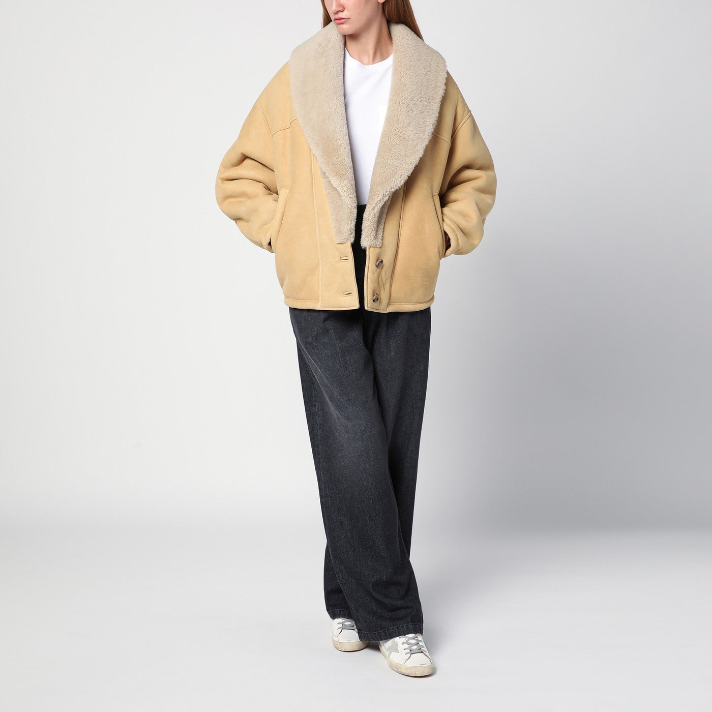 Mouboir de mouton beige par la marque Golden Goose Deluxe, avec un large col de châle de shearling, une étoile à double logo à l'arrière, des manches longues, une placolet de bouton avant et deux poches de soulage latéral.