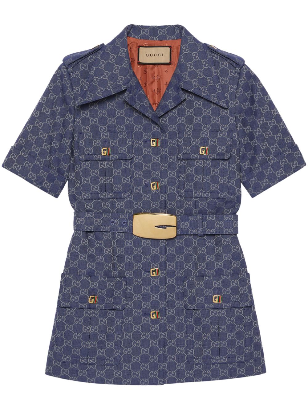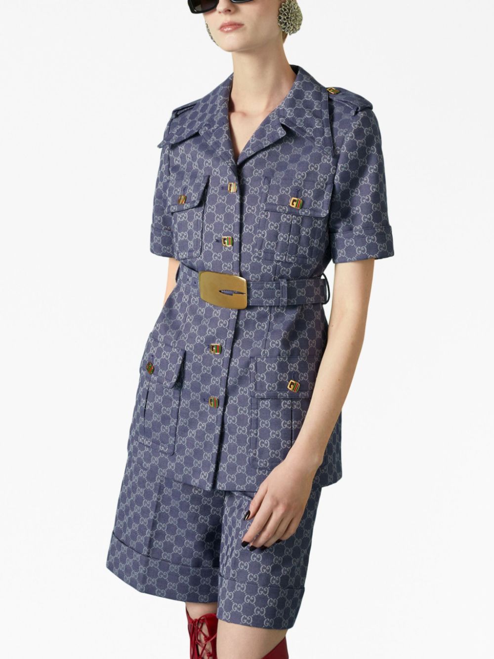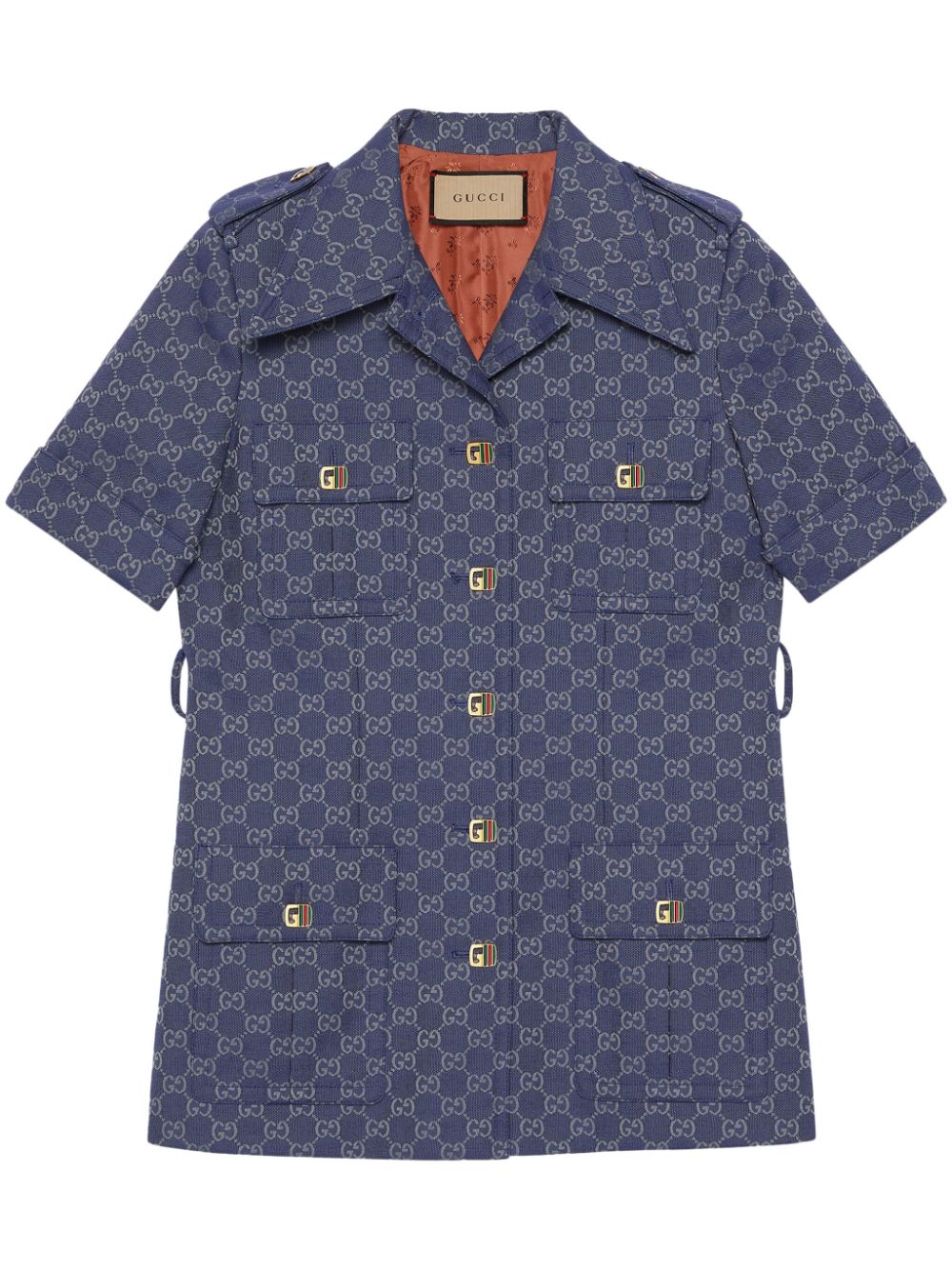 Double g shirt à manches courtes de Gucci avec bleu marine, mélange de coton, logo double G signature, boucles de ceinture, col en grève, taille ceinturée, attache de bouton avant, poches de poitrine à deux boutons, deux poches de volet avant, manches courtes, ourlet droit et la longueur des cuisses.