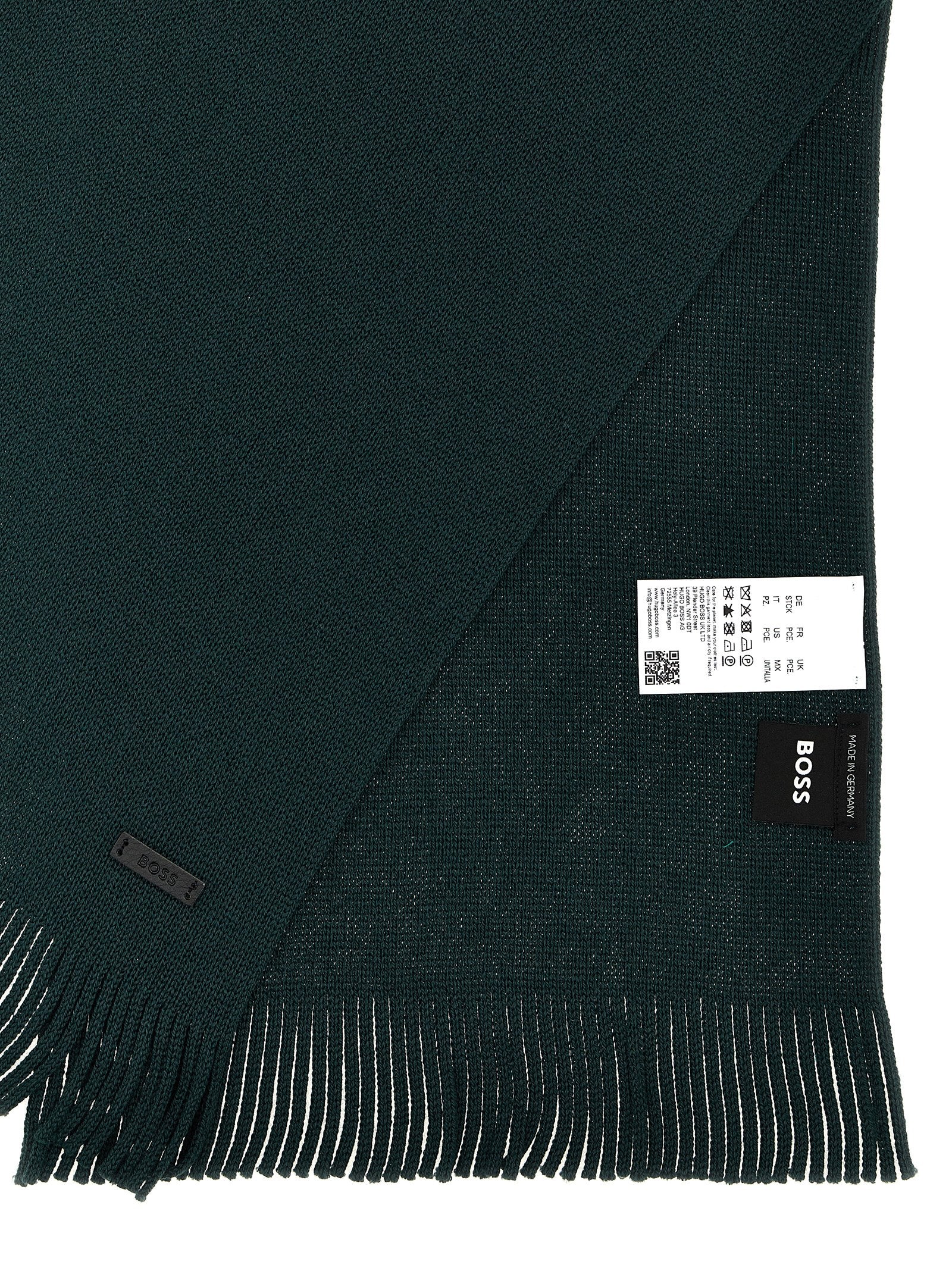Écharpe albas en laine vierge avec motif Raschel, patch de logo en cuir, bords à franges. Sustainable: Produit fabriqué avec de la laine dans des fermes responsables.