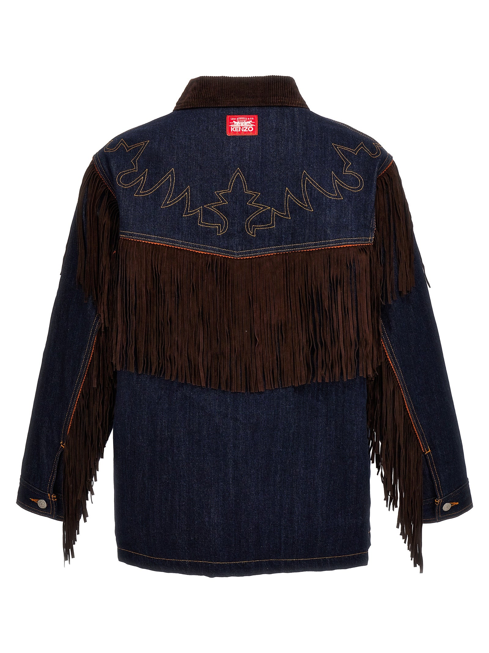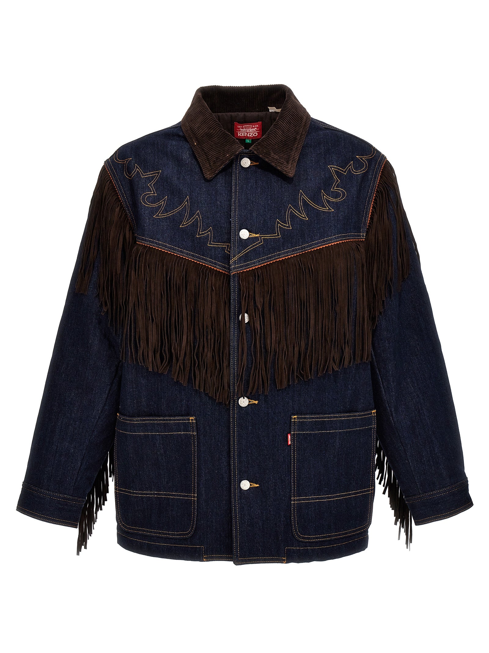 Veste Kenzo x Levi Strauss & Co. en denim en coton avec intérieur doublé et rembourré, franges en daim, broderie de contraste et couture, col en velours côtelé, poches, fermeture de bouton, manches longues.
