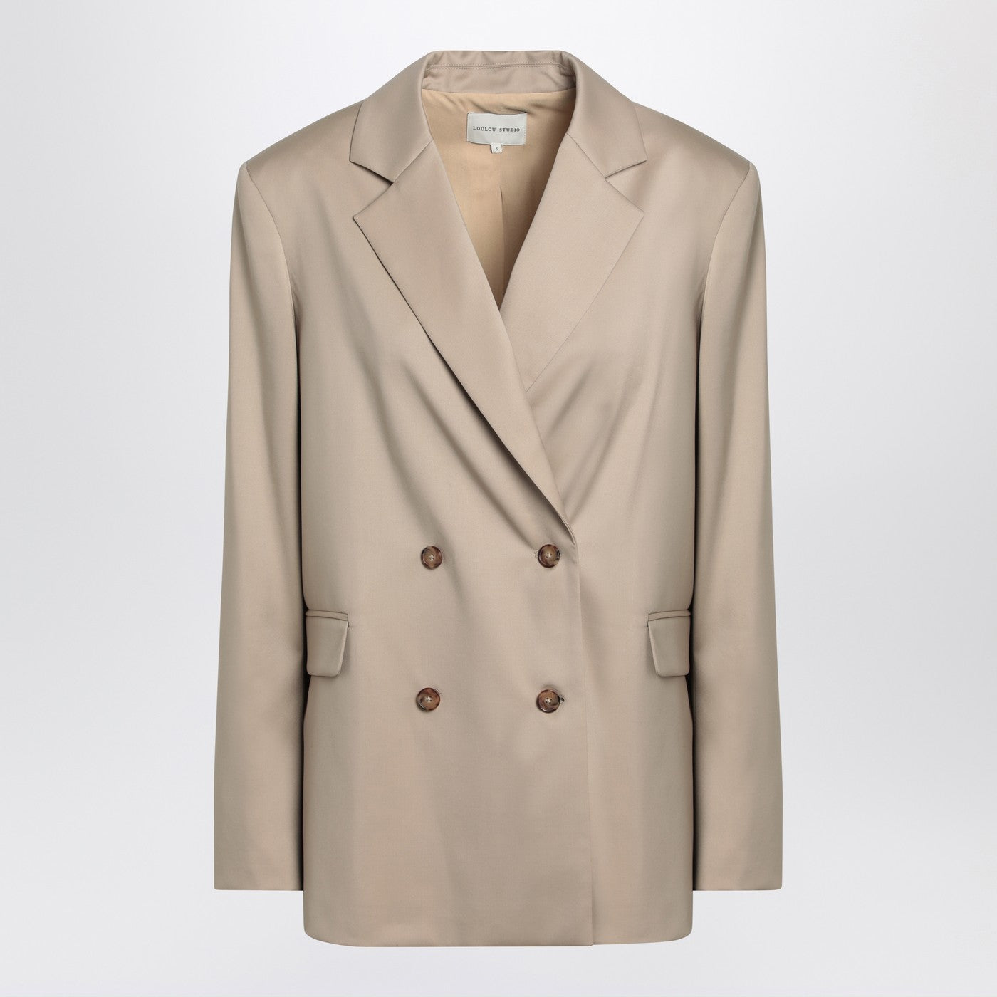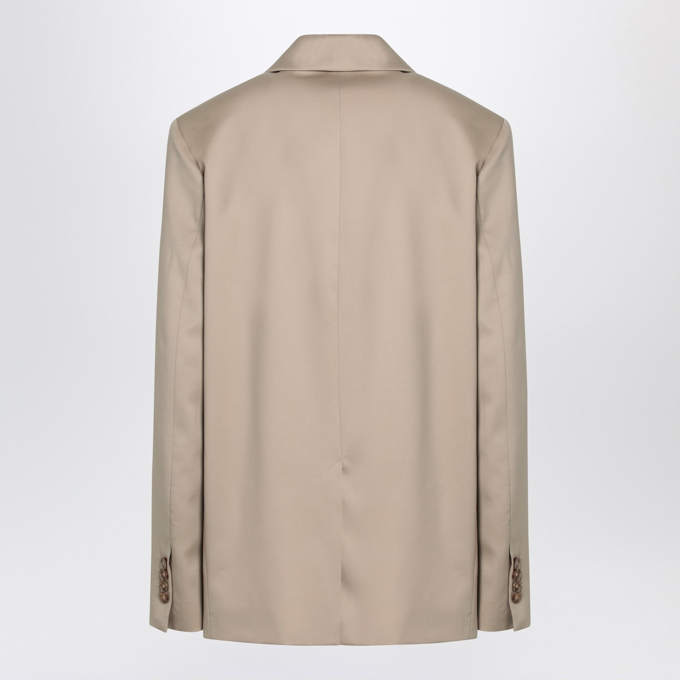Veste à double poitrine par Loulou Studio en laine vierge beige avec un col de revers, une placolet à bouton avant, des poches de volet latérales, des poignets boutonnés et un évent arrière central.