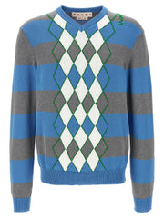 Striped cotton sweater with contrast inlaid 'Argyle' pattern on the front, Marni Symbol embroidery on the shoulder, V-neck, long cuffed sleeves.