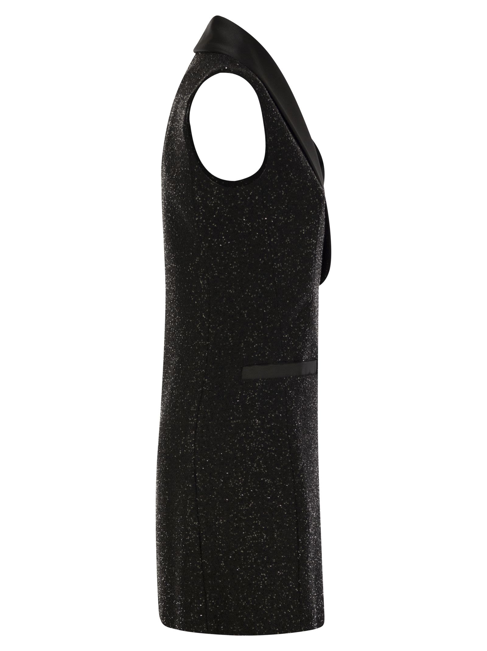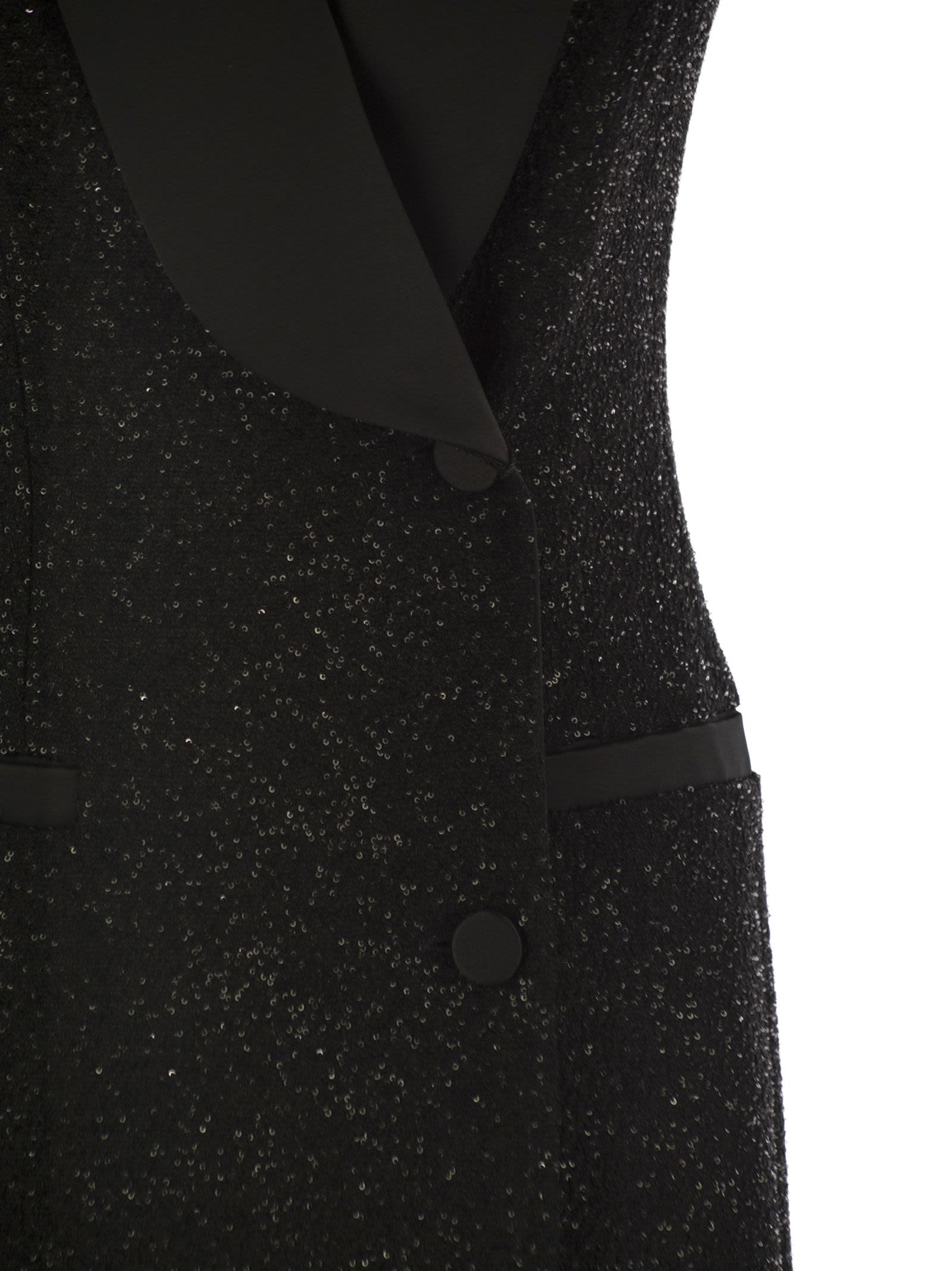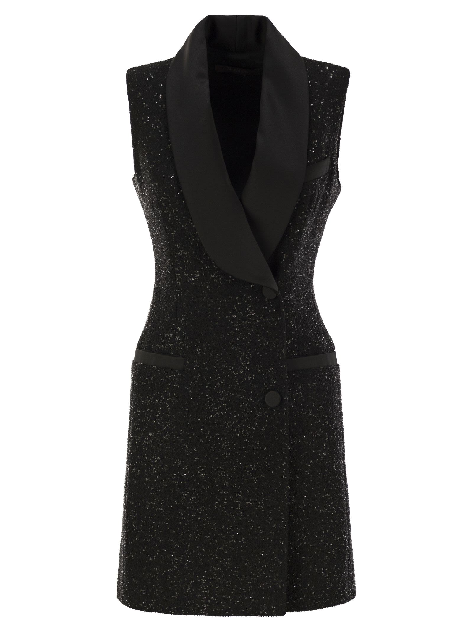Robe manteau à robe courte sans manches en satin de mélange en laine, travaillant avec des micro-paillettes de ton sur ton. Modèle doublé d'inspiration smoking, avec une silhouette de taille légèrement de forme avec col châle, poche de poitrine et poches de soudure en satin de ton sur les hanches. - Fermeture à double semestre avec boutons couverts - Sans manches - Collier de châle ID: 2421226094600 001