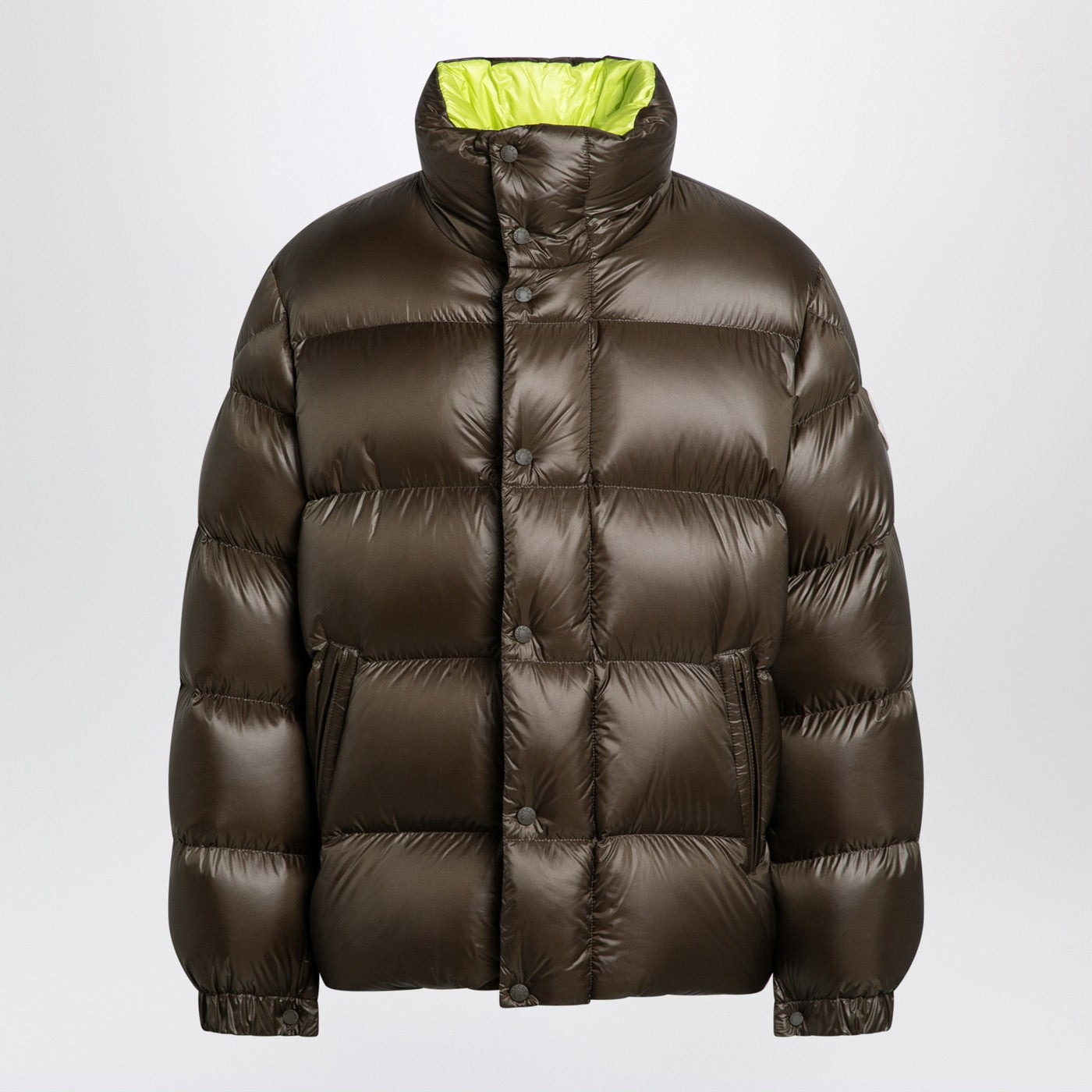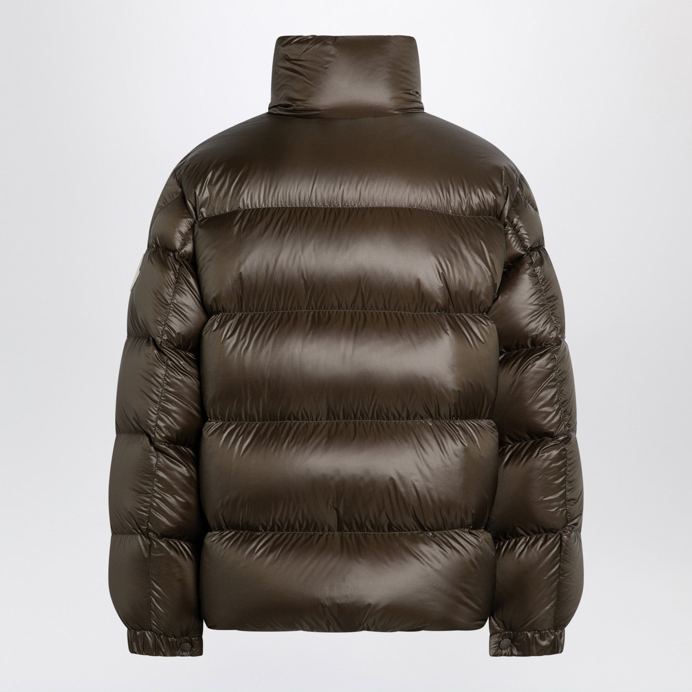Brown Laqué Nylon a rembourré la veste de Moncler avec une attache de fermeture à fermeture éclair et de presse, un col haut, deux poches zippées à l'avant, un intérieur contrasté, des manches longues avec un petit patch de logo et des poignets élastiques avec un goujon de presse.