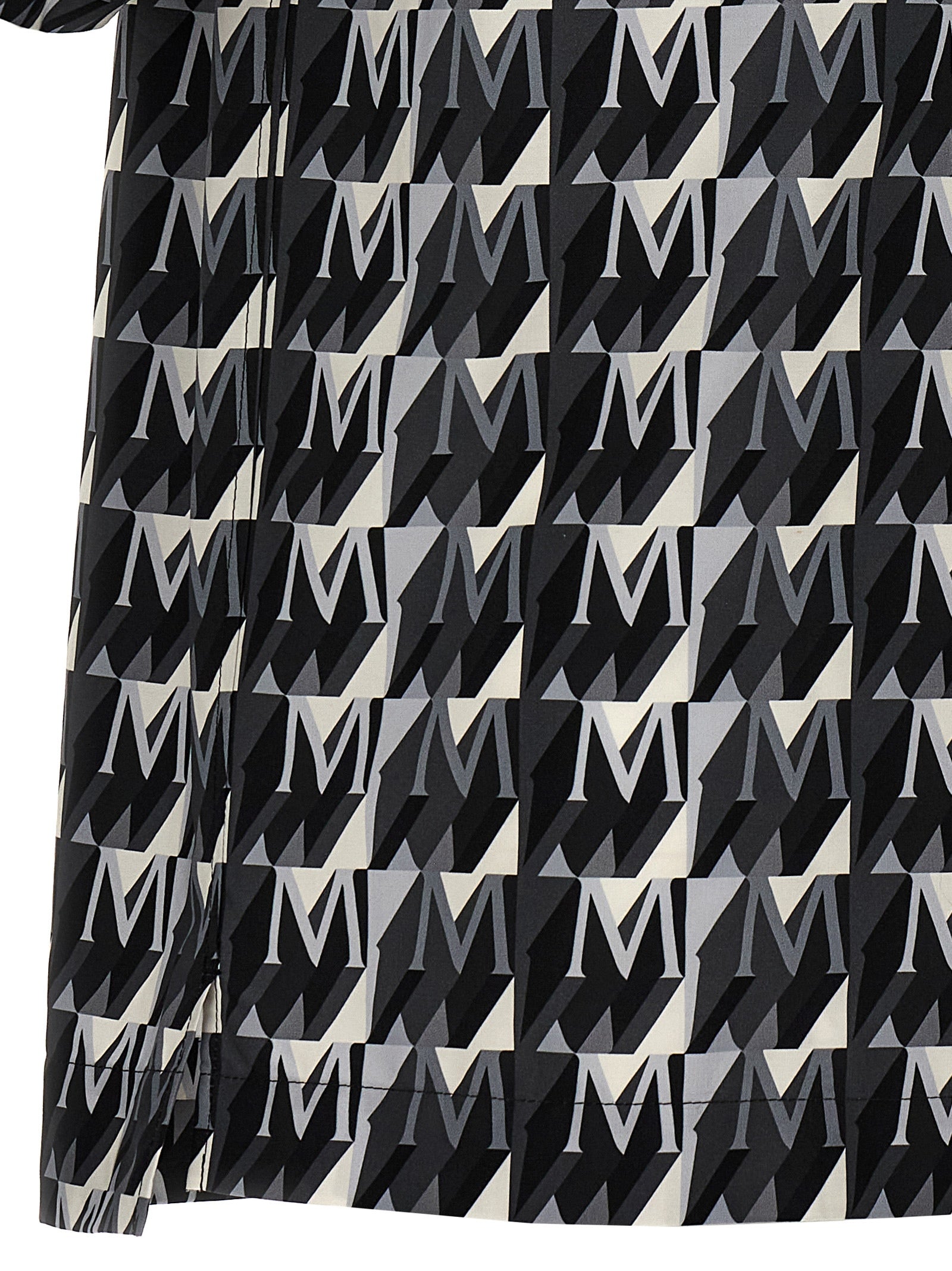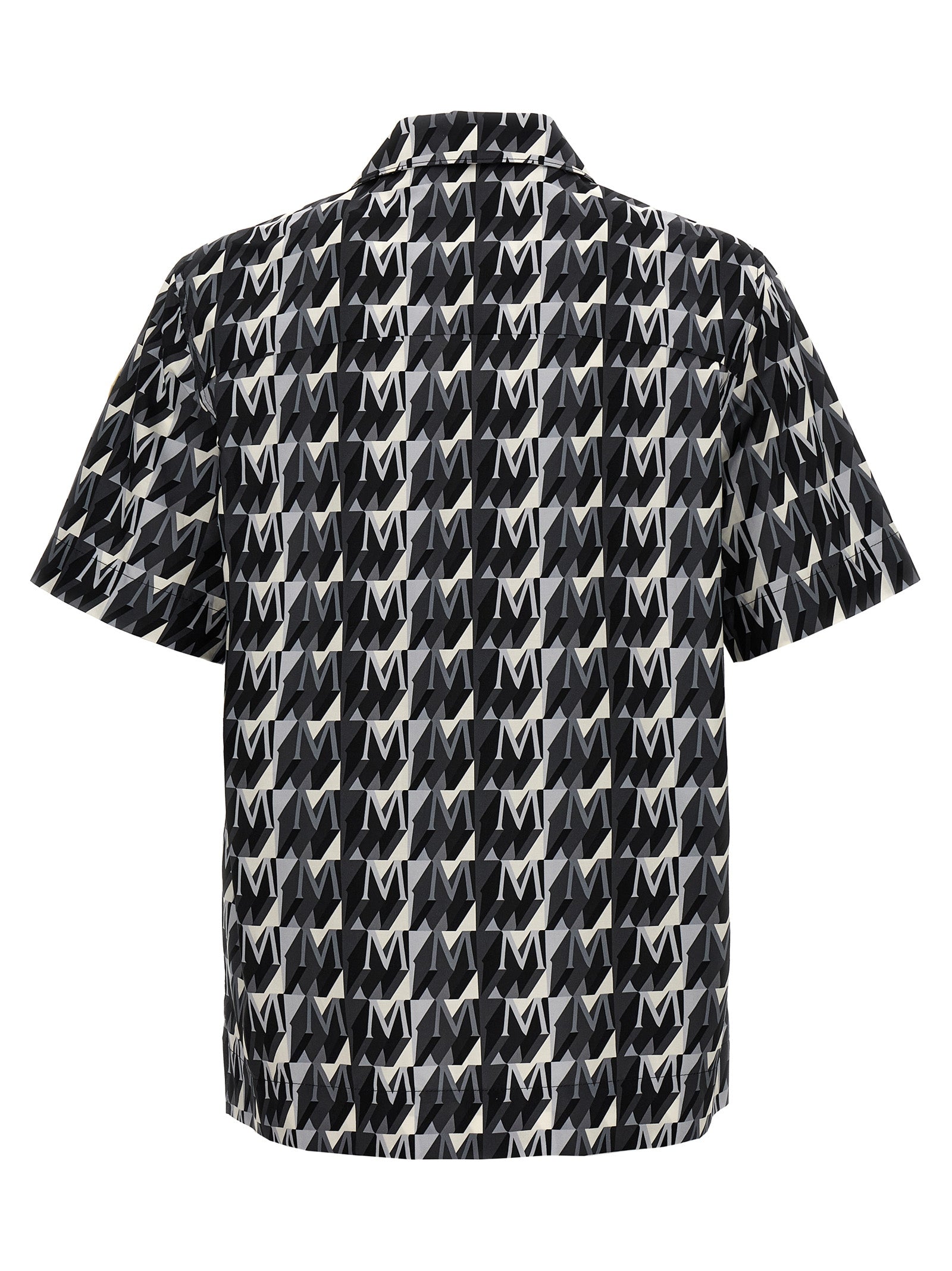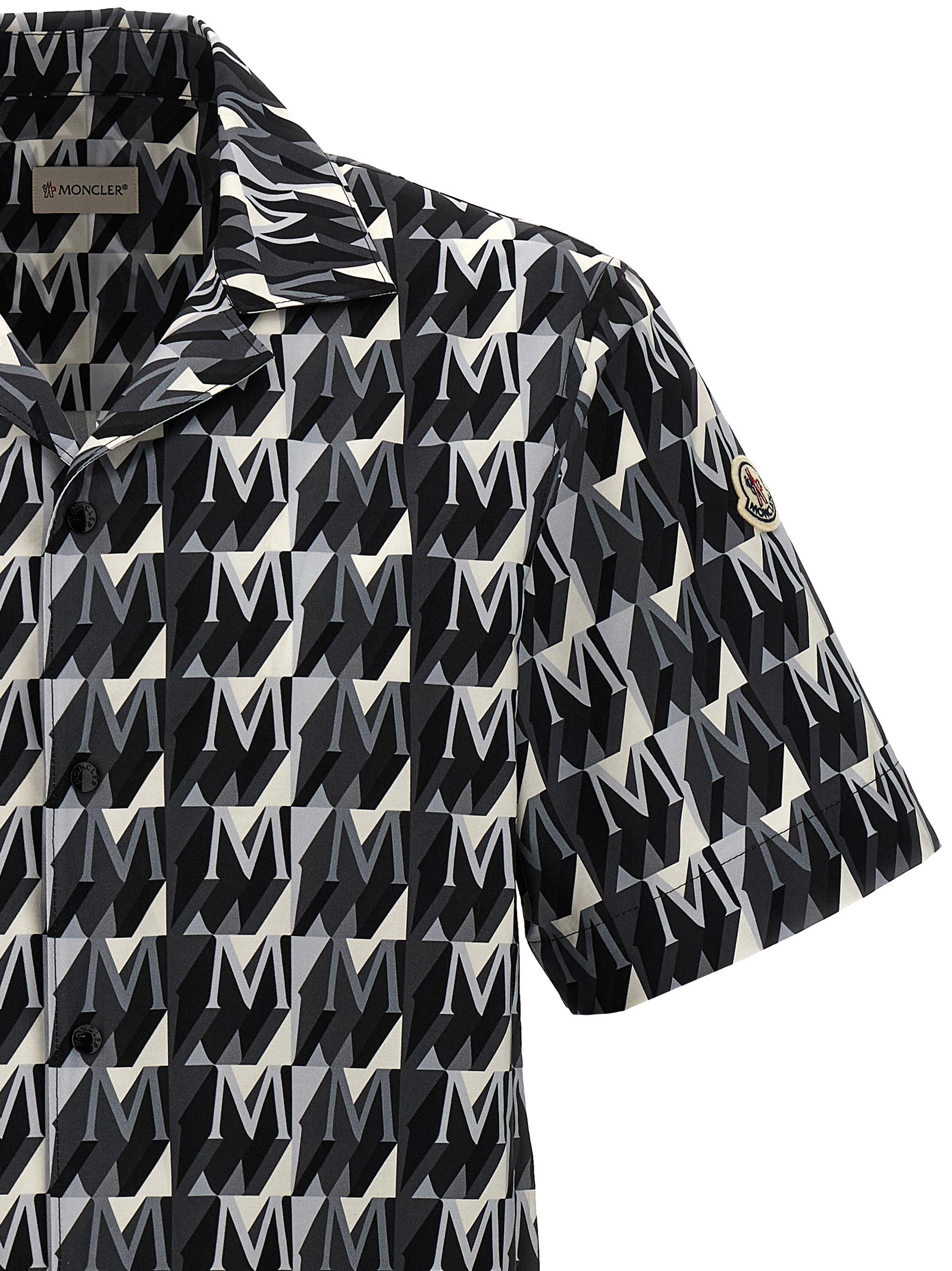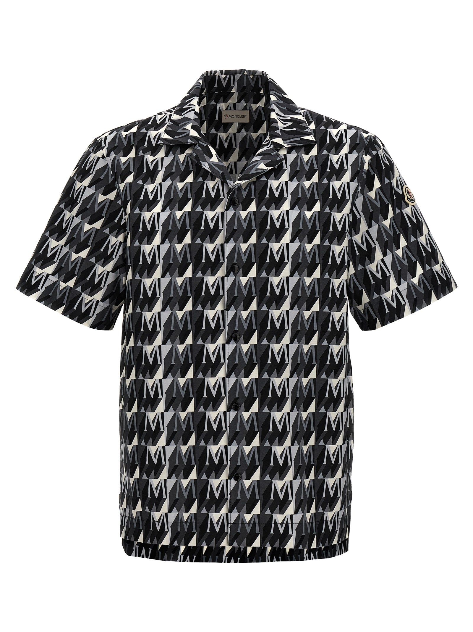 Chemise en coton à imprimé logo entièrement, manches courtes, patch de logo latéral, fermeture de bouton-instant avant, fentes latérales.