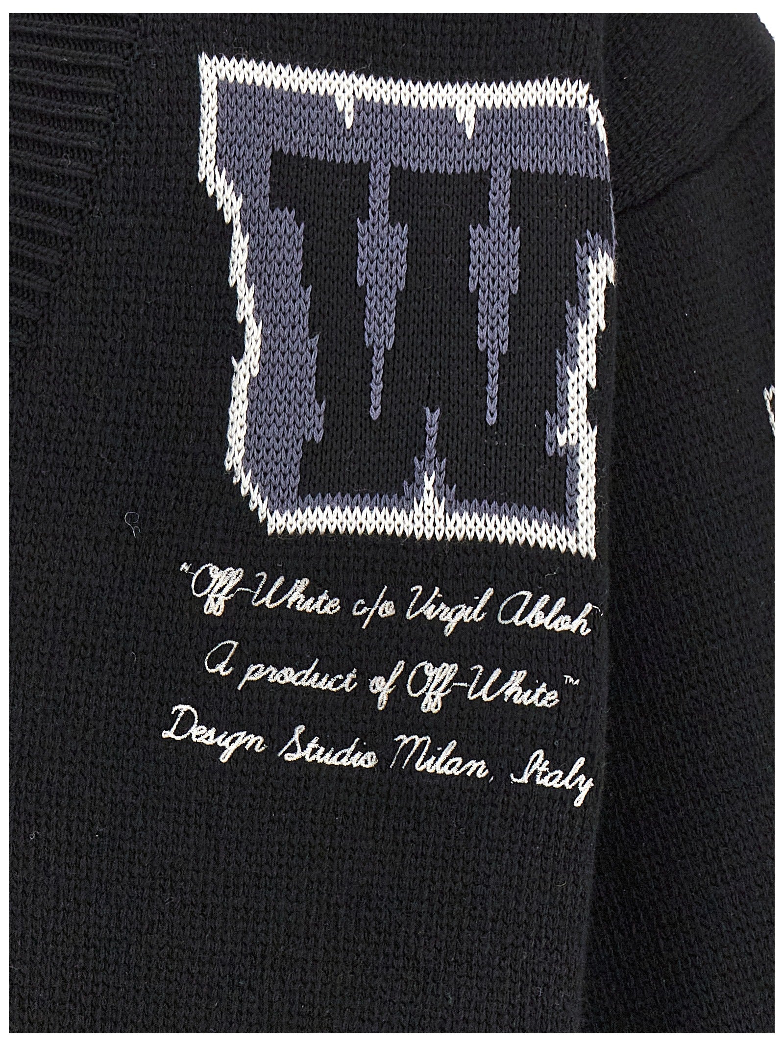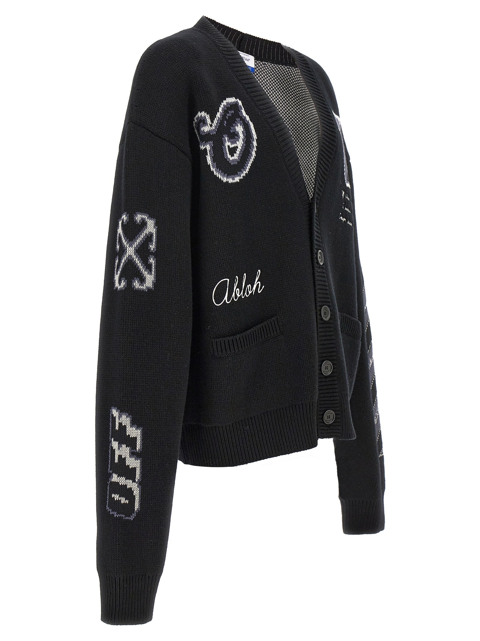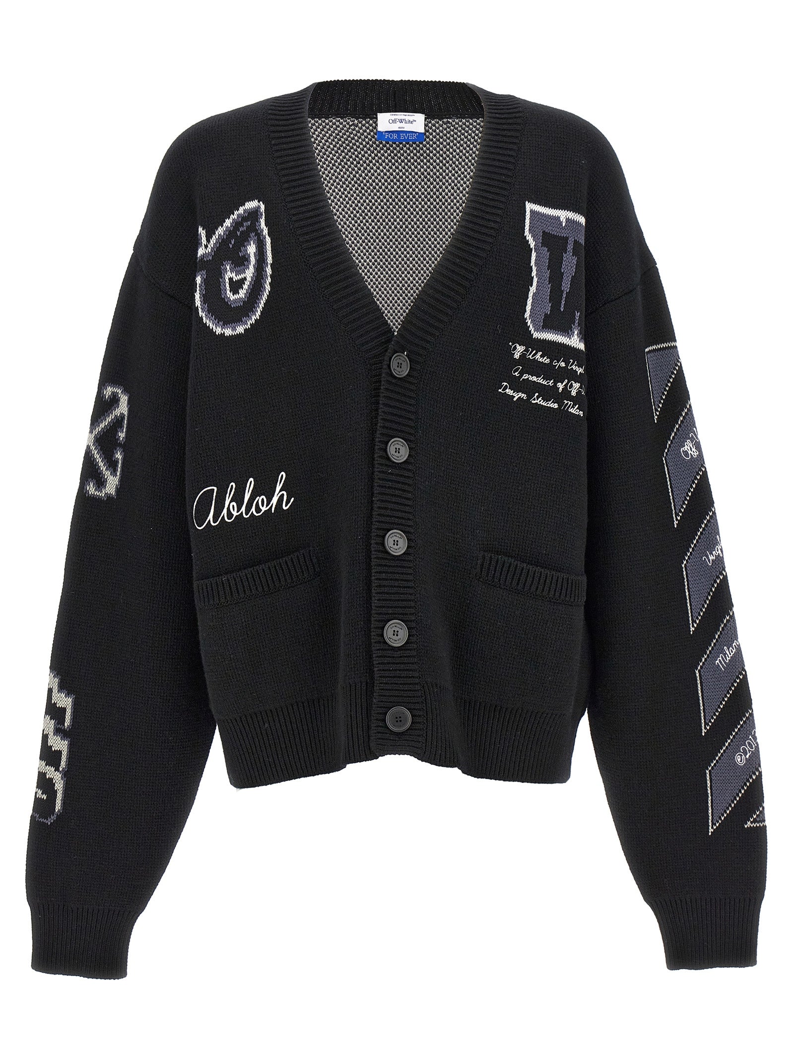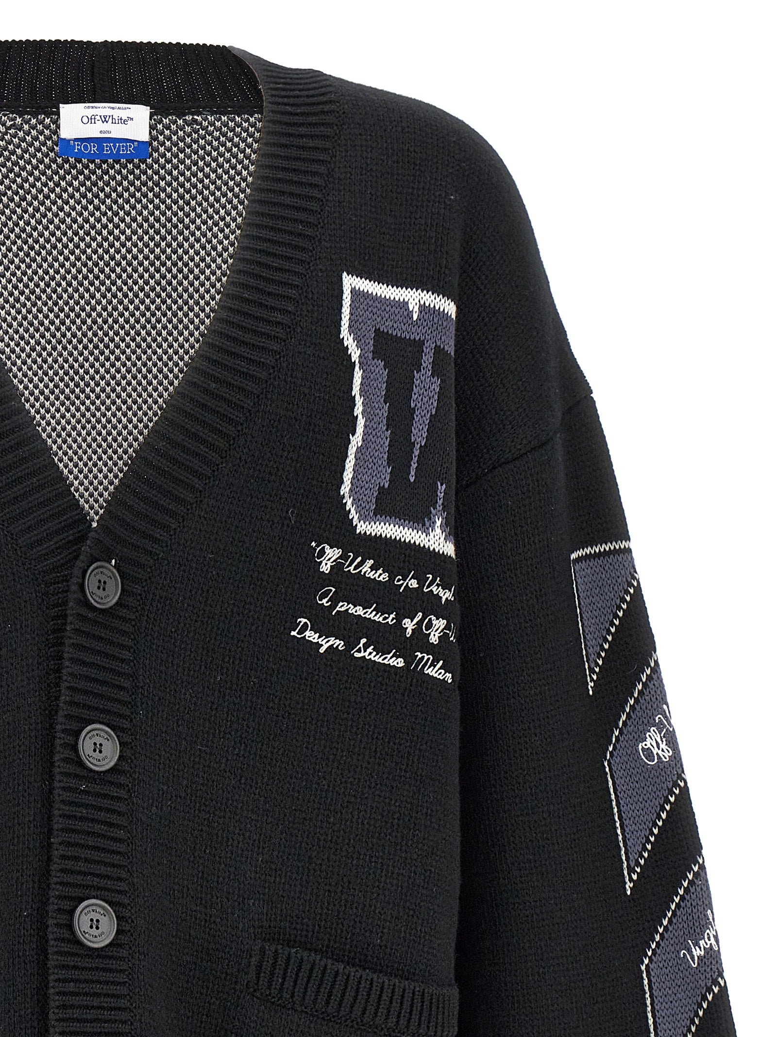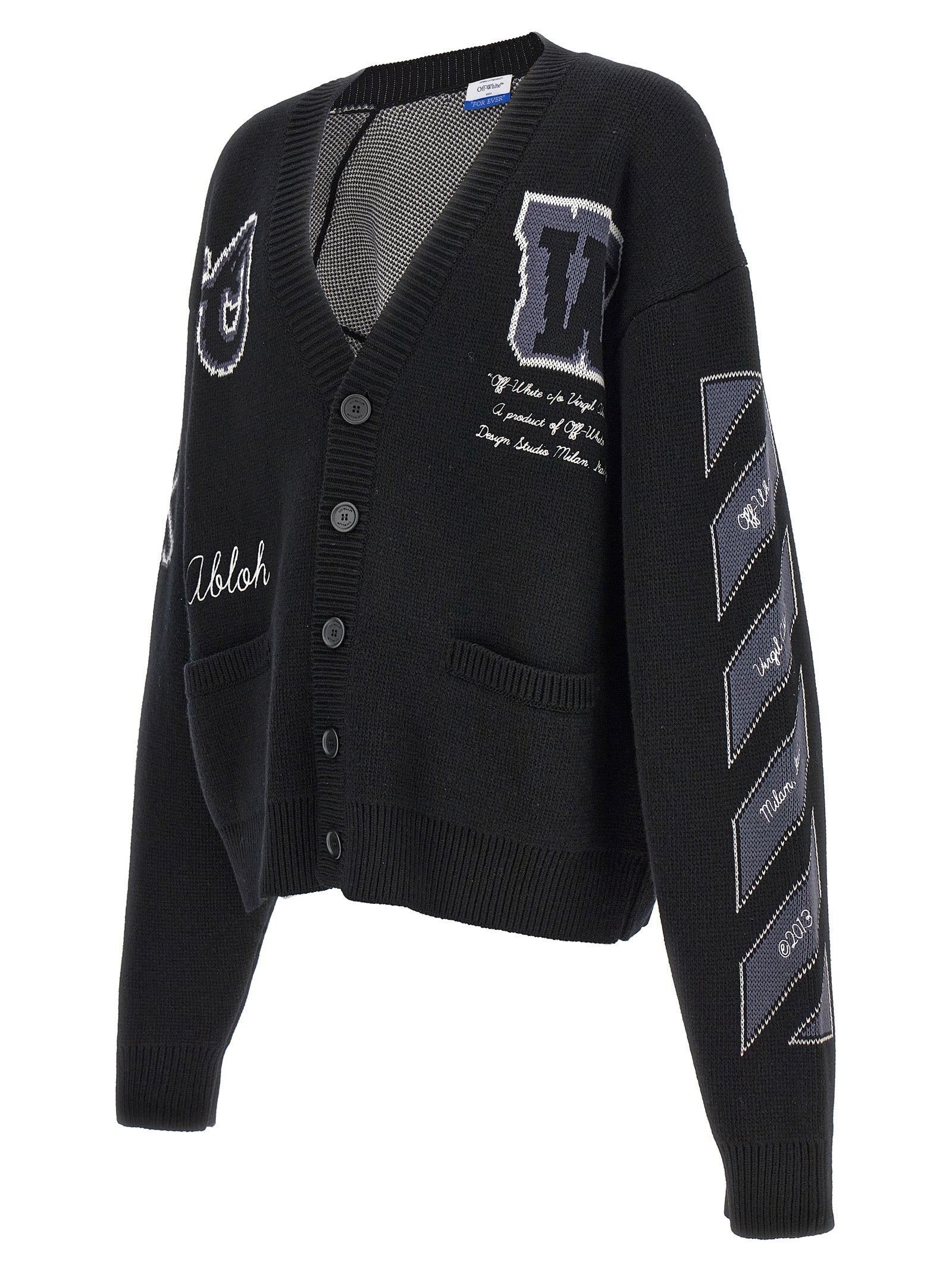 Cardigan de mélange de laine «universitaire» avec broderie et motifs Jacquard, poches, fermeture de bouton, manches à remise à long terme.