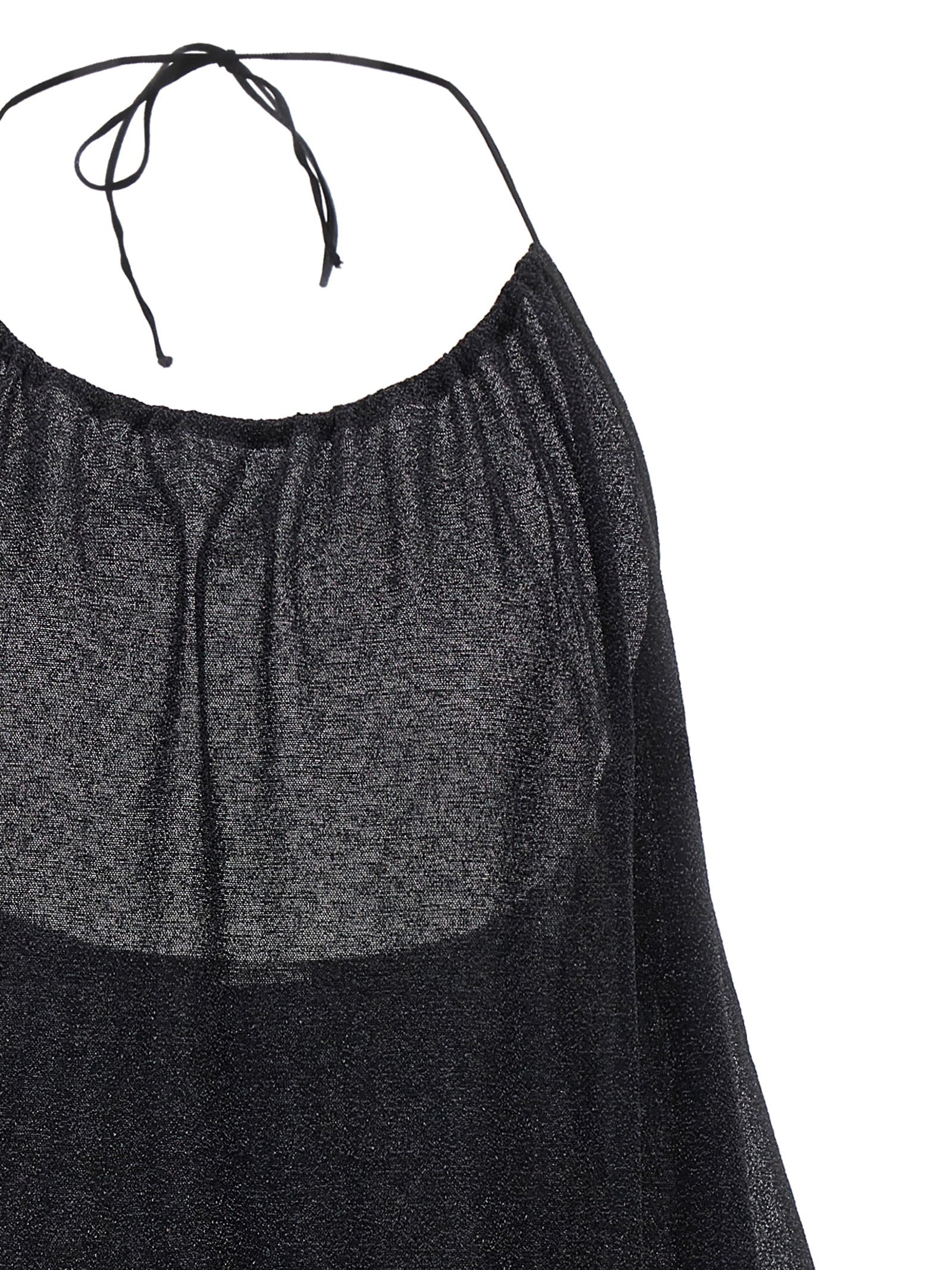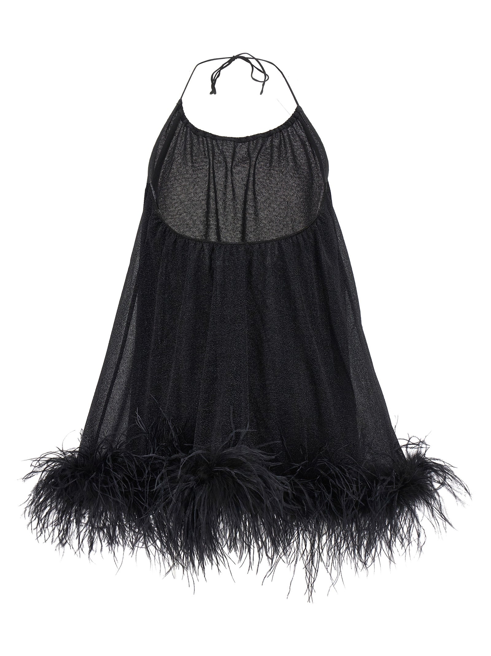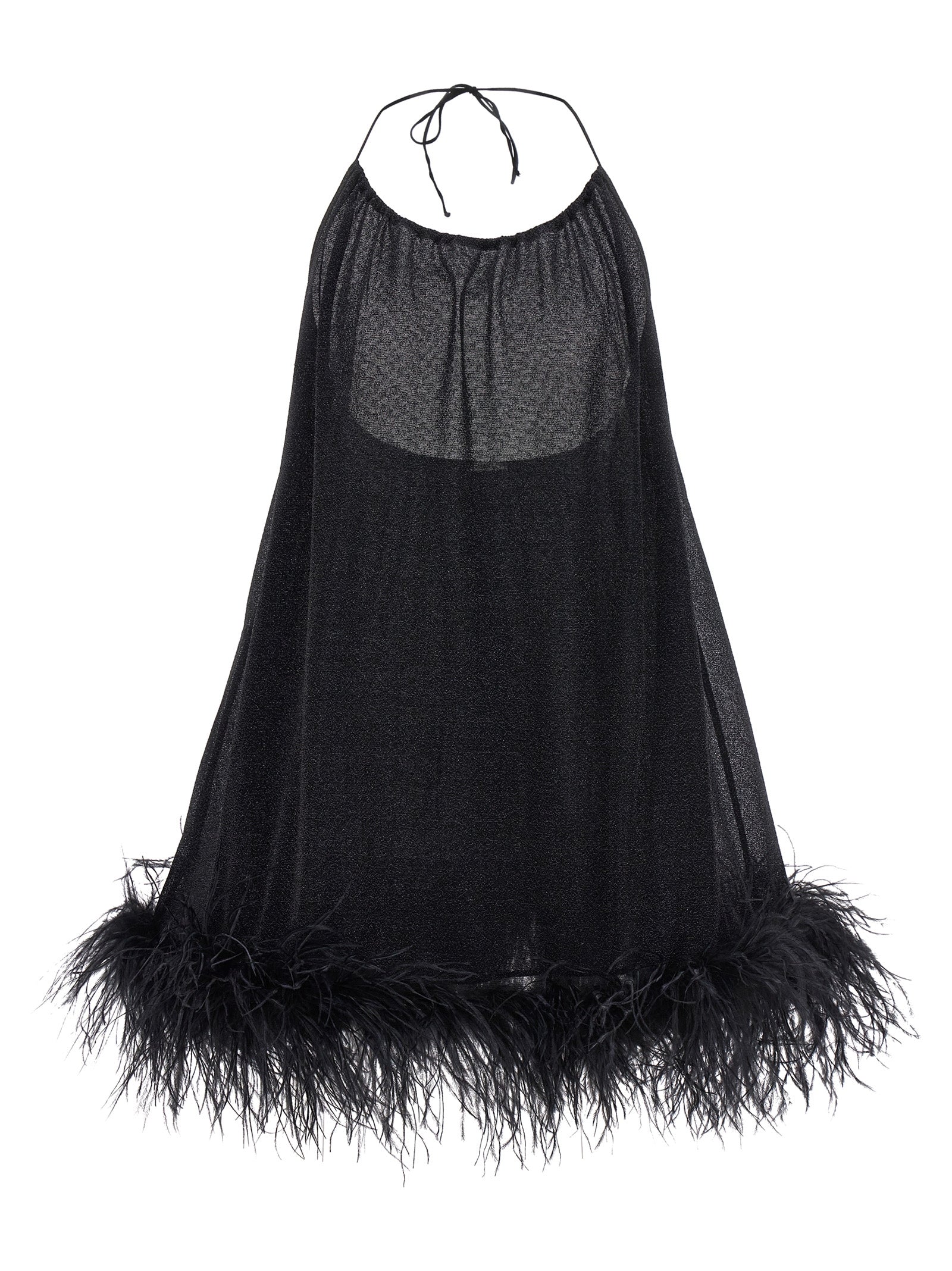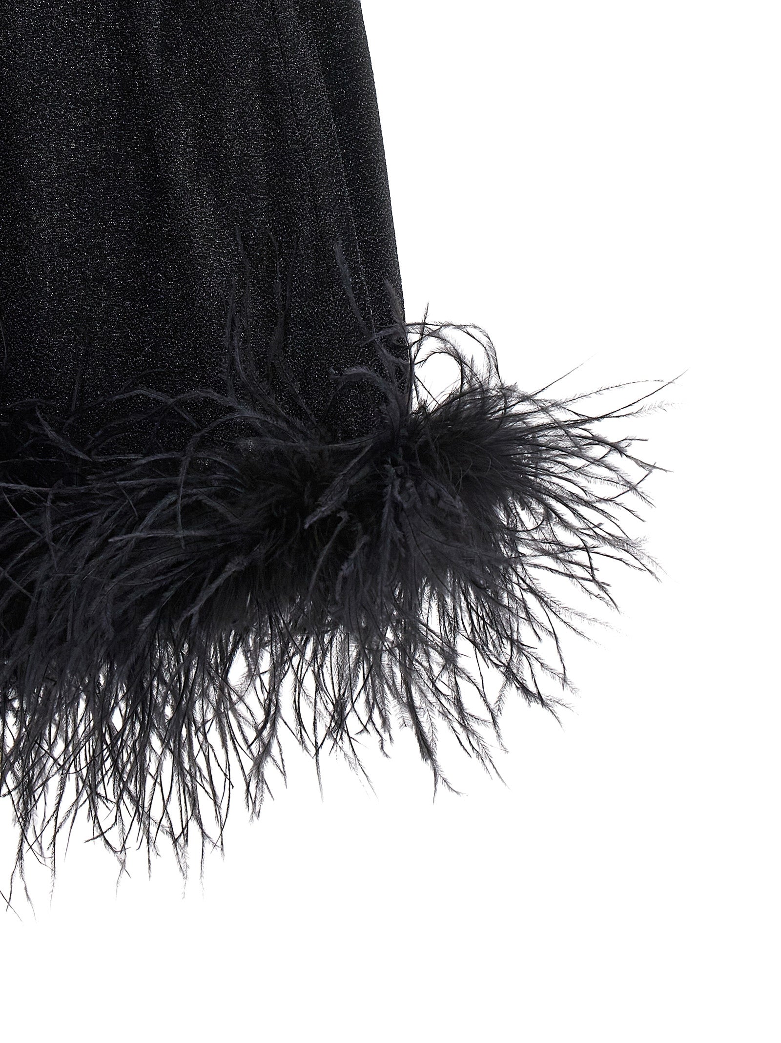 Robe de Lumiere Plumage sans manches en tissu Lurex avec laçage au cou, application de plumes sur l'ourlet.