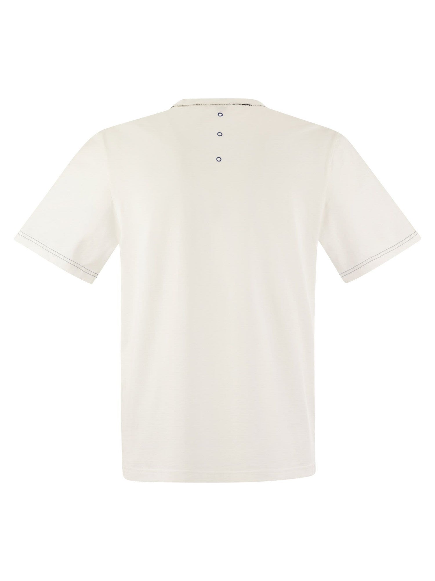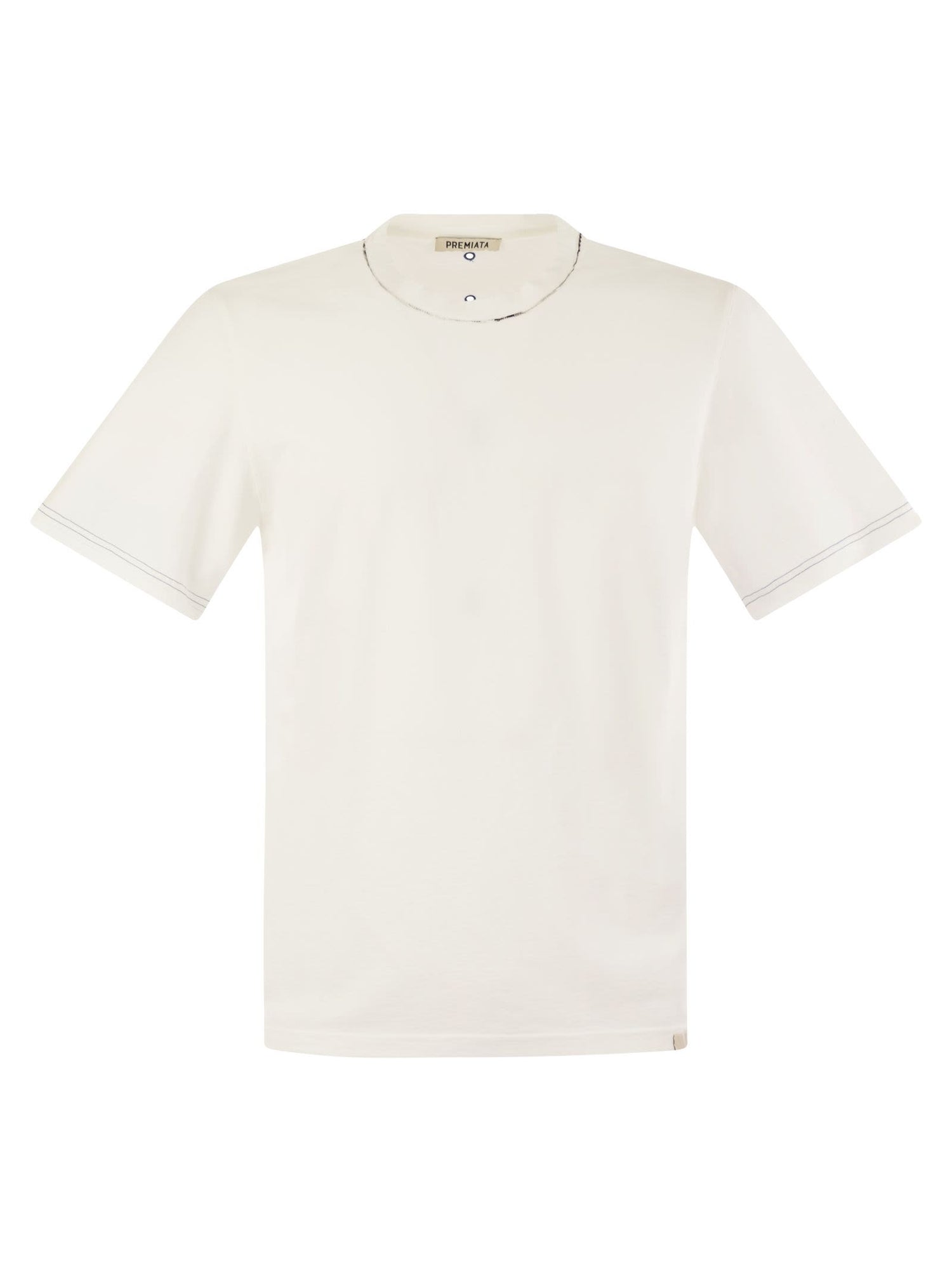 T-shirt en maillot de coton masculin, ajustement régulier et motif en trois trous dans la broderie Brodé «Blu Premiata» sous le décolleté arrière. - Étiquette de drape