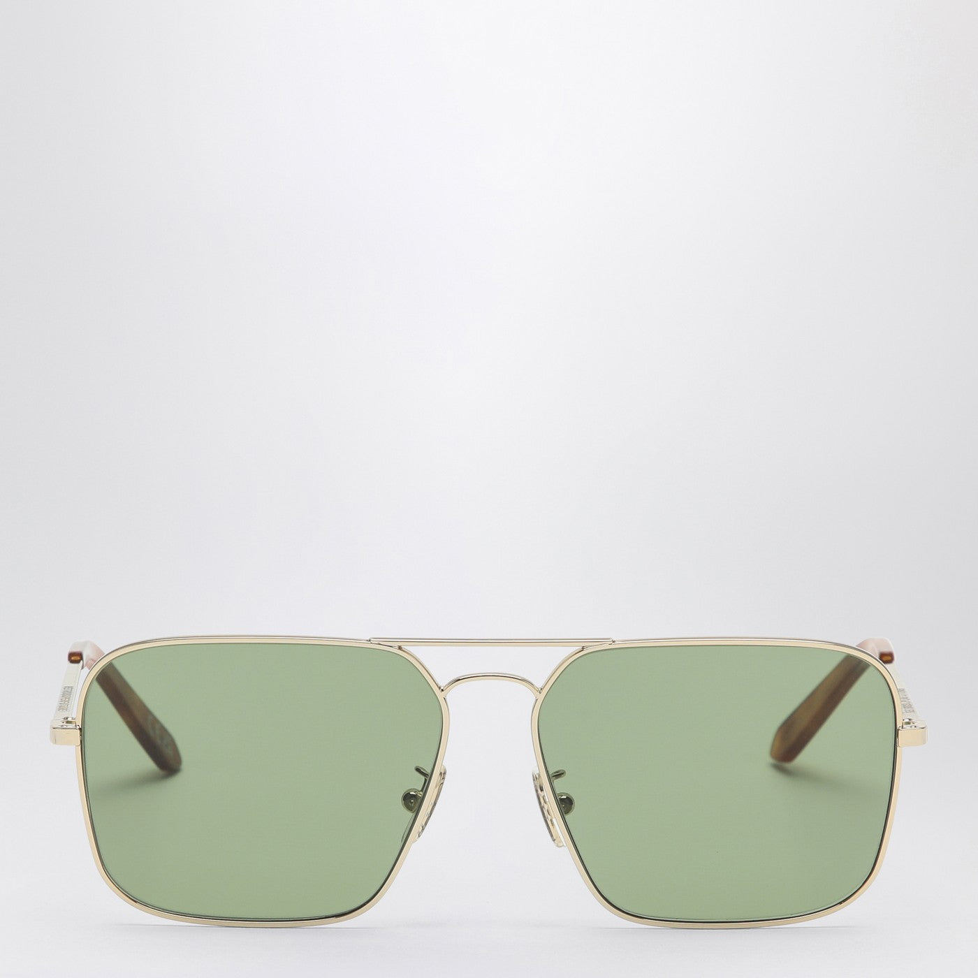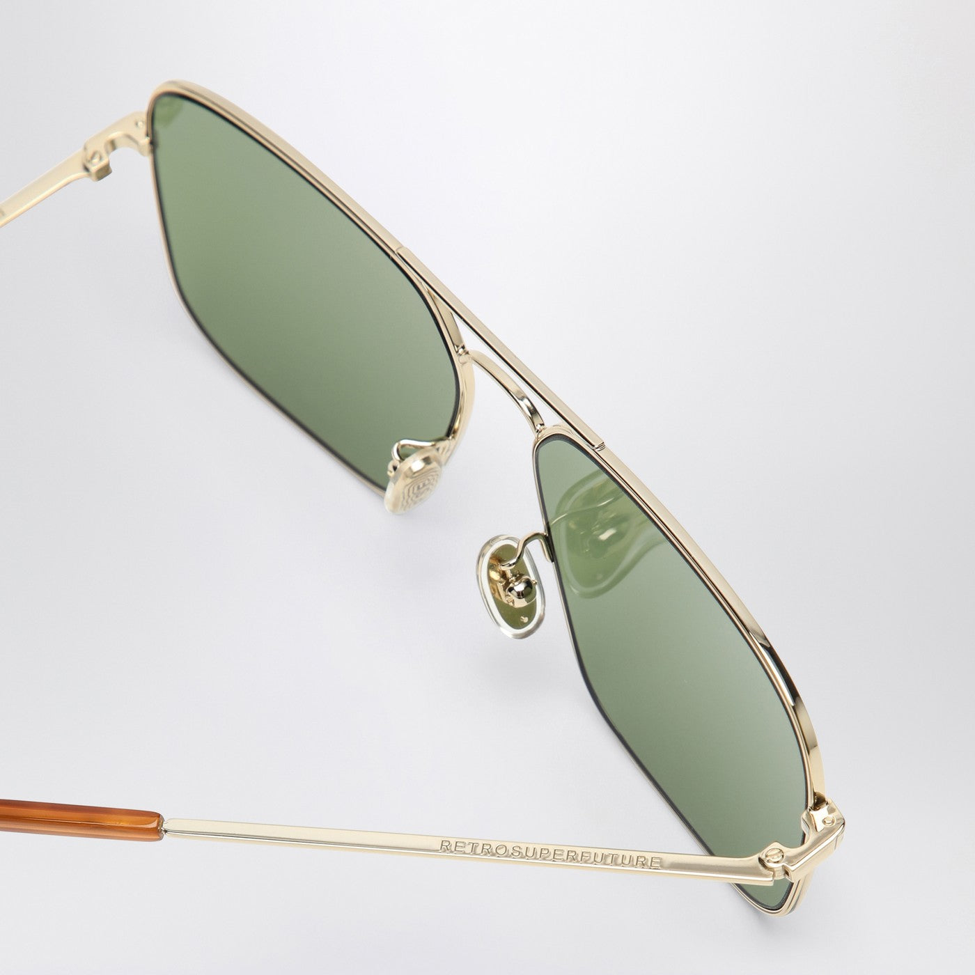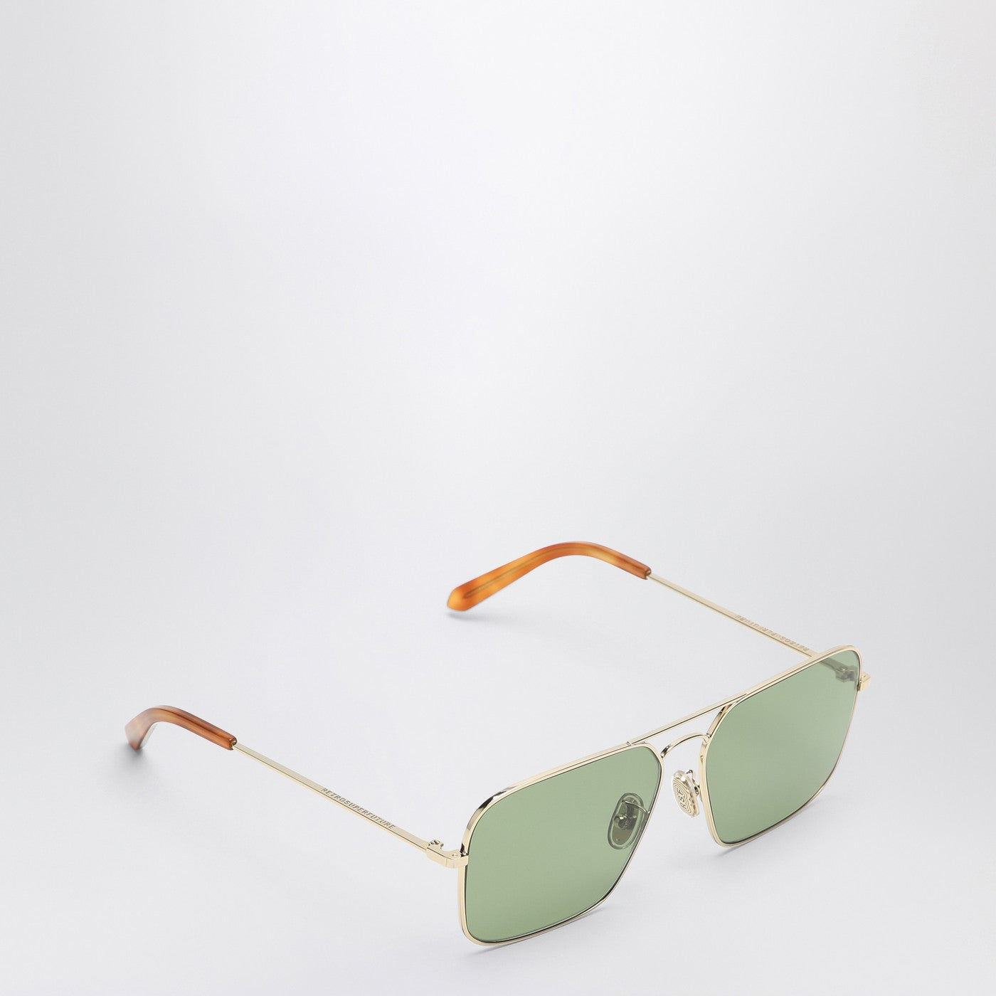 Lunettes de soleil par rétrosuperfuture avec cadre en métal doré, lentilles vertes de bouteille, pointes de temple acétate de La Havane et logo gravé sur les temples.