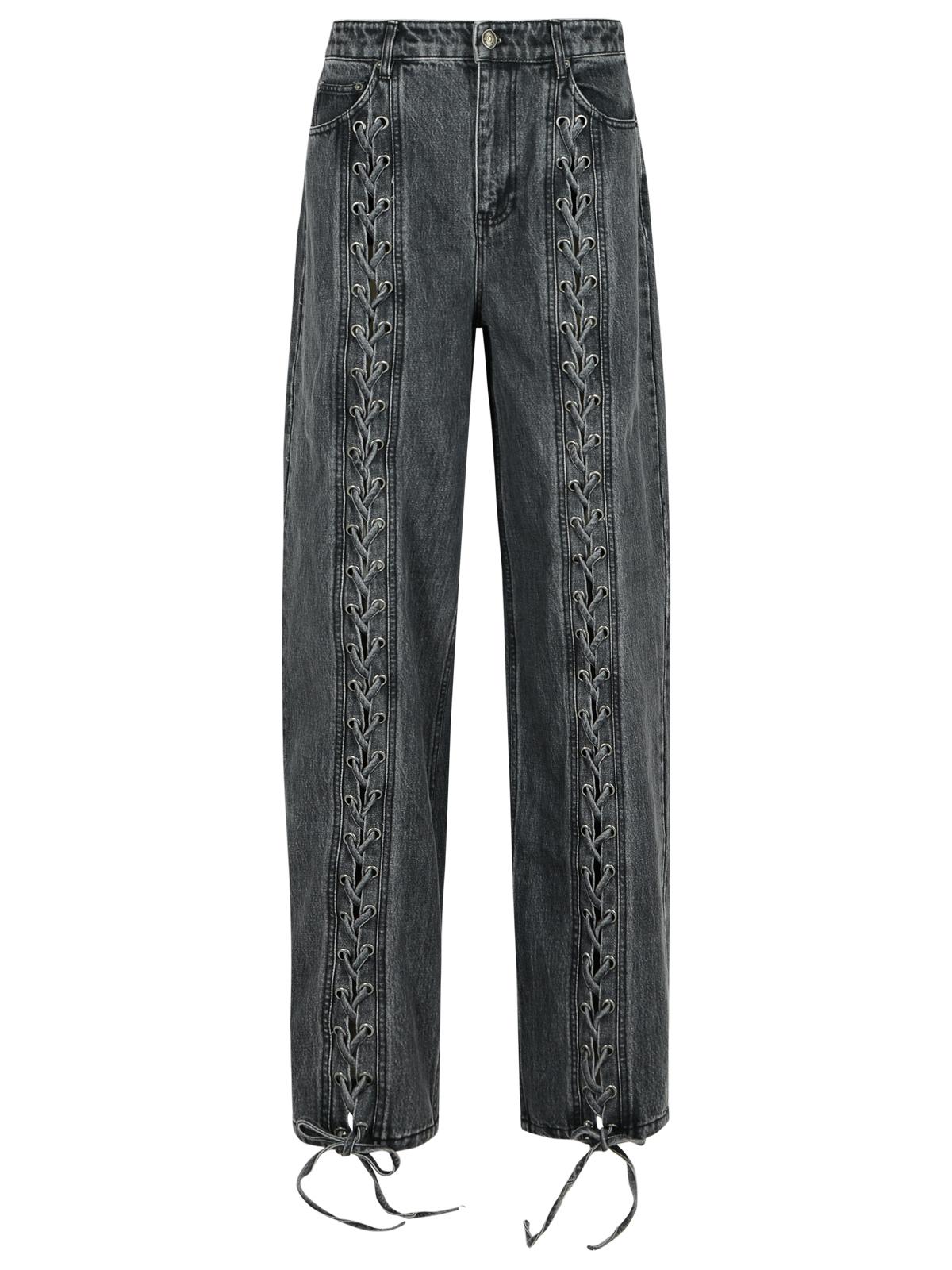 Taille haute, jambe droite, lacets avant avec œillets en métal tout au long de la jambe, ourlet à crampons réglable, fermeture de bouton et zip caché, cinq poches