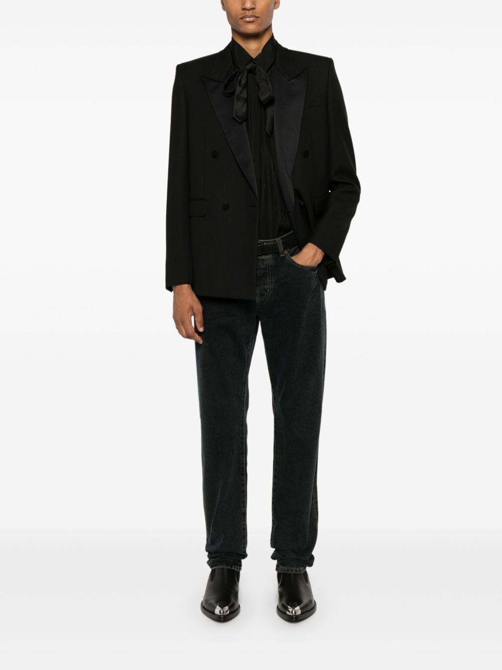 Chemise en soie à imprimé logo de Saint Laurent avec noir, soie, imprimé de logo entièrement, attache de bouton avant, col classique, manches longues et ourlet droit.