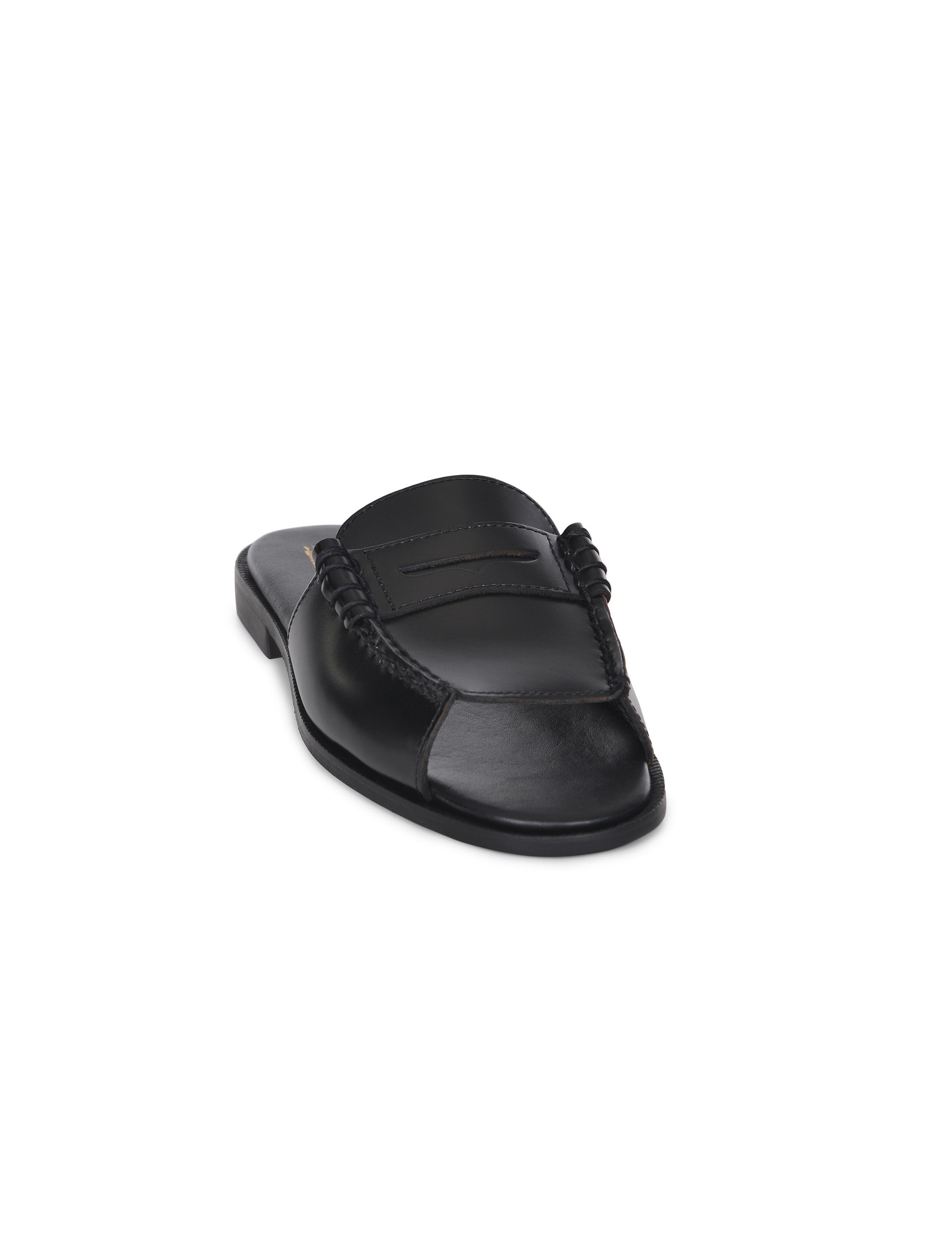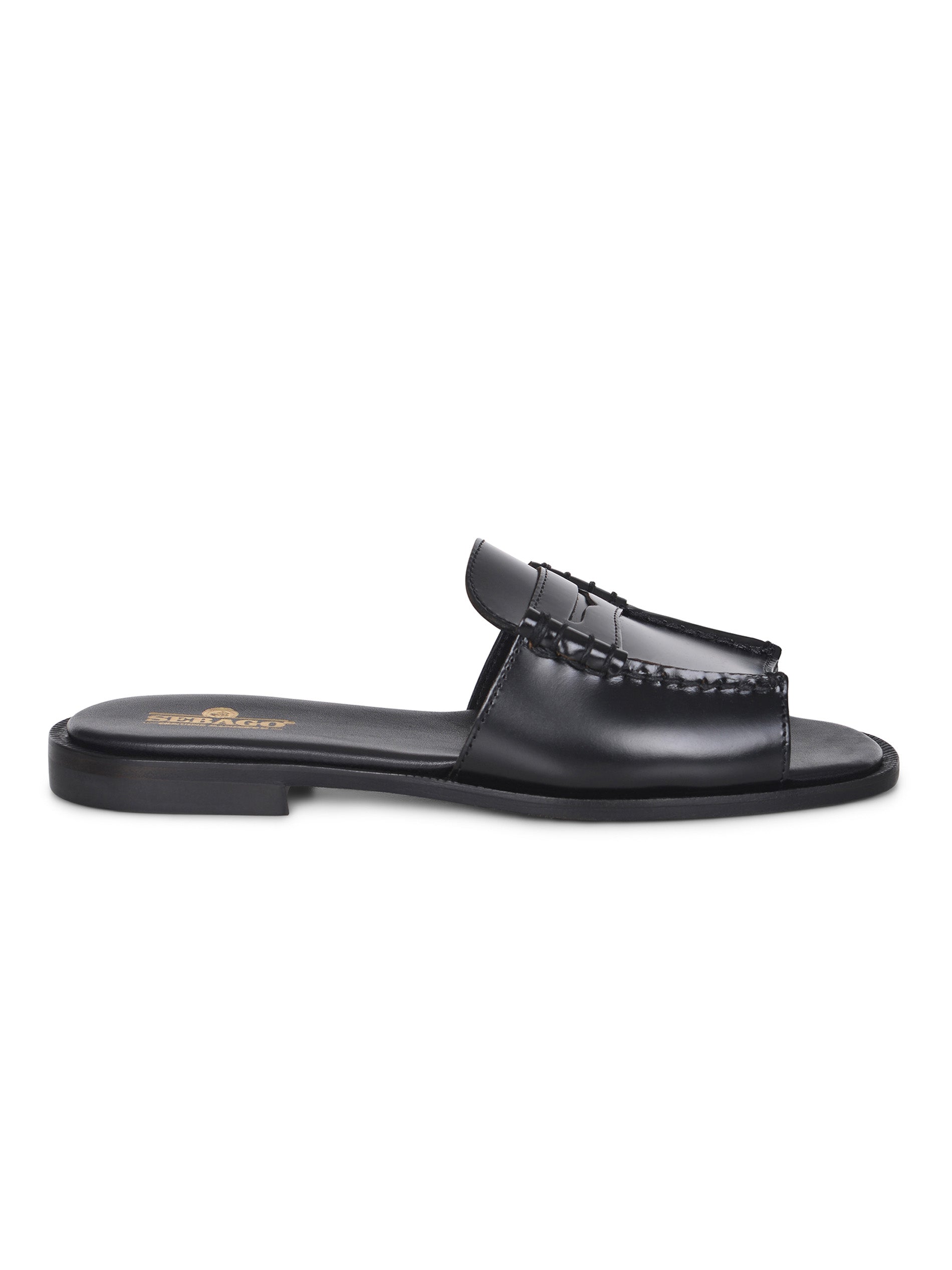 Sandales "Dan Slide" en cuir noir. Masque. Ouvert à l'avant. Sole intérieure intérieure en cuir. Semelle fine en cuir naturel. Talon moulé dans le caoutchouc. Semelle 90% en cuir, 10% en caoutchouc 100% cuir.