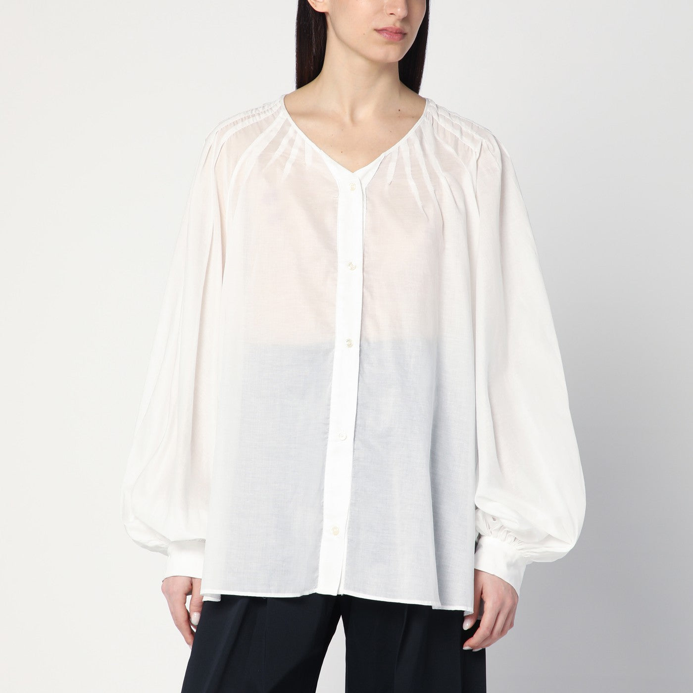 La dernière chemise dans le mélange de coton blanc, caractérisé par un col en V, de larges manches à ballon long avec des poignets boutonnés, un design semi-transparent, un bouton avant et un pliage sur le décolleté.