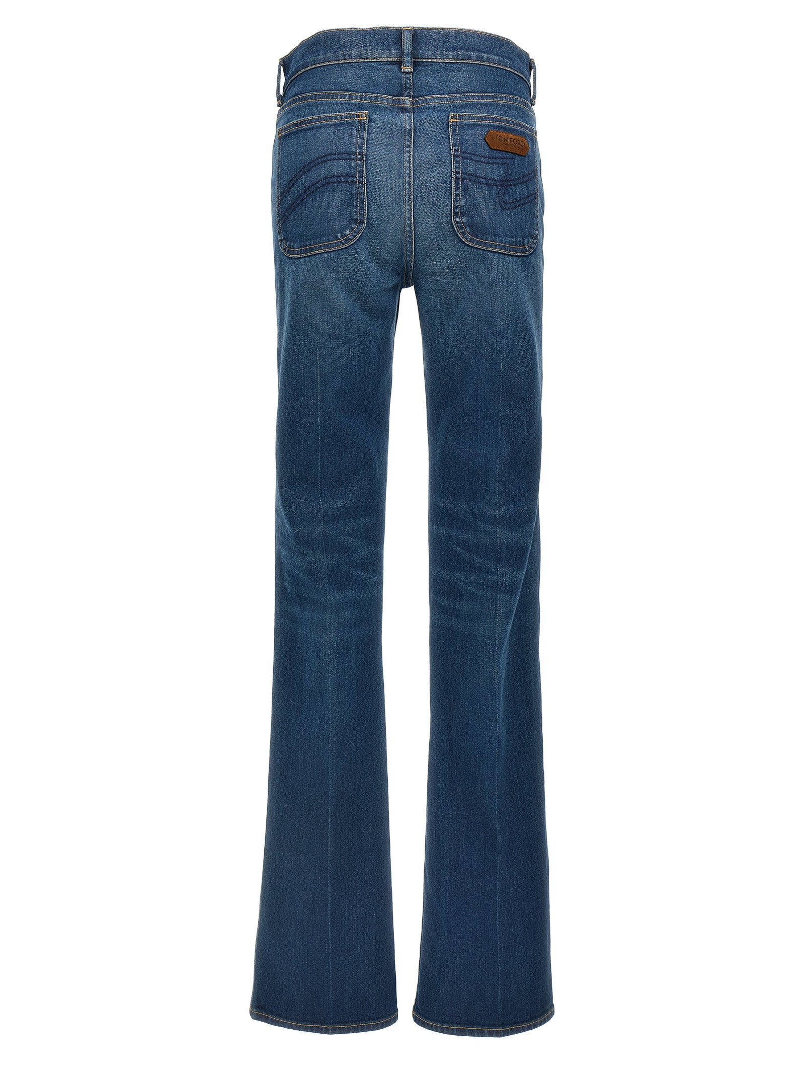 «Flare en jean lavé en pierre» Jeans en denim en coton en pierre légèrement lavé, jambe évasée, fermeture éclair et bouton, poches, étiquette de logo en daim arrière.