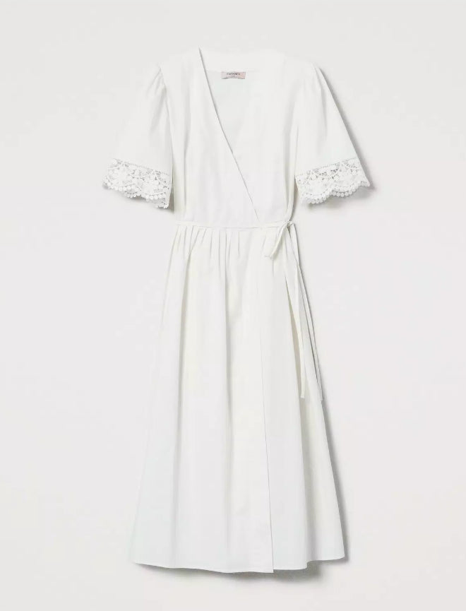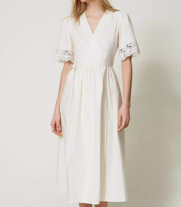 Robe Longuette de la popline en coton extensible avec une garniture macramé festonnée en bas des manches. Il a une ligne de col en V, une fermeture de croisement avec des liens en tissu, des manches courtes rassemblées sur les bords, une taille avec une jupe rassemblée, une plaque de logo t ovale à l'arrière, sans doublure, un ajustement doux.