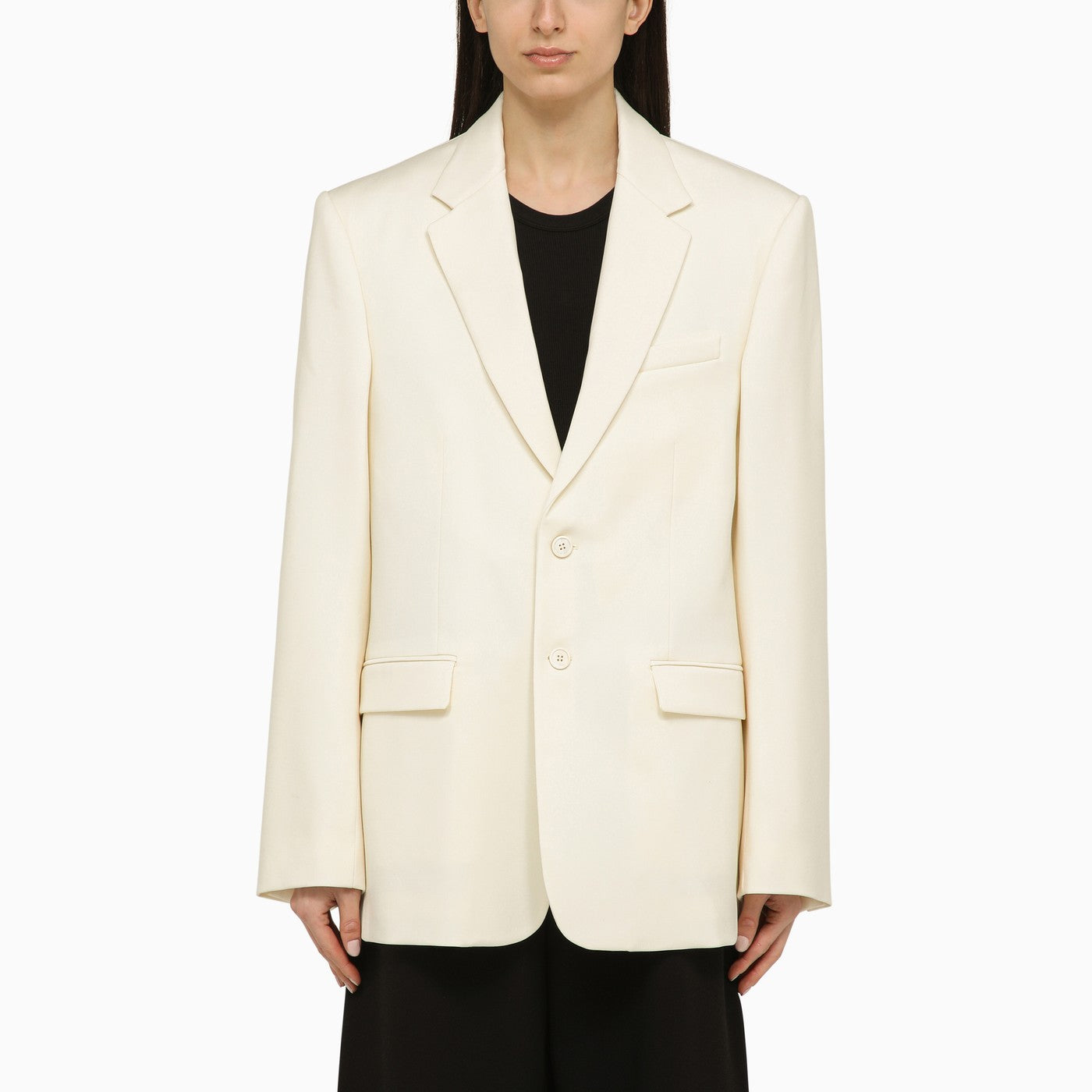 Veste à poitrine simple en laine vierge blanche de Wardrobe.NYC avec des revers classiques, des manches longues à bouton, deux poches de rabat avant, une poche de welt sur la poitrine et un double évent arrière.