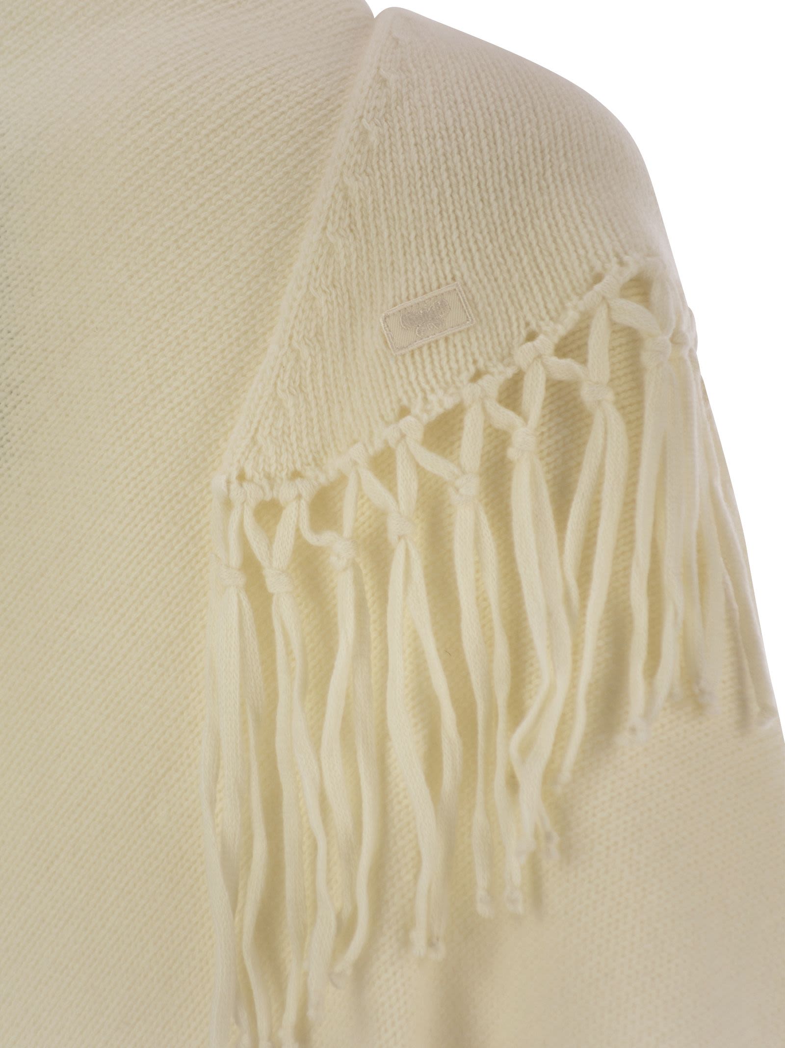 Châle de triangle en fil de laine pure fin, avec motif frangé aux deux extrémités. Personnalisé avec un étiquette de logo papillon brodé de ton dans le ton. - Adges à franges - Forme triangulaire - Tone sur tonière ID de concepteur de logo: 2425746025600 001
