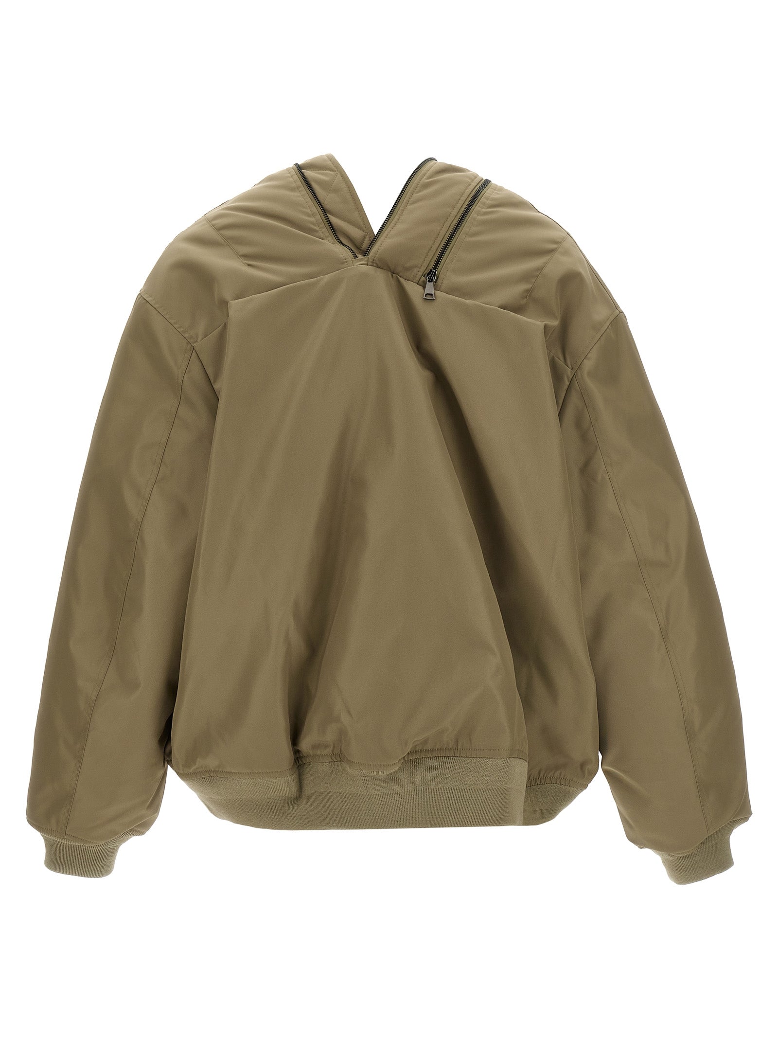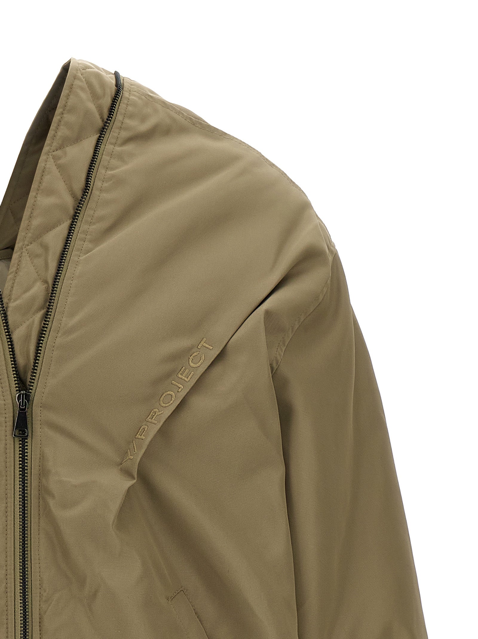 Veste en tissu rembourré «double zip pincé» avec des détails en tricot nerveux, pincement avant avec Logo brodé de ton sur ton, fermeture de fermeture éclair réglable classique ou asymétrique, col en V, manches à remise à longue durée.