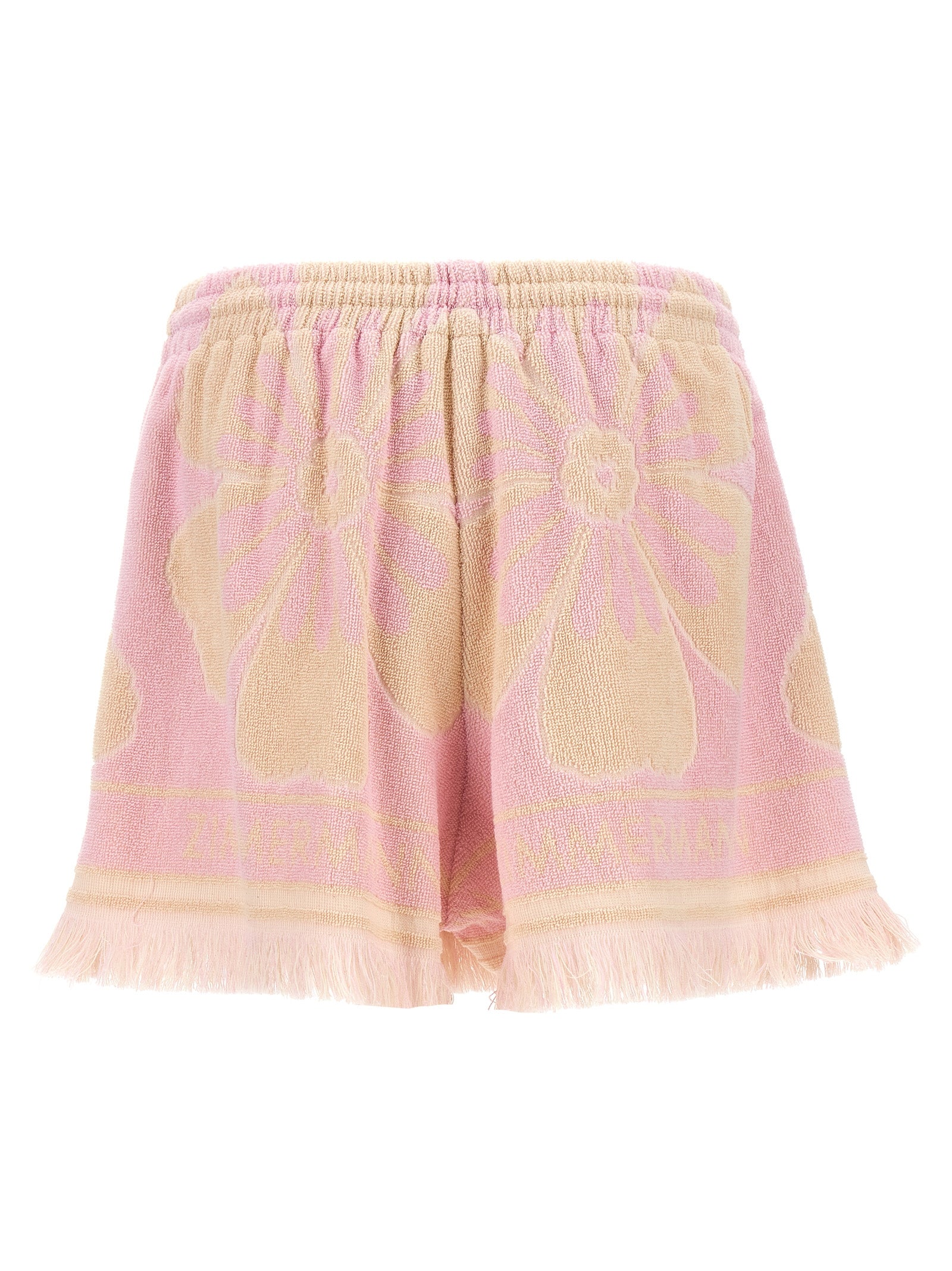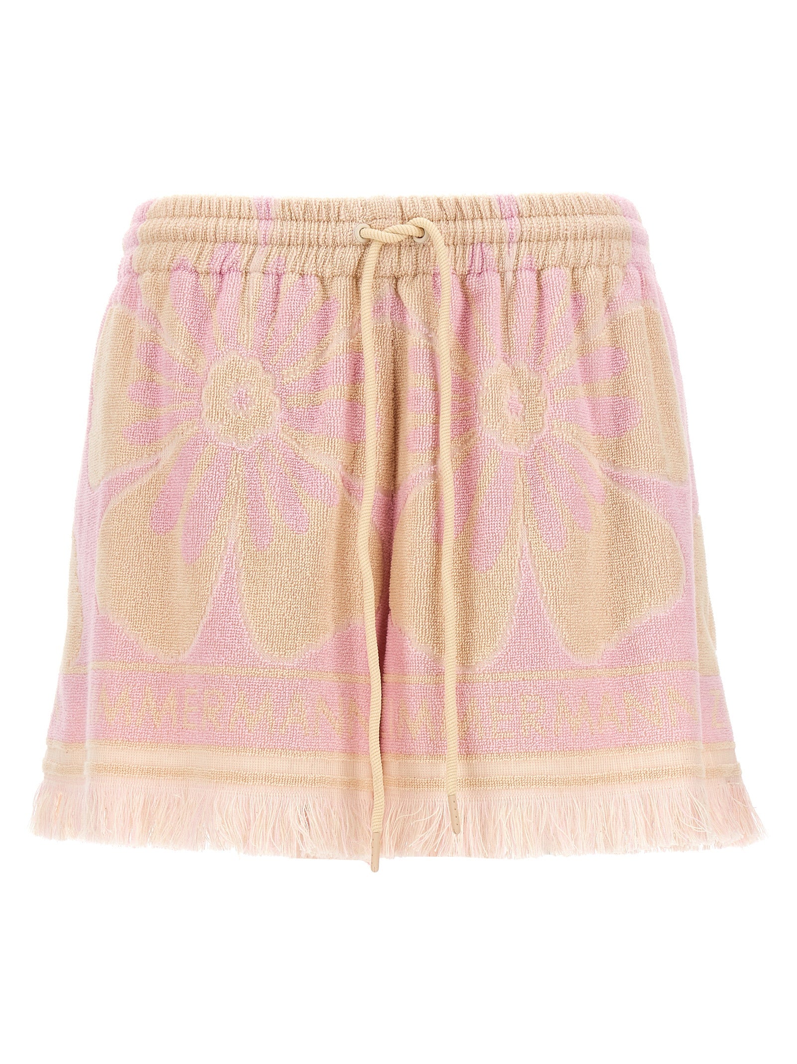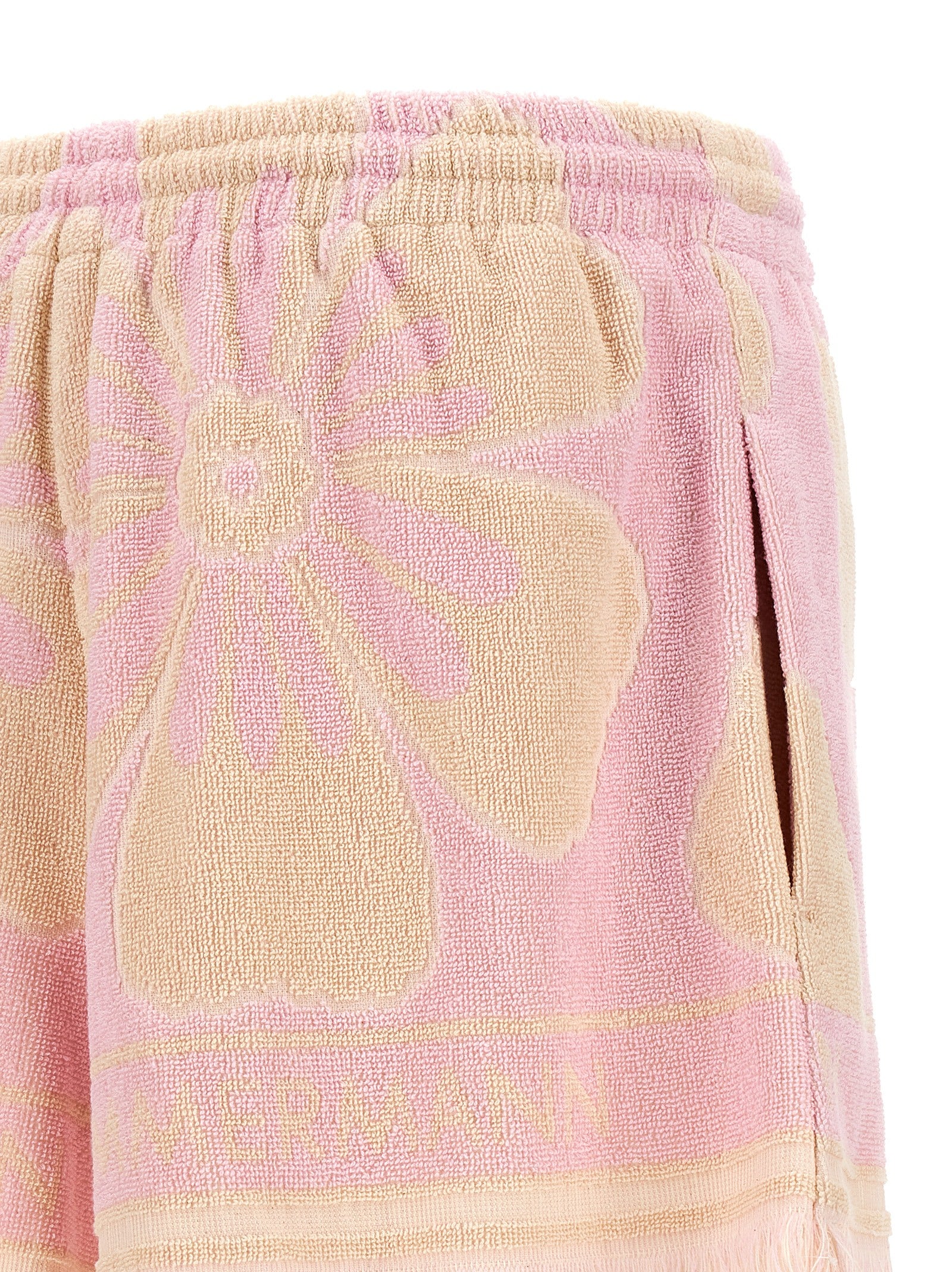 Shorts «serviettes pop» dans un tissu Terry en coton bicolore, ceinture élastique à cordon, poches, ourlet à franges.