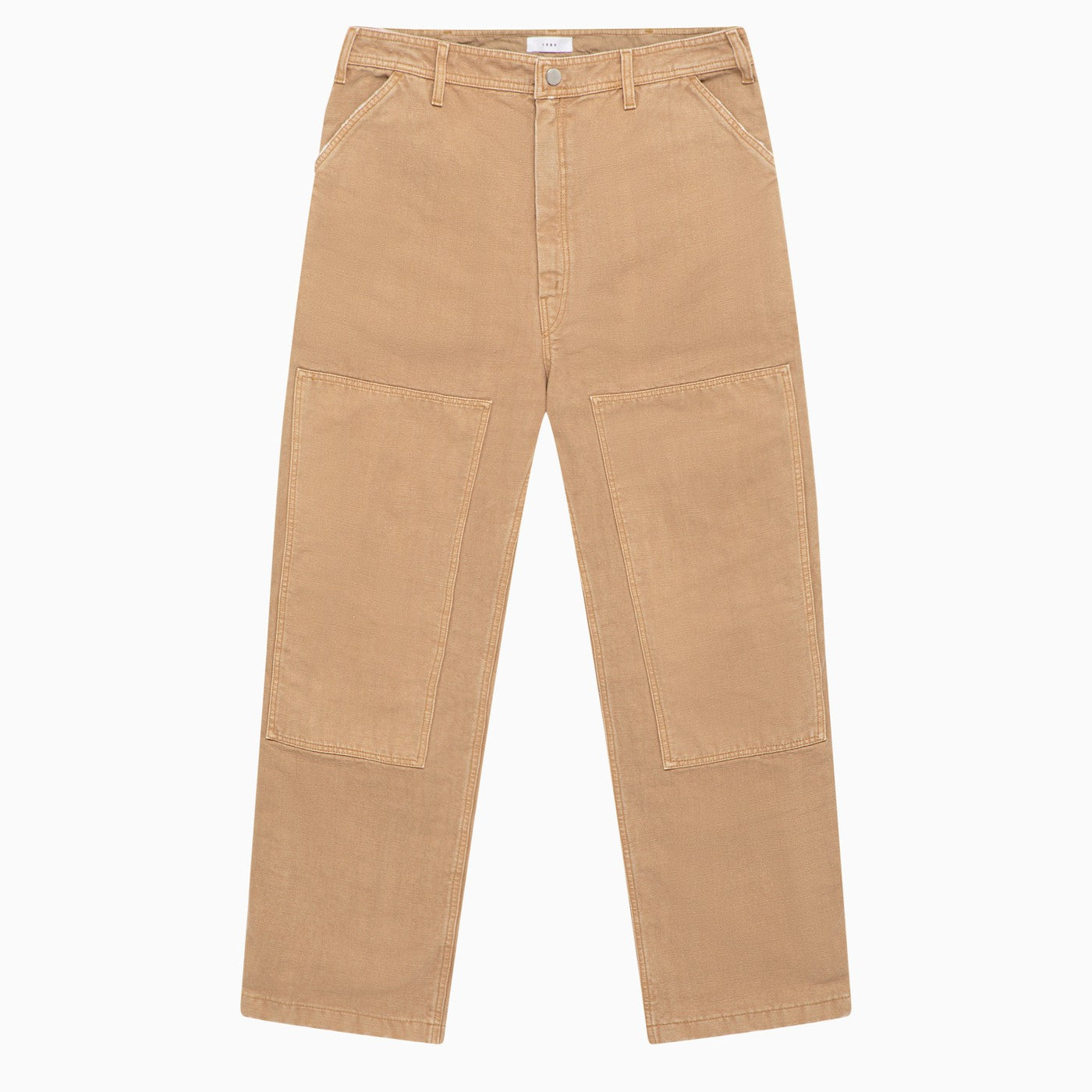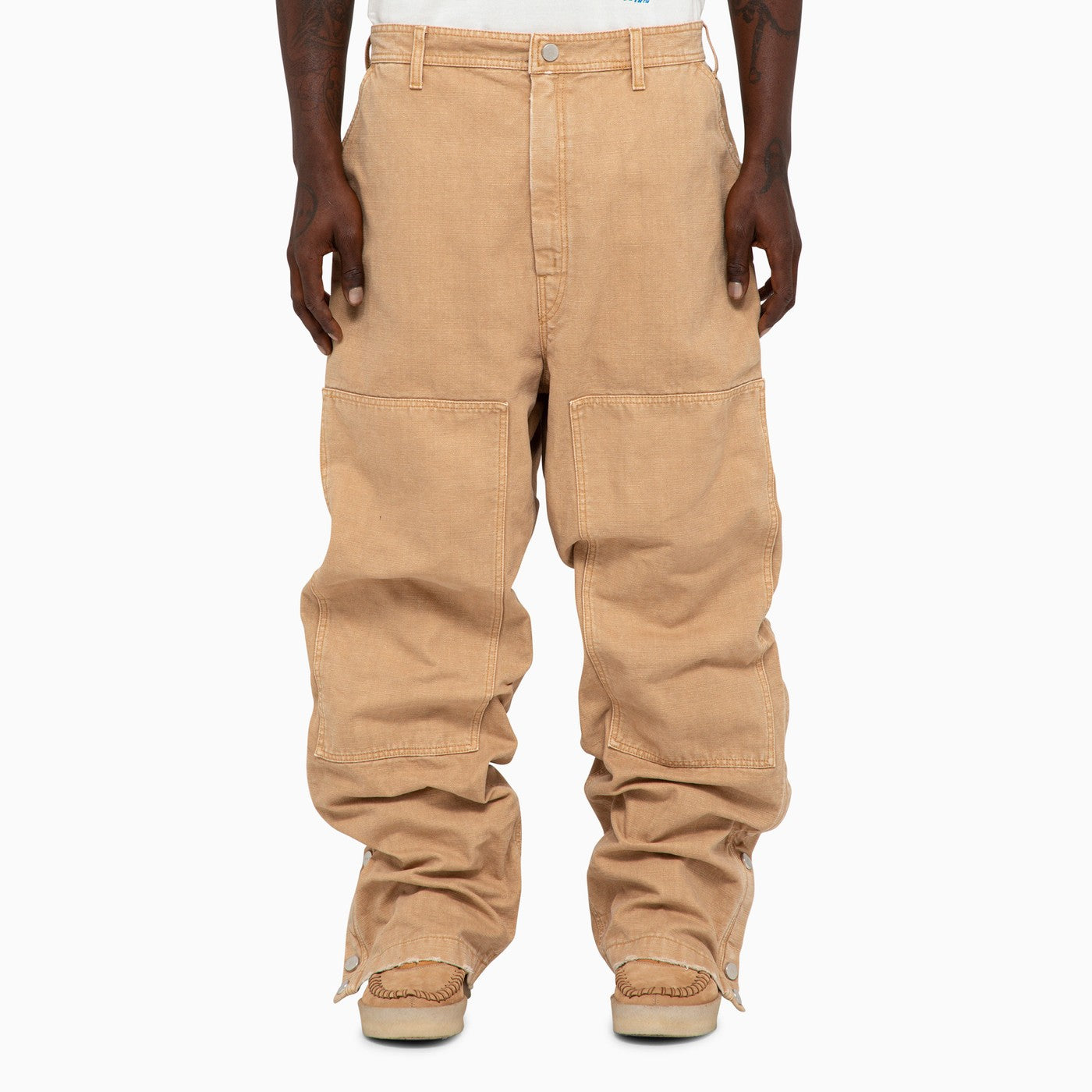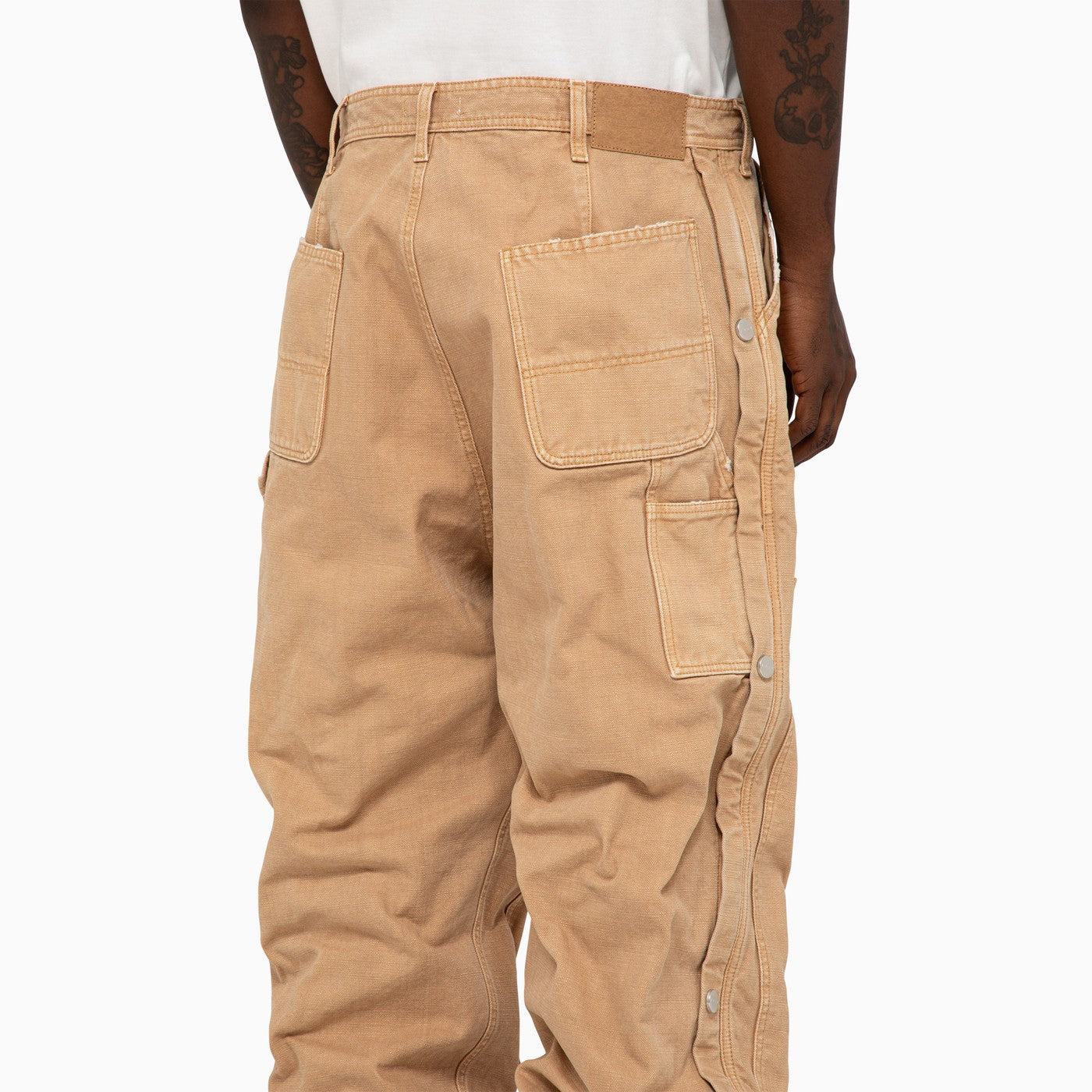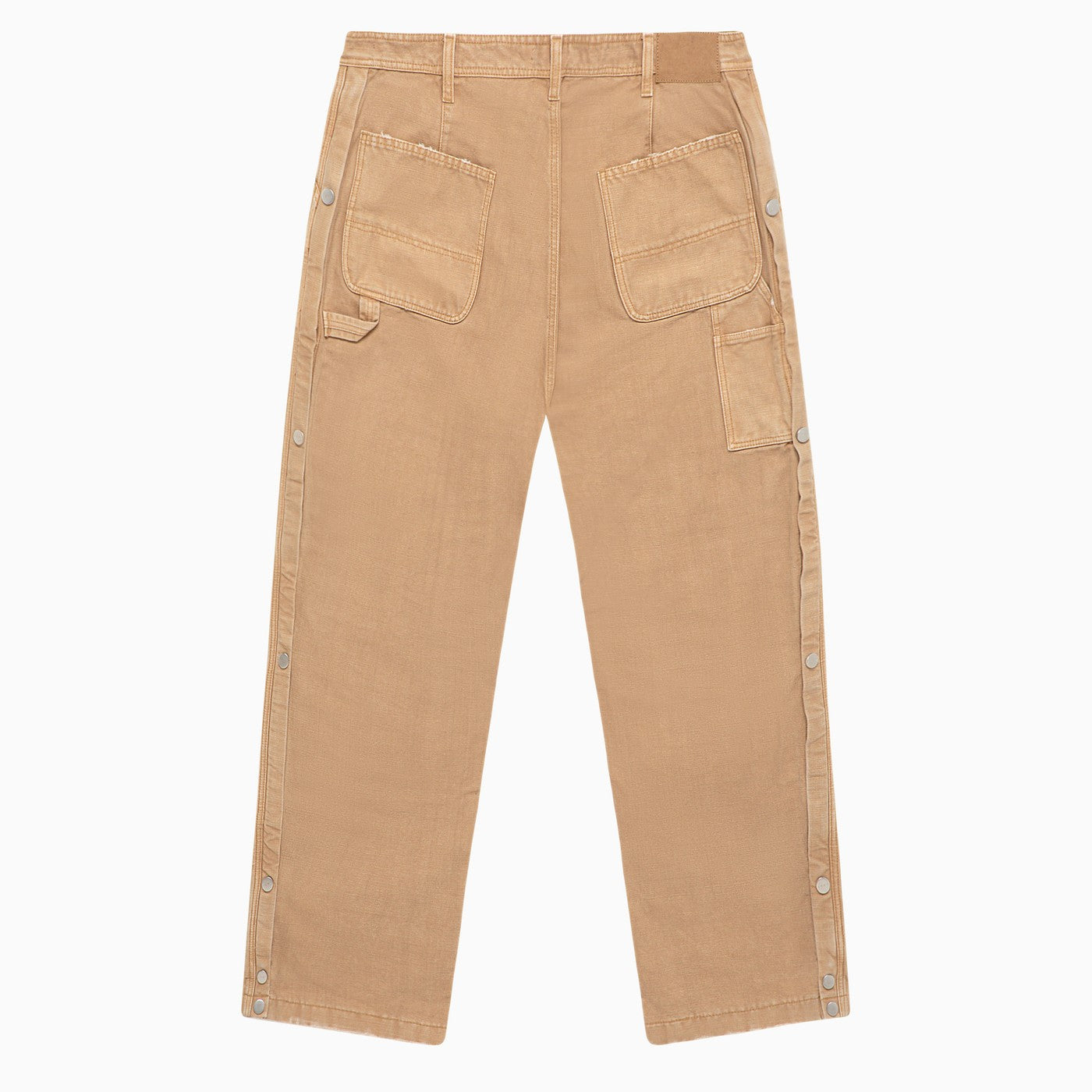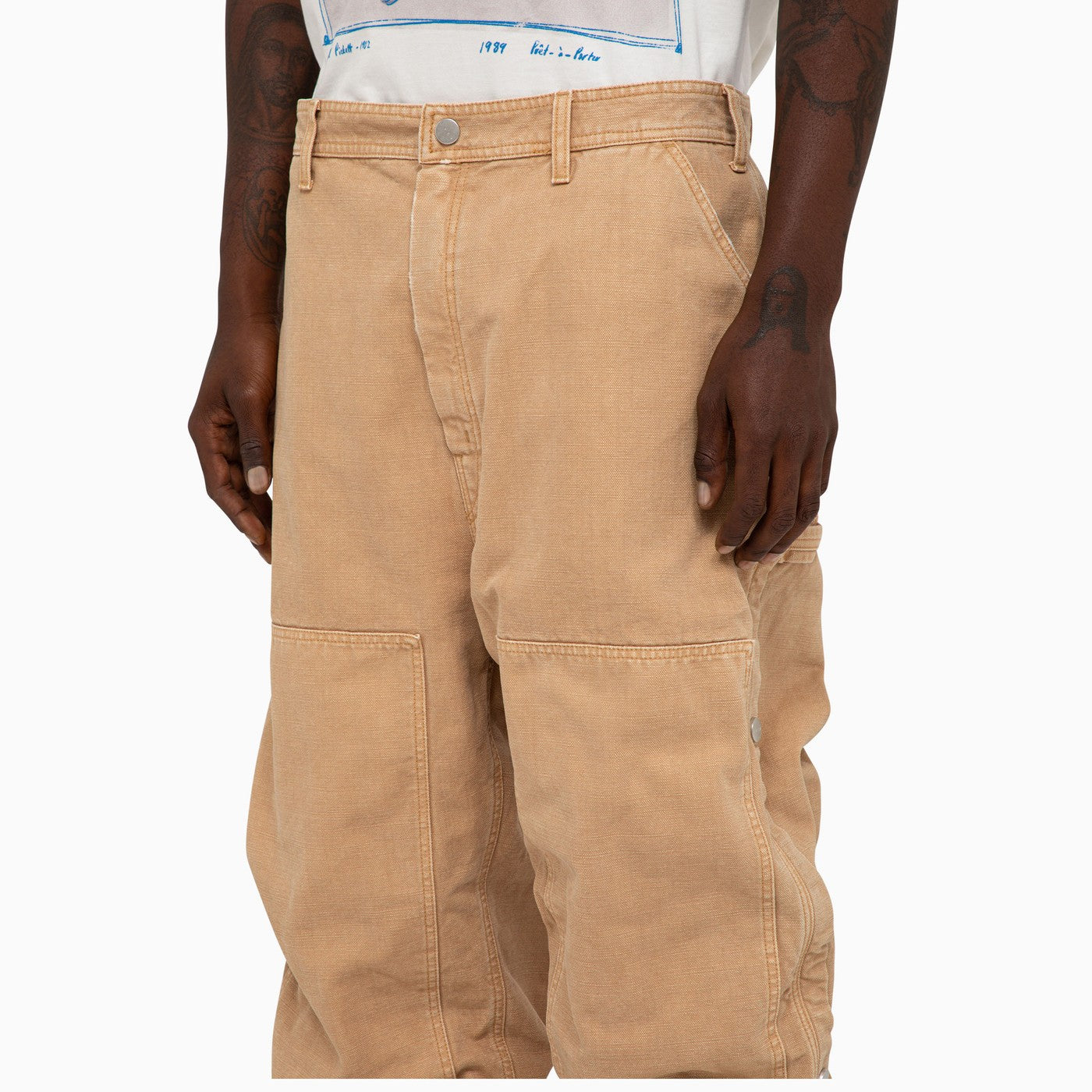 I pantaloni larghi in studio del 1989 in tela di cotone kaki con borchie stampate logo sui lati e tasche massime.