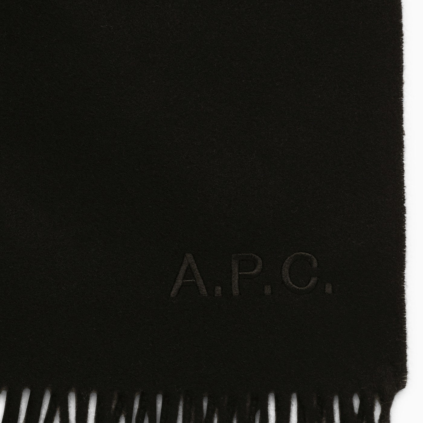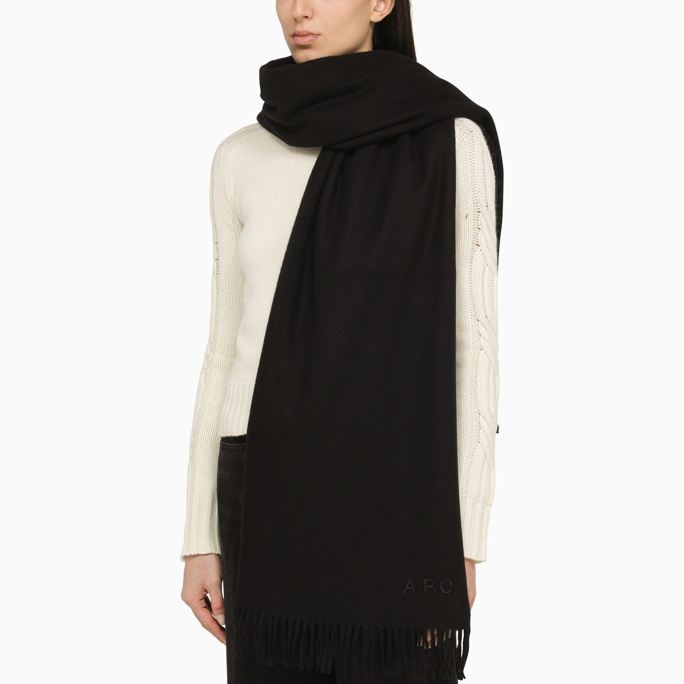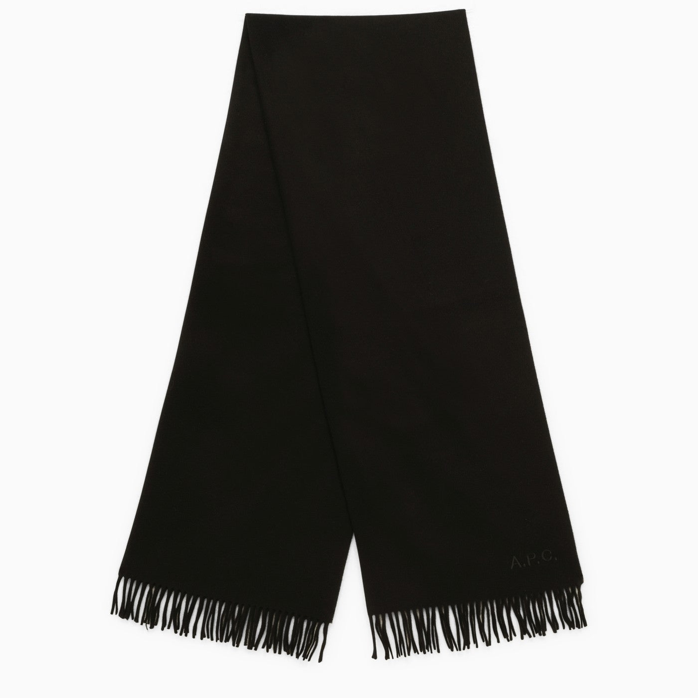 Sciarpa di lana Vergine Nera di A.P.C., con frange decorative alle estremità e logo ricamato a tono.