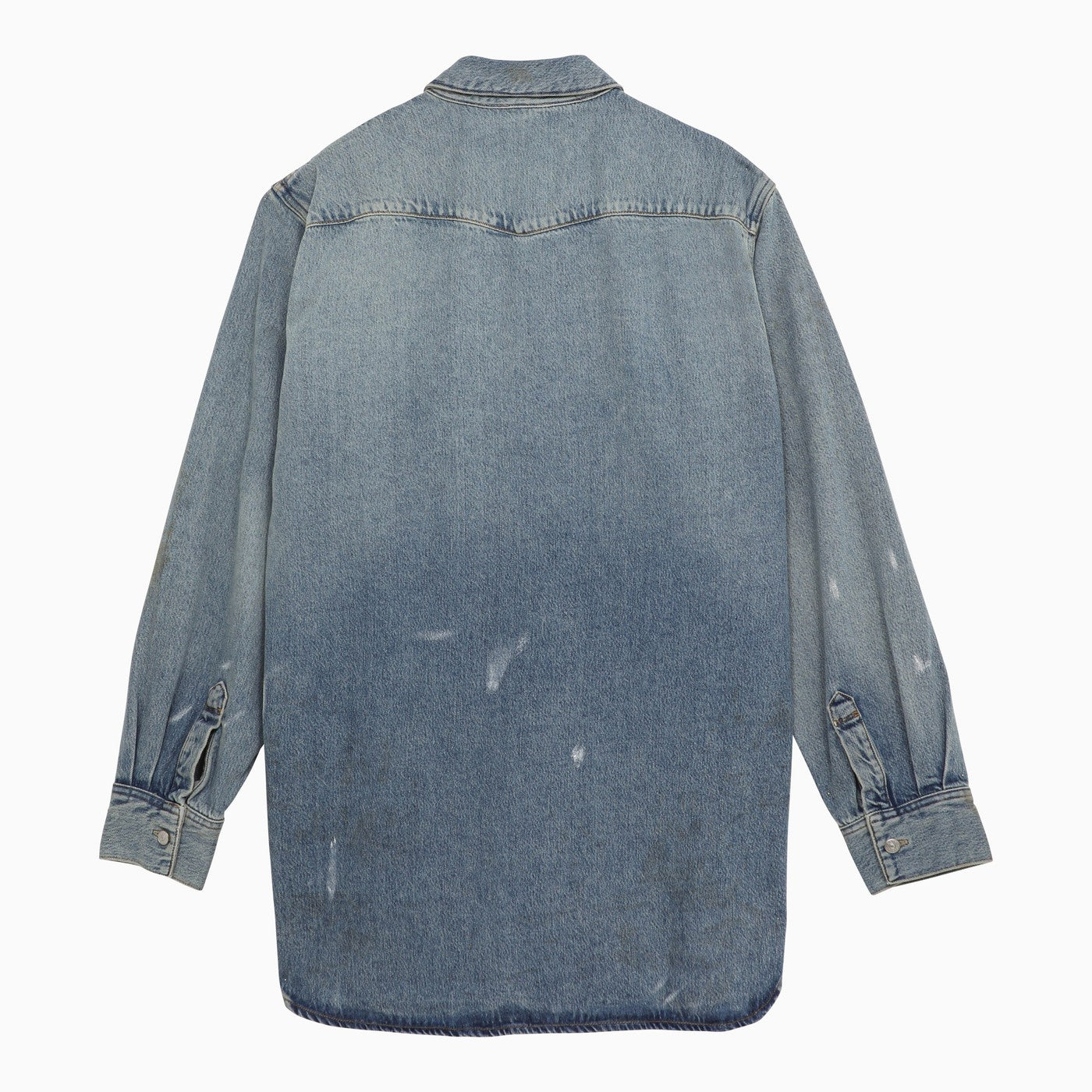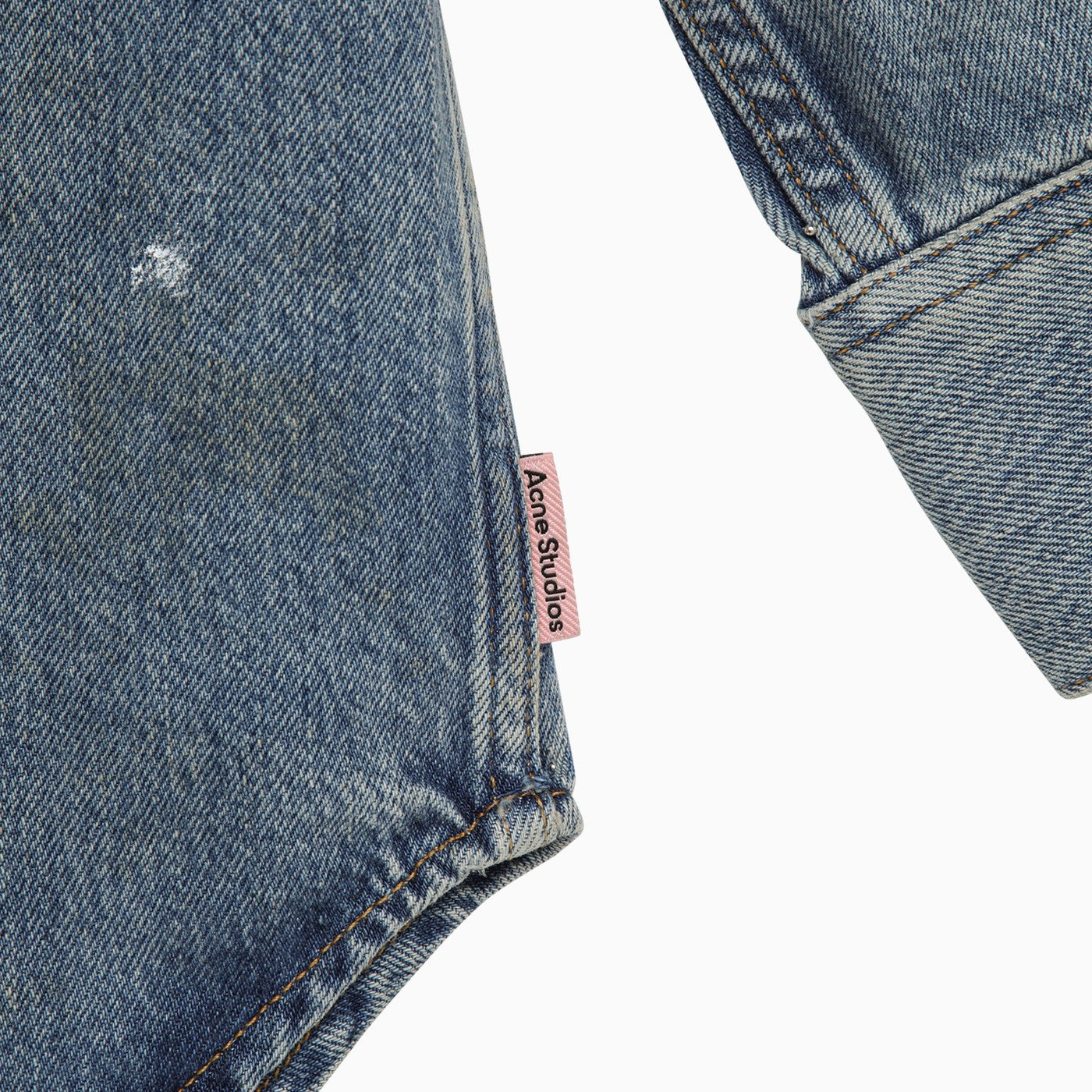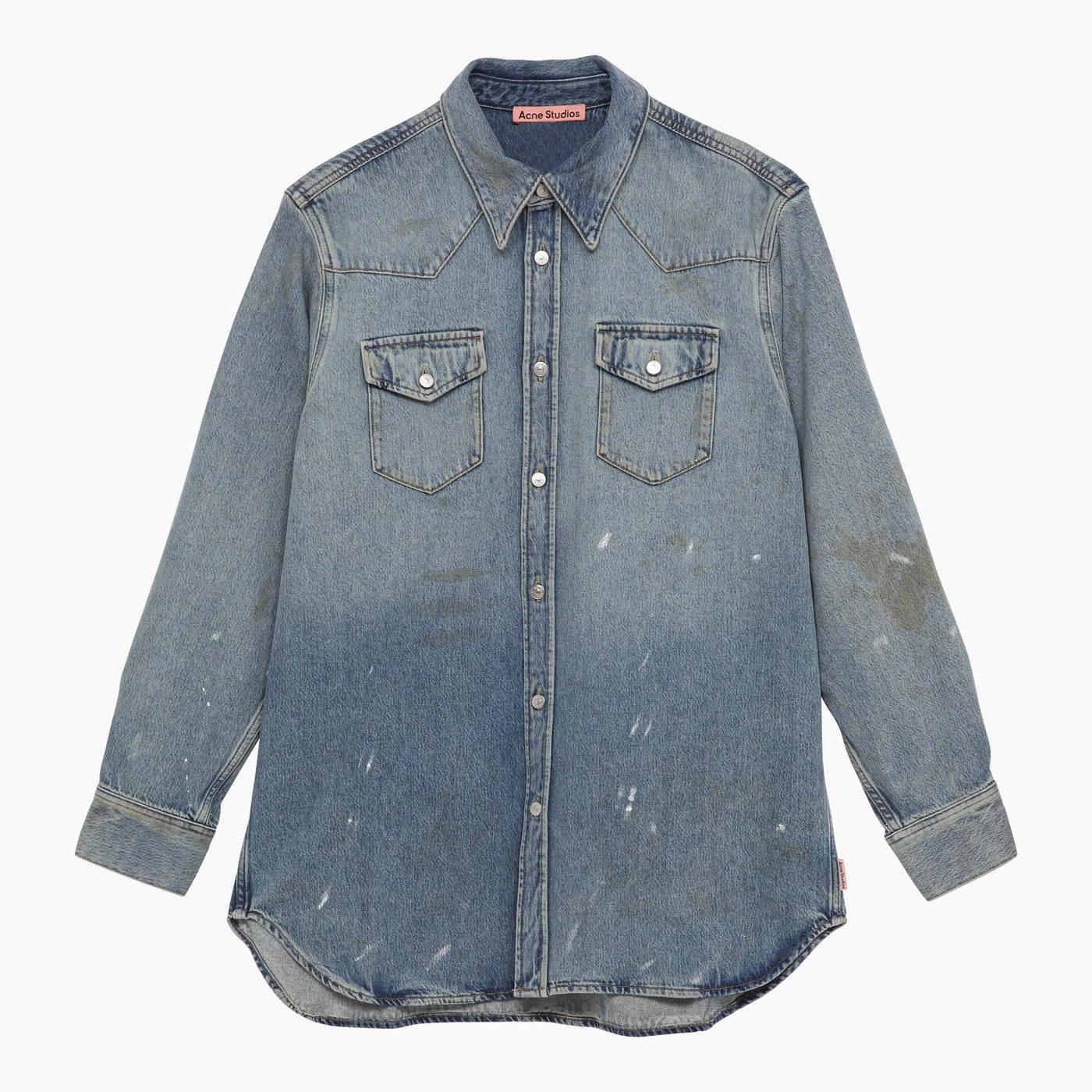 Denim di cotone lavato azzurro sopra la camicia di Acne Studios con un colletto classico, un fissaggio a bottone anteriore, due tasche per patch anteriori con lembo e bottone, maniche lunghe con polsini abbottonati e usura localizzata.