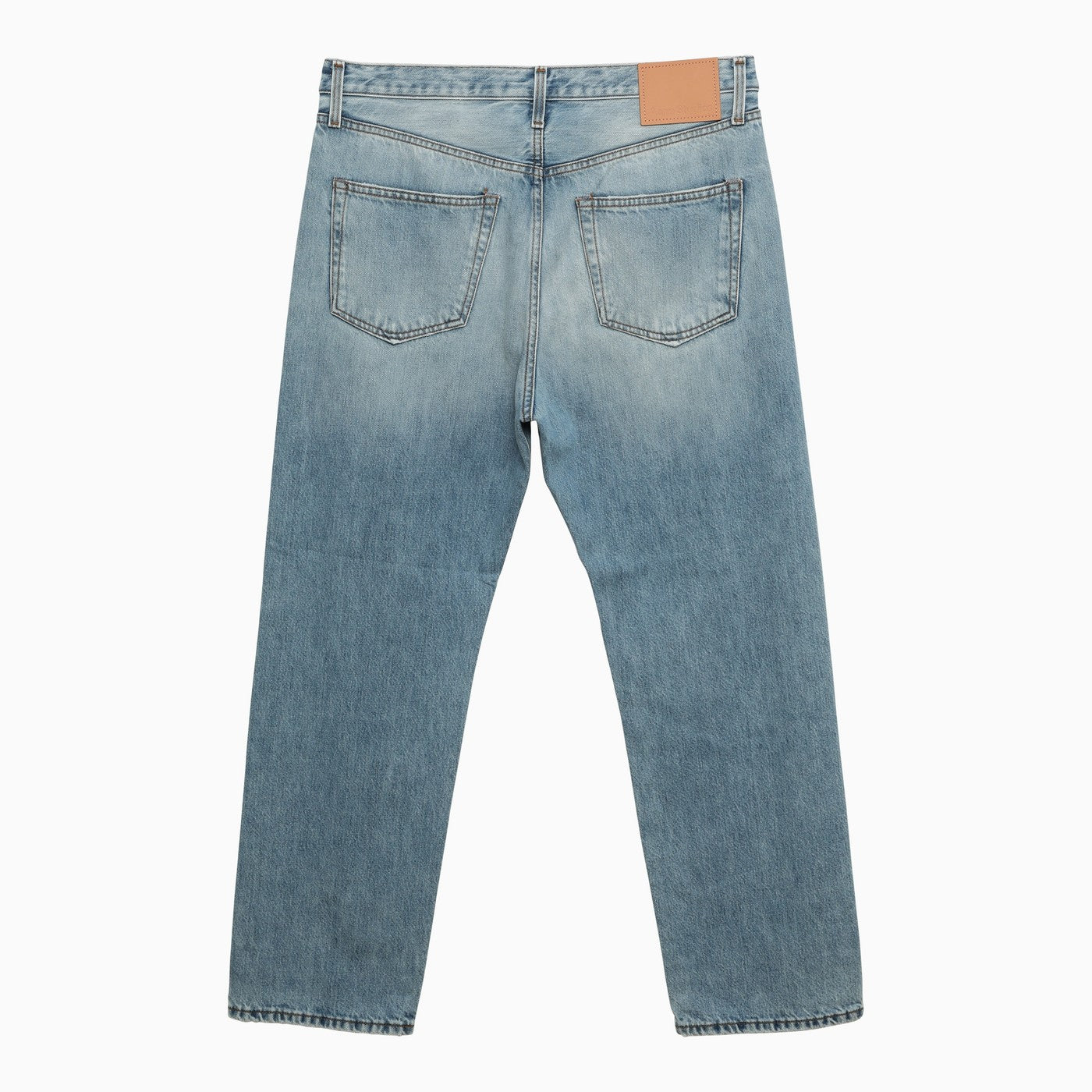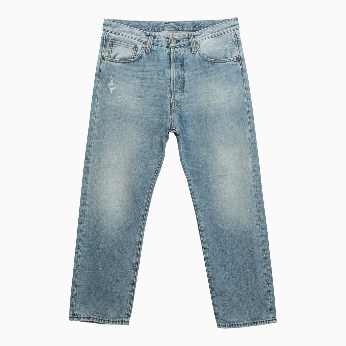 Jeans a gamba dritta in denim in cotone blu chiaro di Acne Studios con zip anteriore e fissaggio a bottone, anelli della cintura, tre tasche anteriori, due tasche posteriori e una patch logo sul retro.