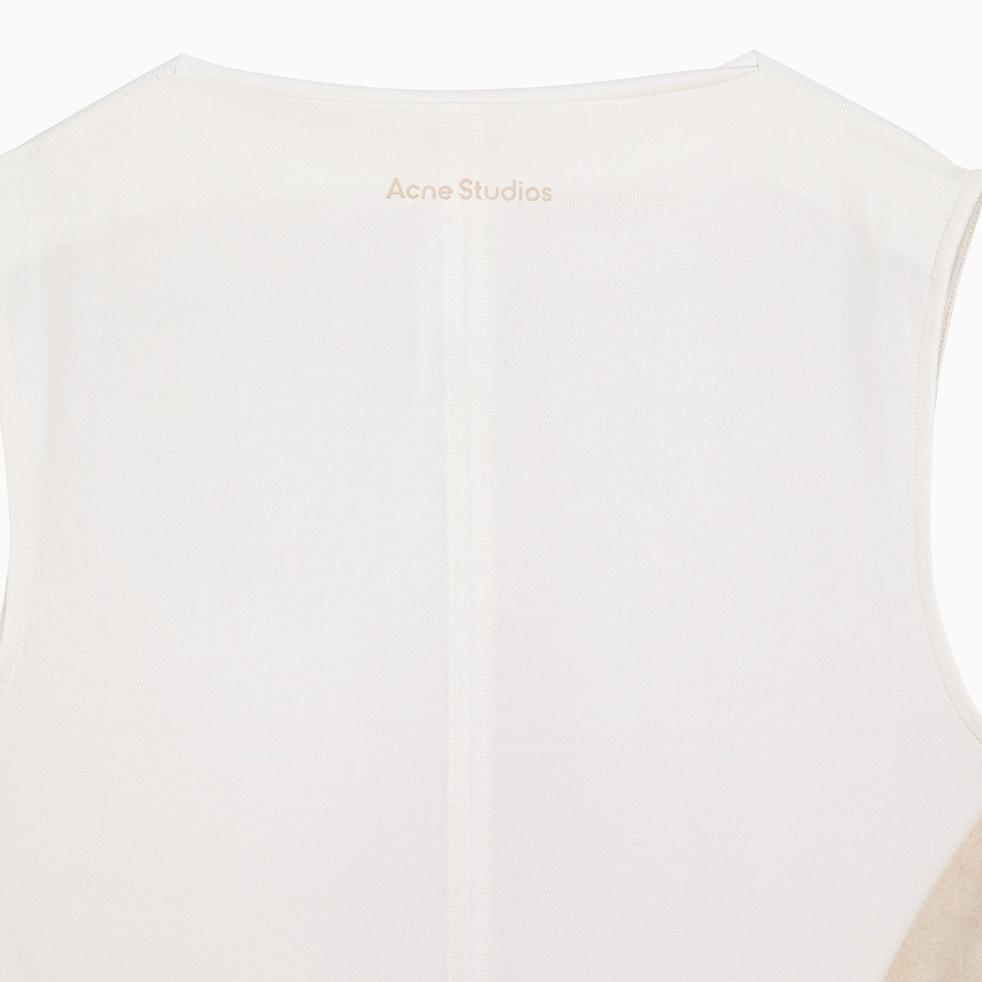 Abito senza maniche in poliestere riciclato bianco e beige di Acne Studios con una stampa tutto over, una collaborazione con l'artista Katerina Jebb, una fessura posteriore e una vestibilità sottile.