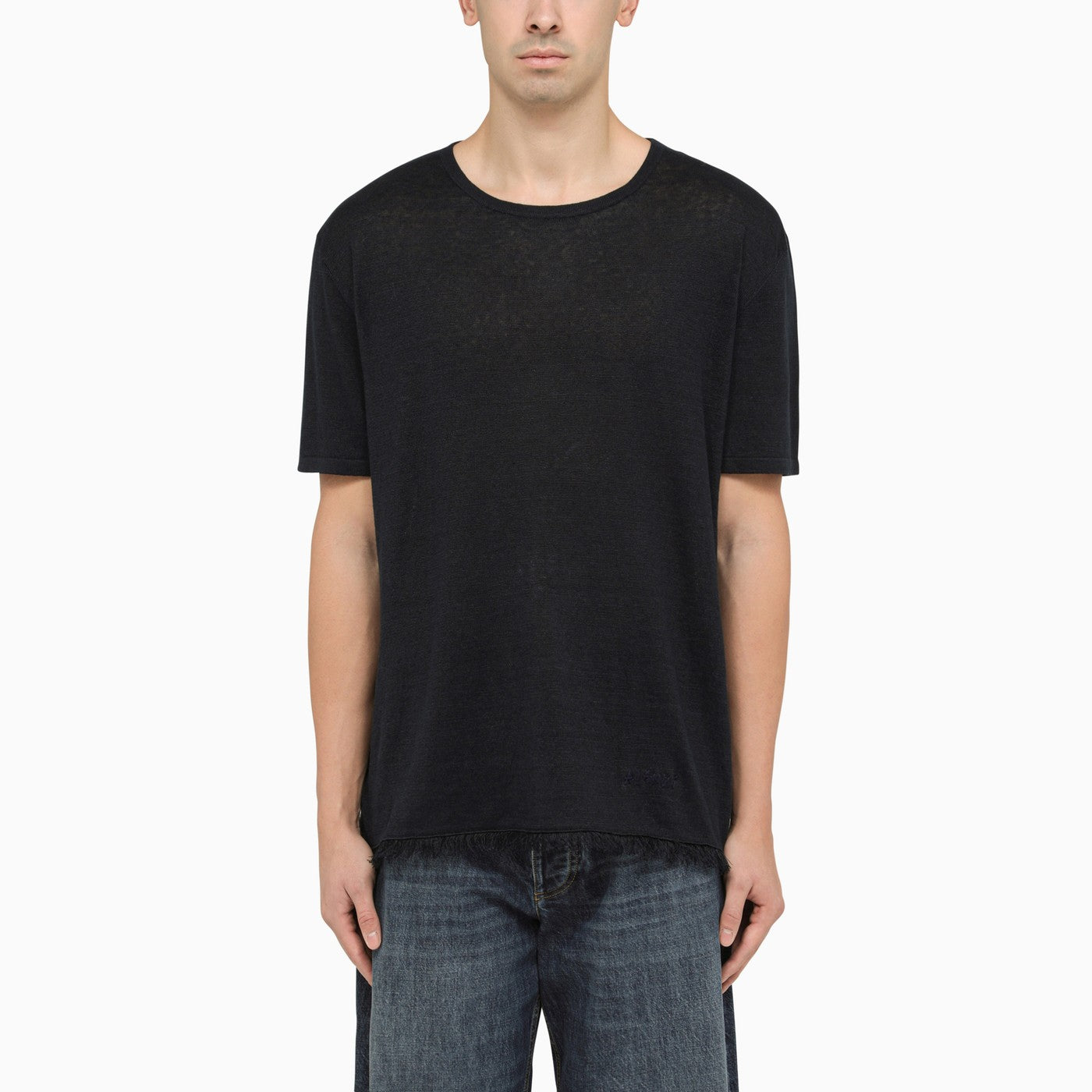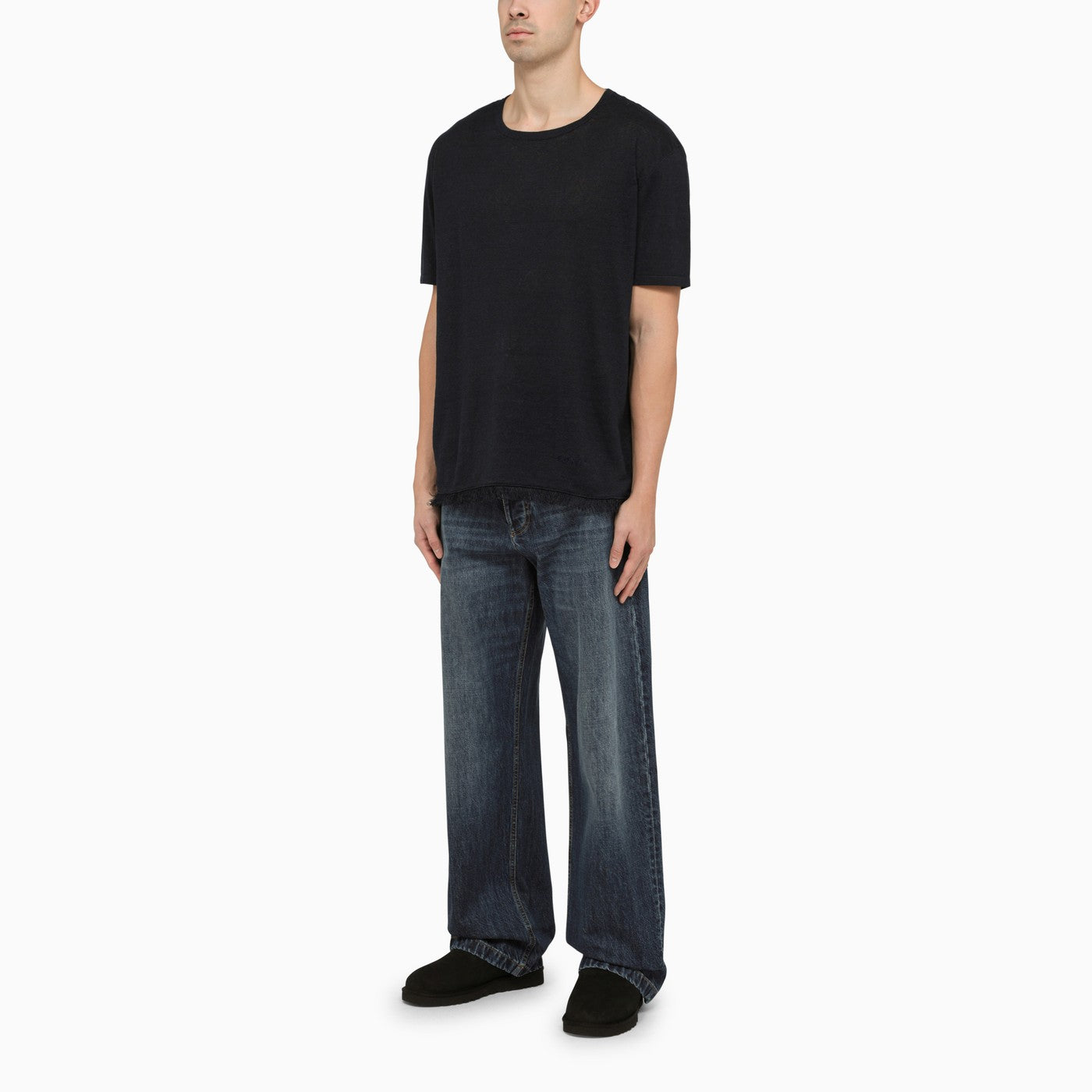 T-shirt in lino blu scuro di Amiri con maniche corte, collo dell'equipaggio, orlo piumato, logo ricamato anteriore e vestibilità regolare.