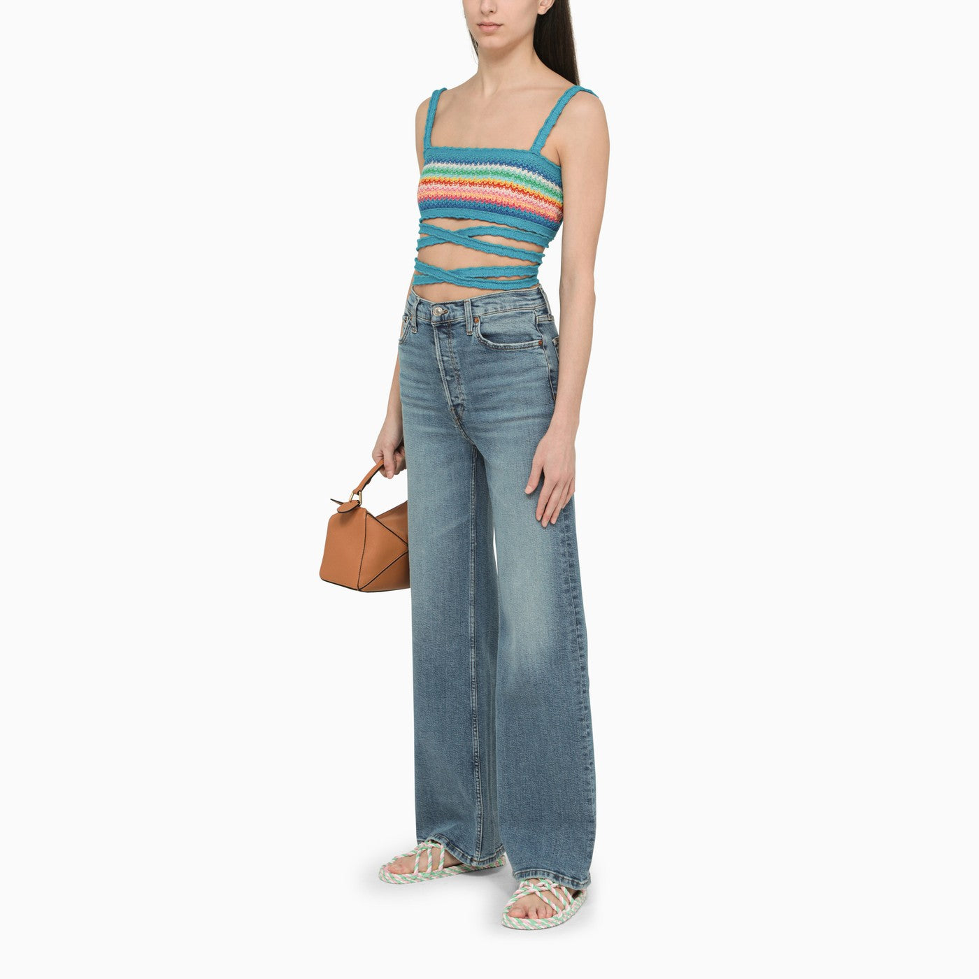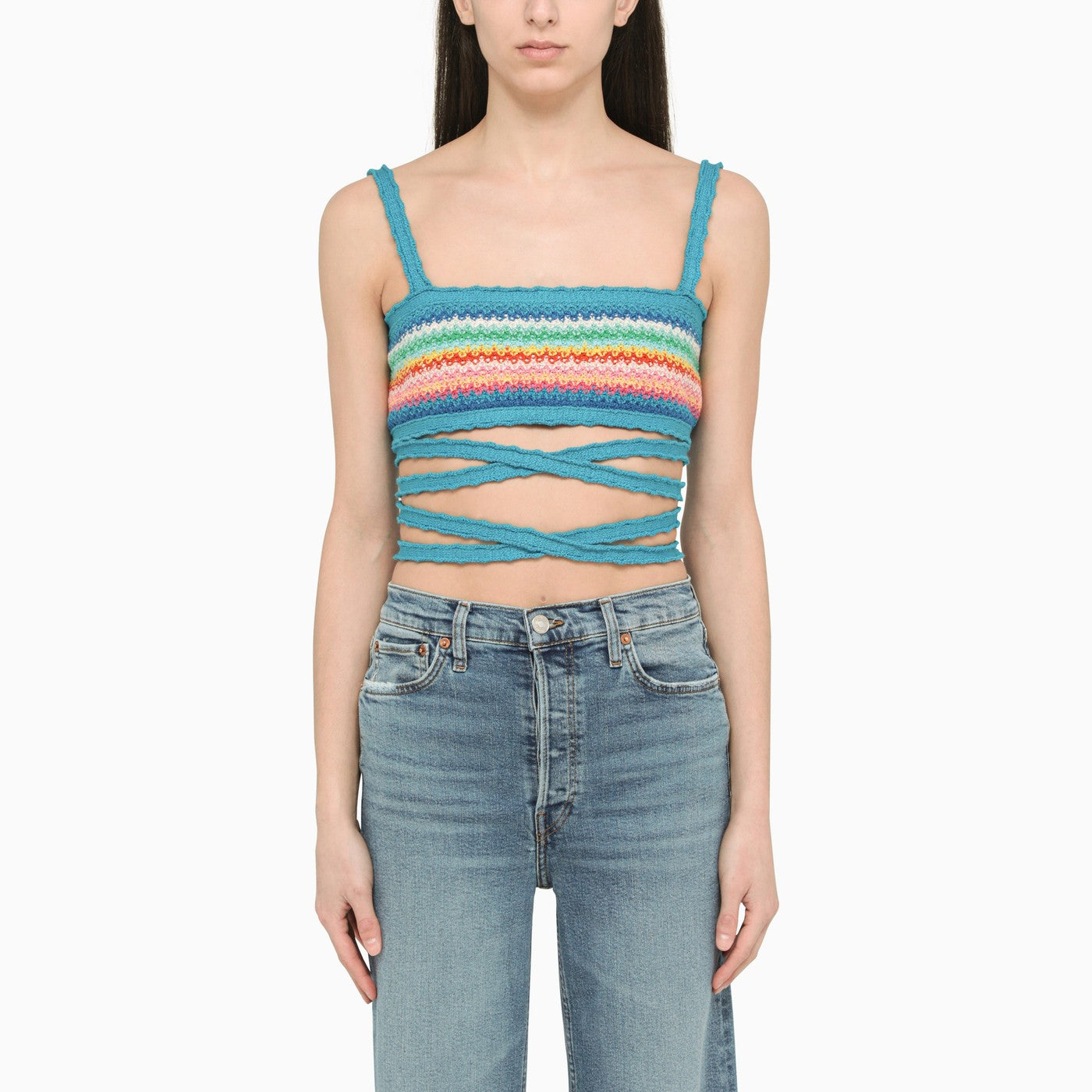 Top corto di Alanui, realizzato in maglia di cotone azzurra e multicolore, con nastri tono-su tono e cinghie fisse.