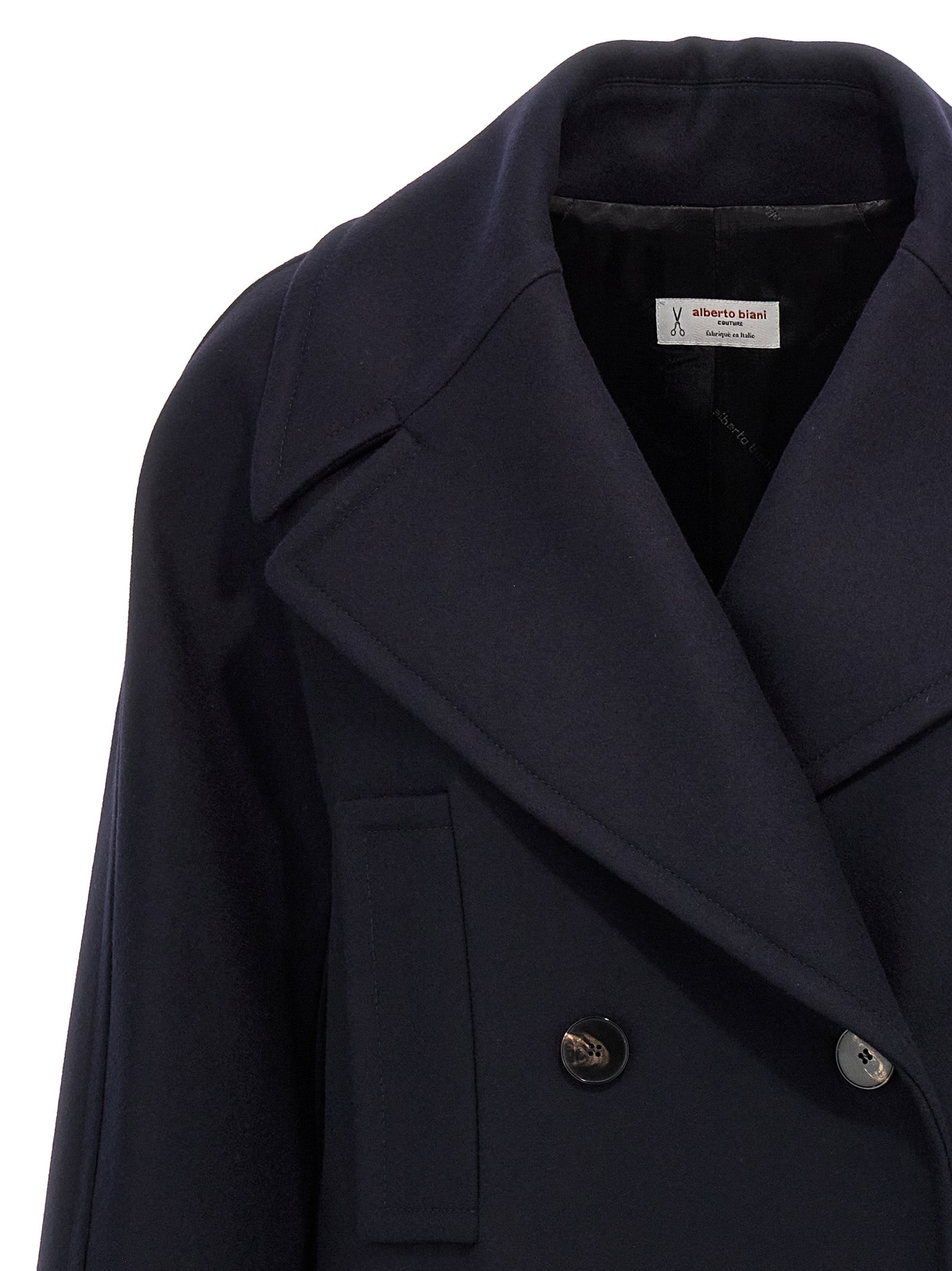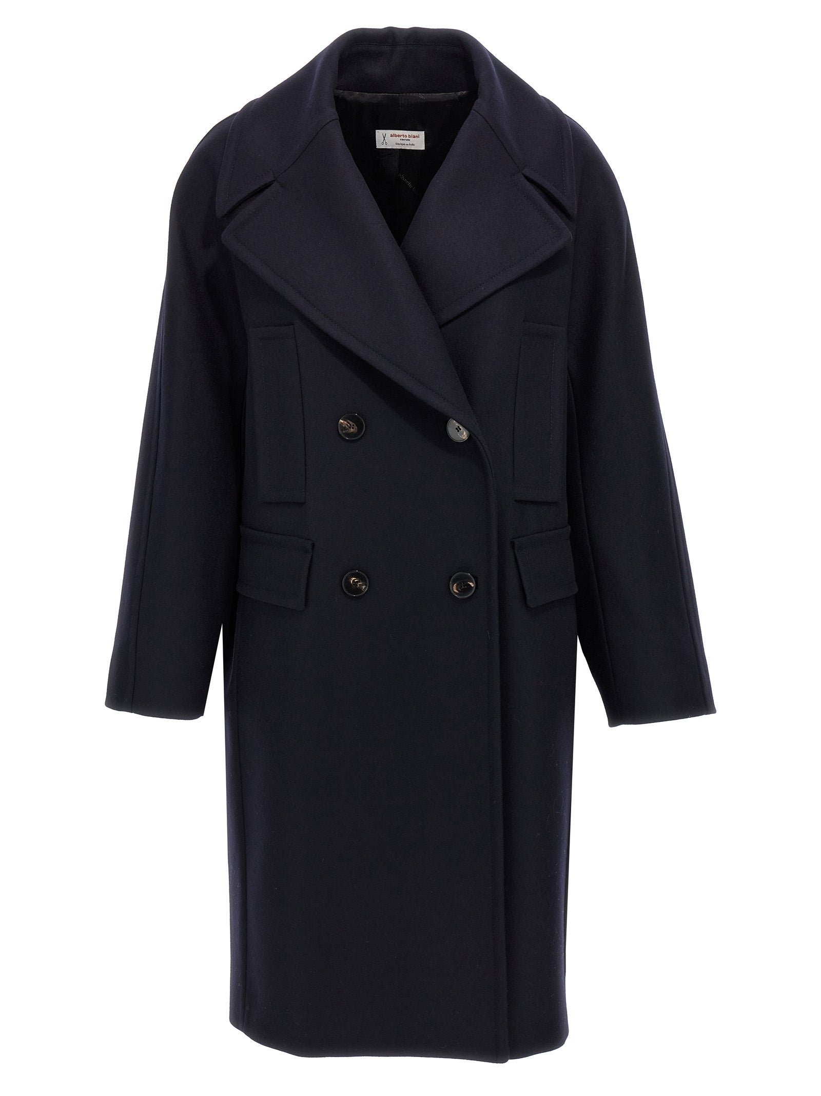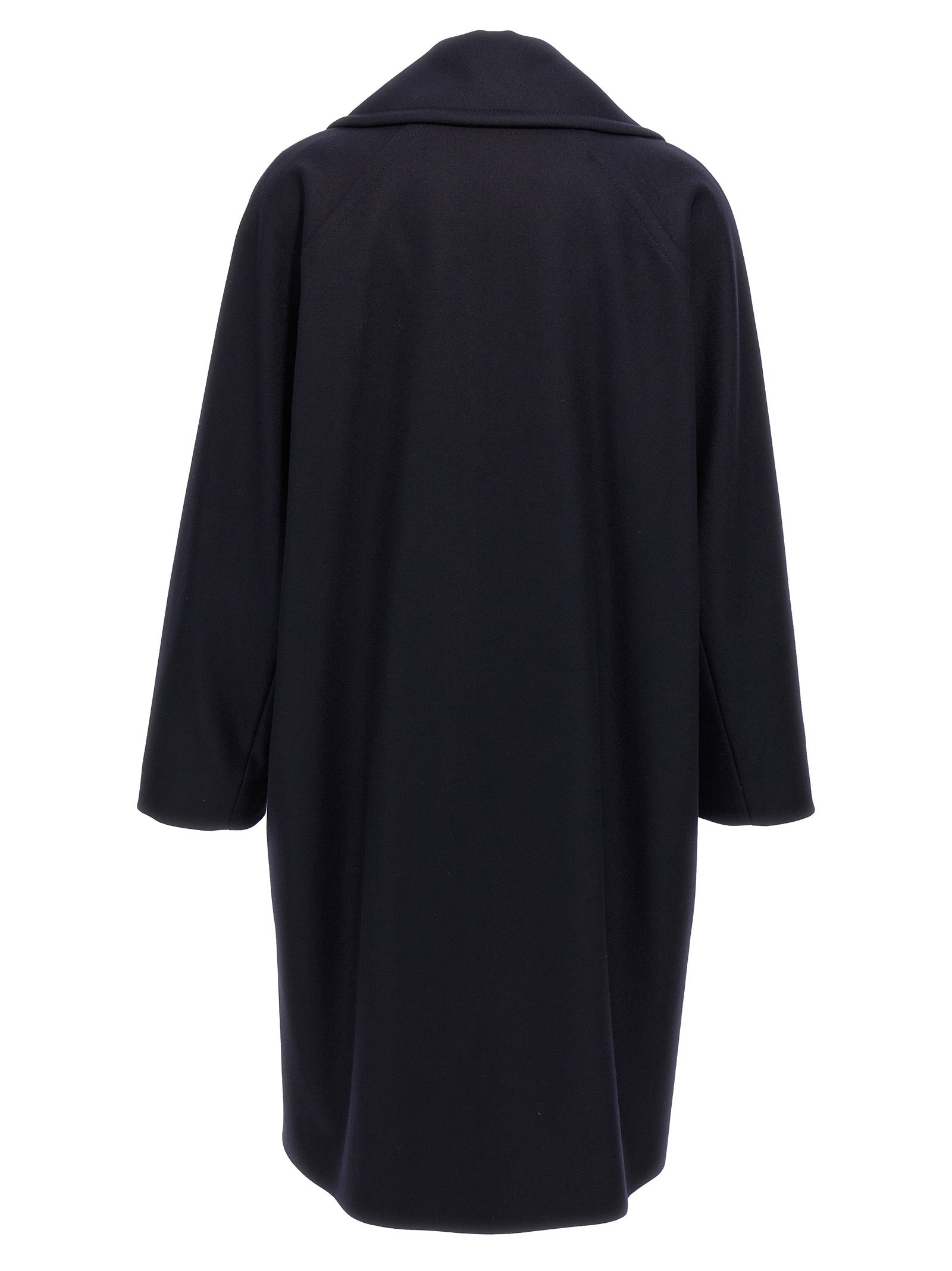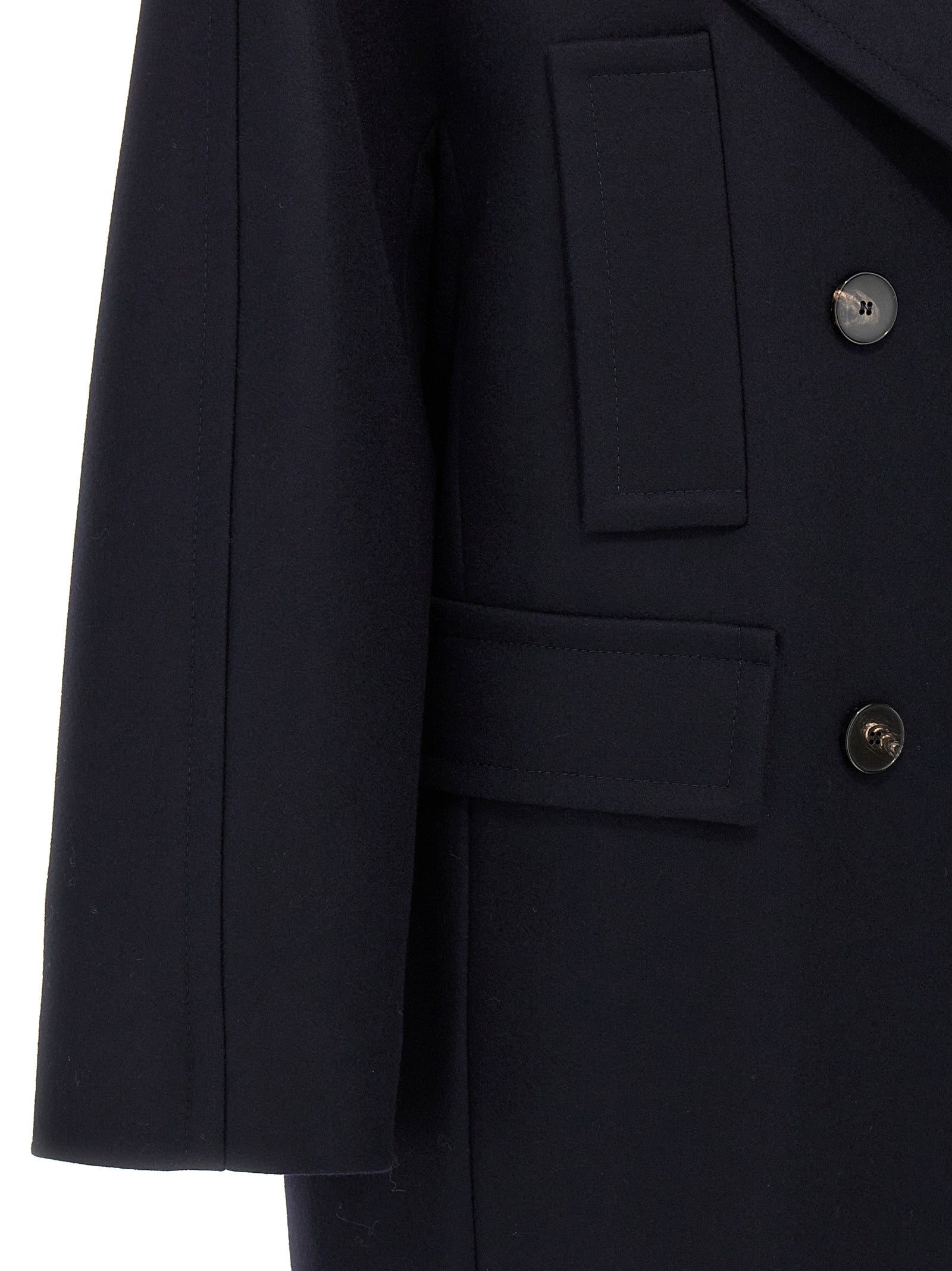 Cappotto per miscela di lana a doppio petto con chiusura a bottone, tasche, maniche lunghe.