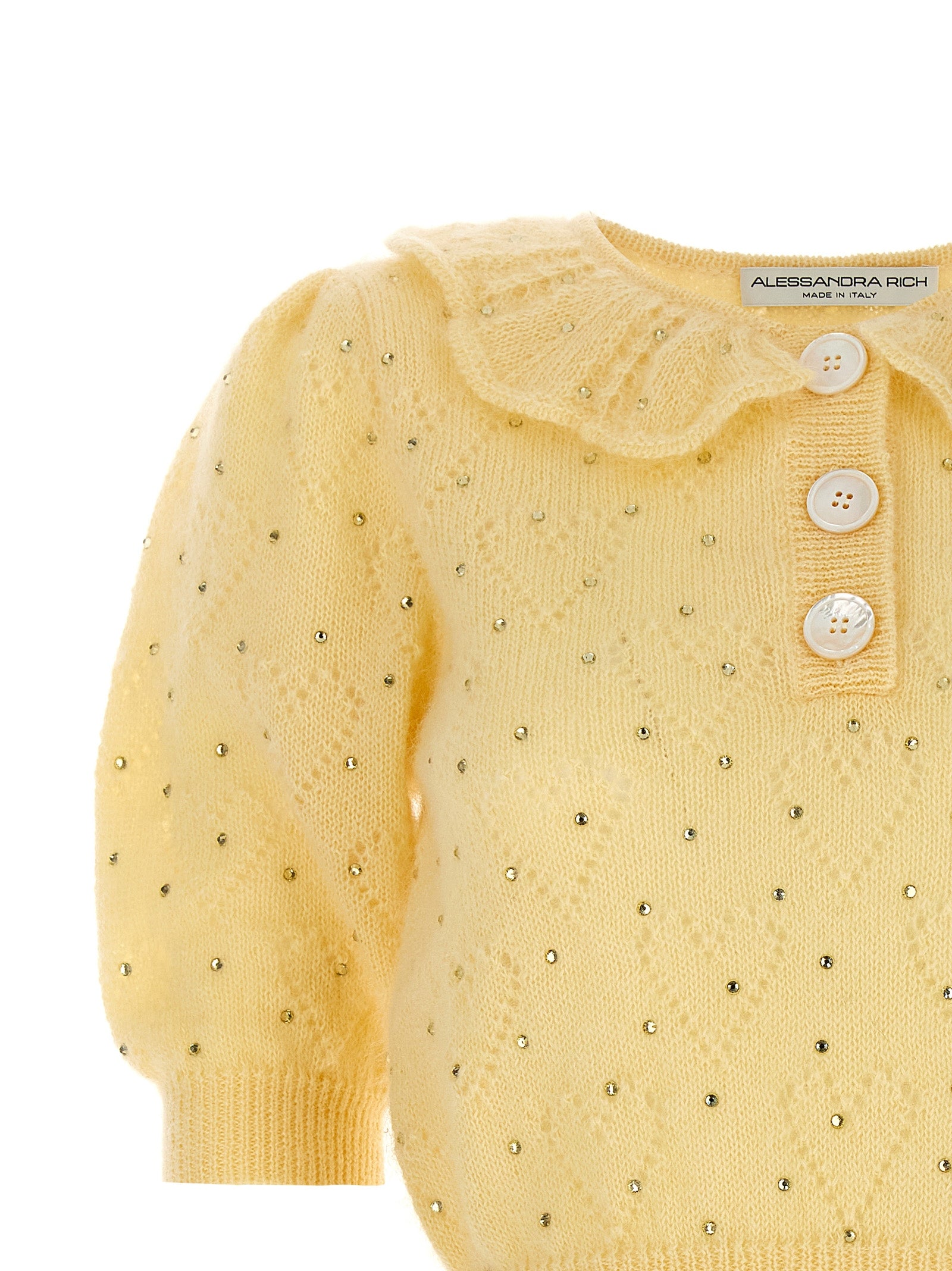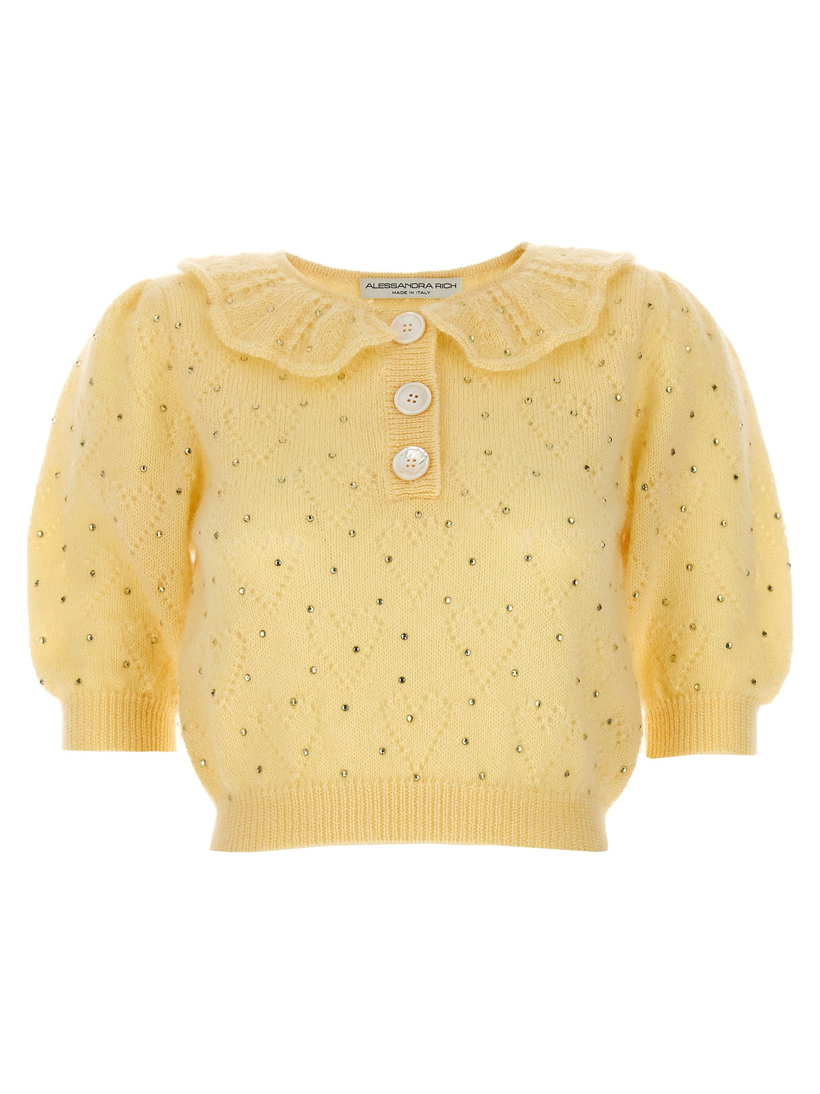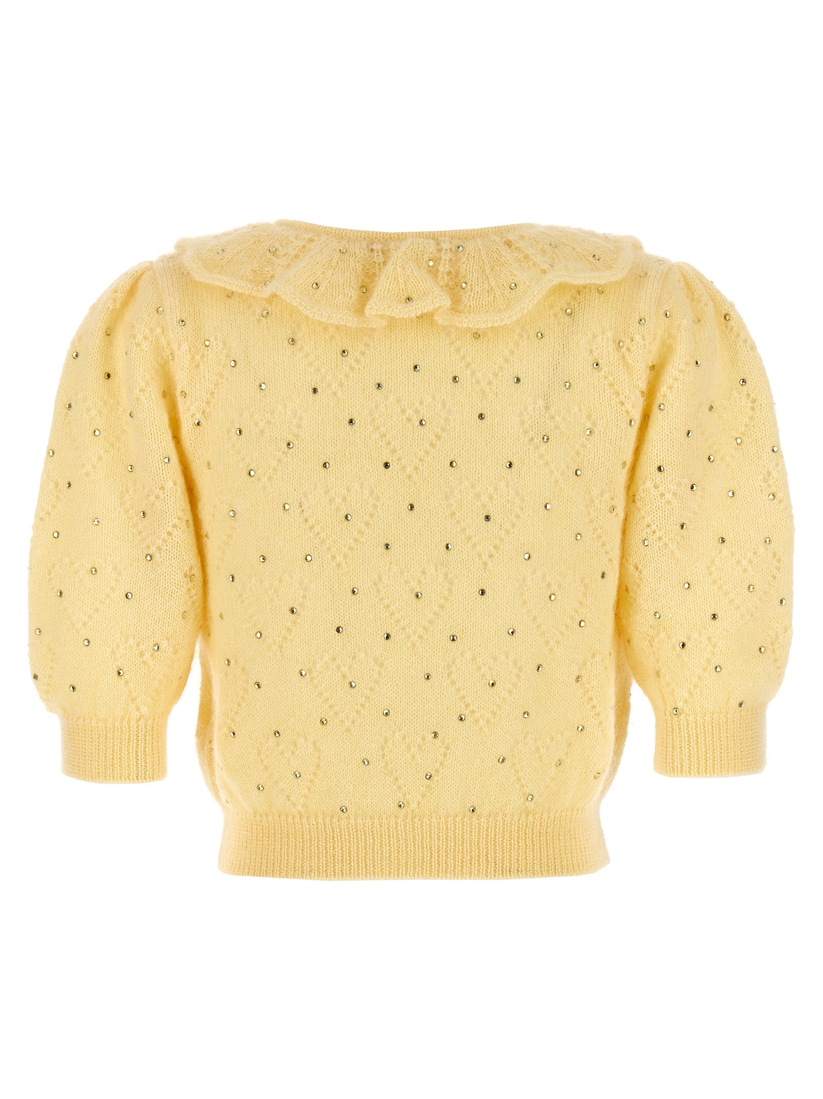 Maglione di miscela mohair con appliqué di strass, maniche corte con polsini.