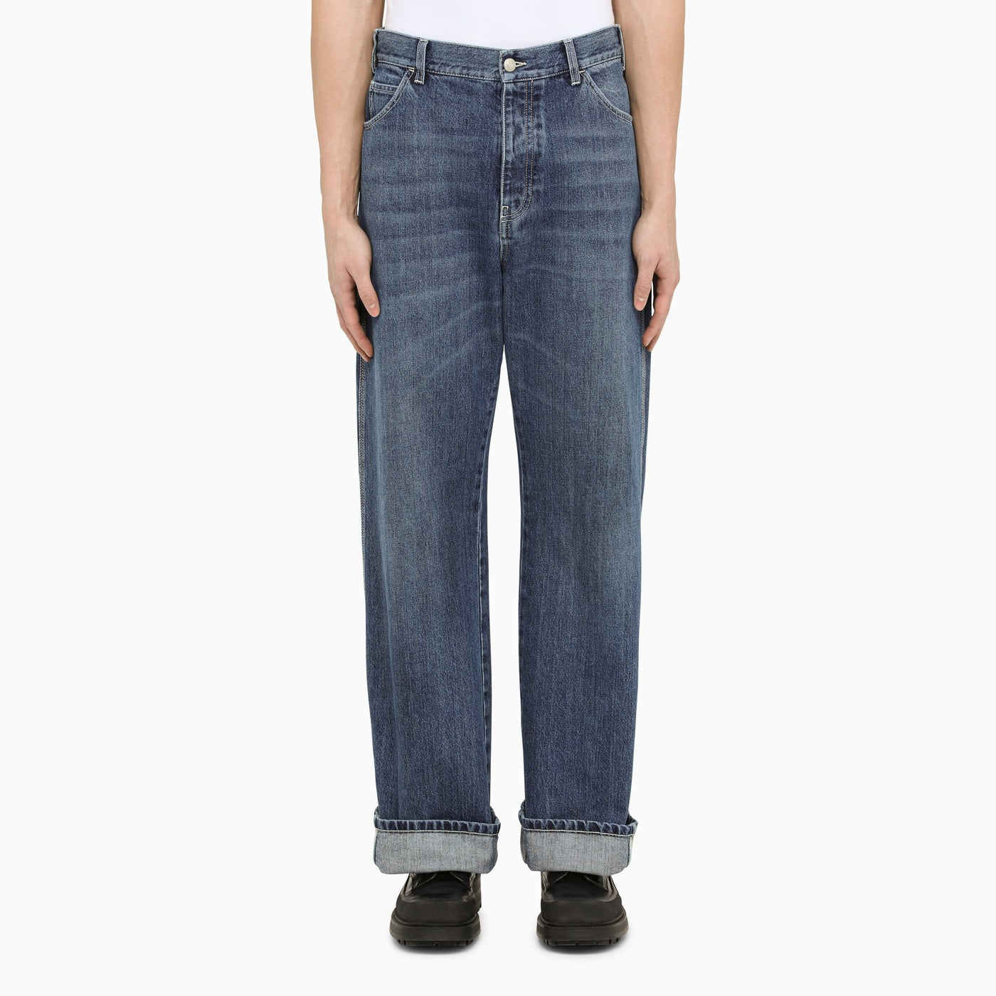 Jeans a cinque tazze di Alexander McQueen in denim blu di cotone, con patch di logo in pelle cuciti sul retro e in forma libera.
