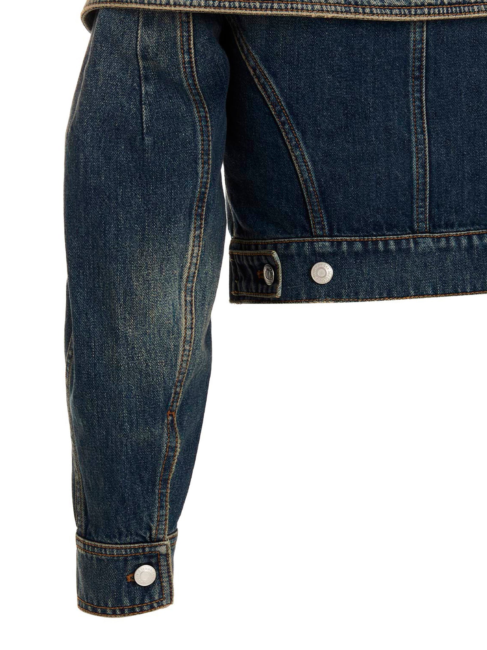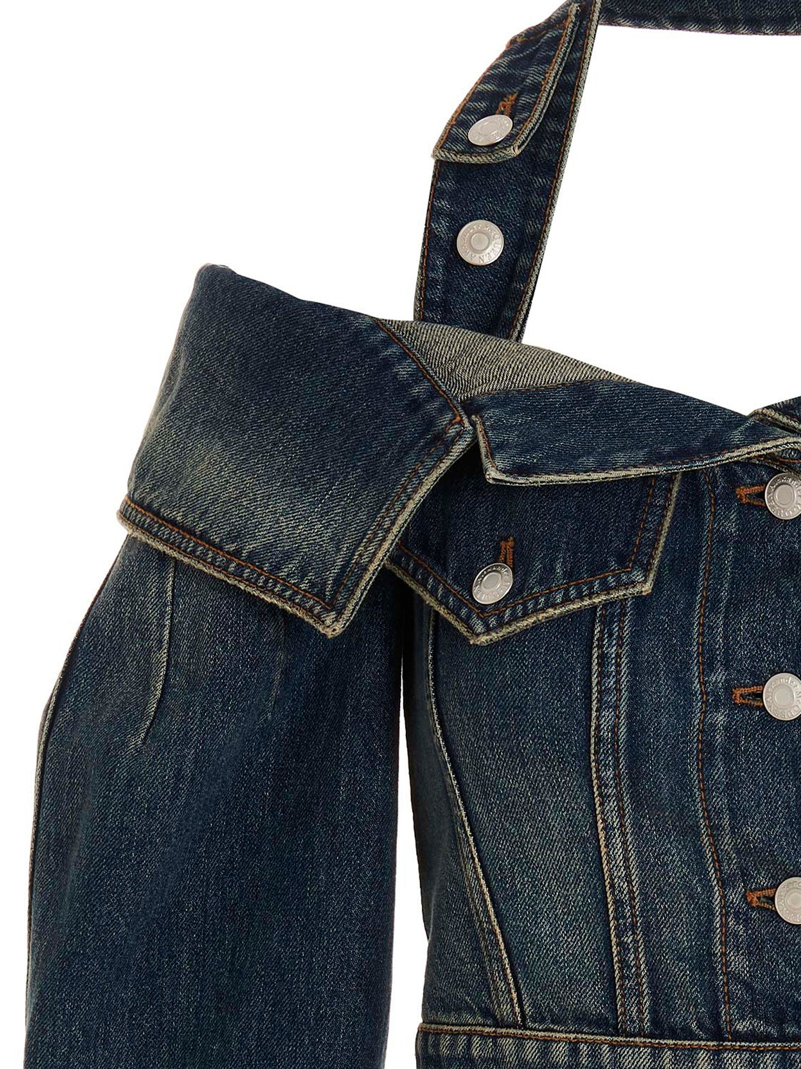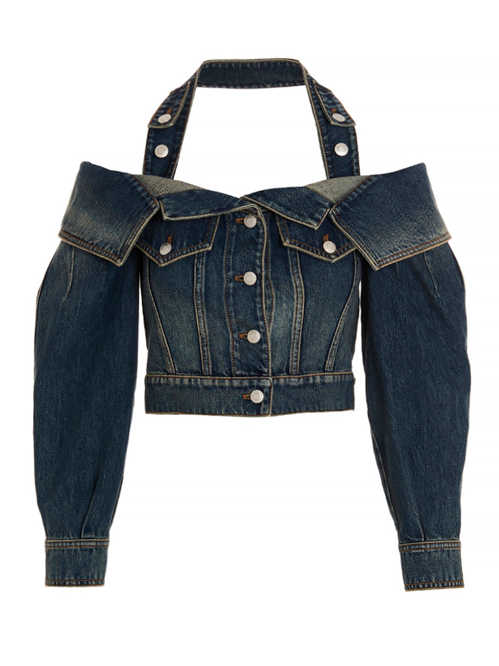 Giacca di jeans di cotone Halter con stile n-the-the-spalle, spalline regolabili, chiusura a bottone, maniche lunghe e uno stile ritagliato.