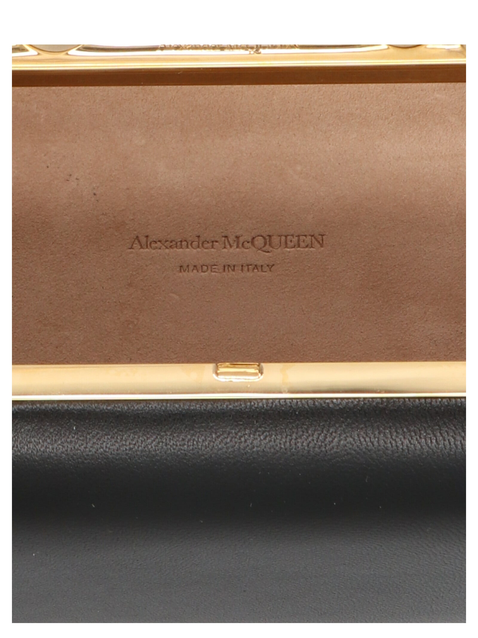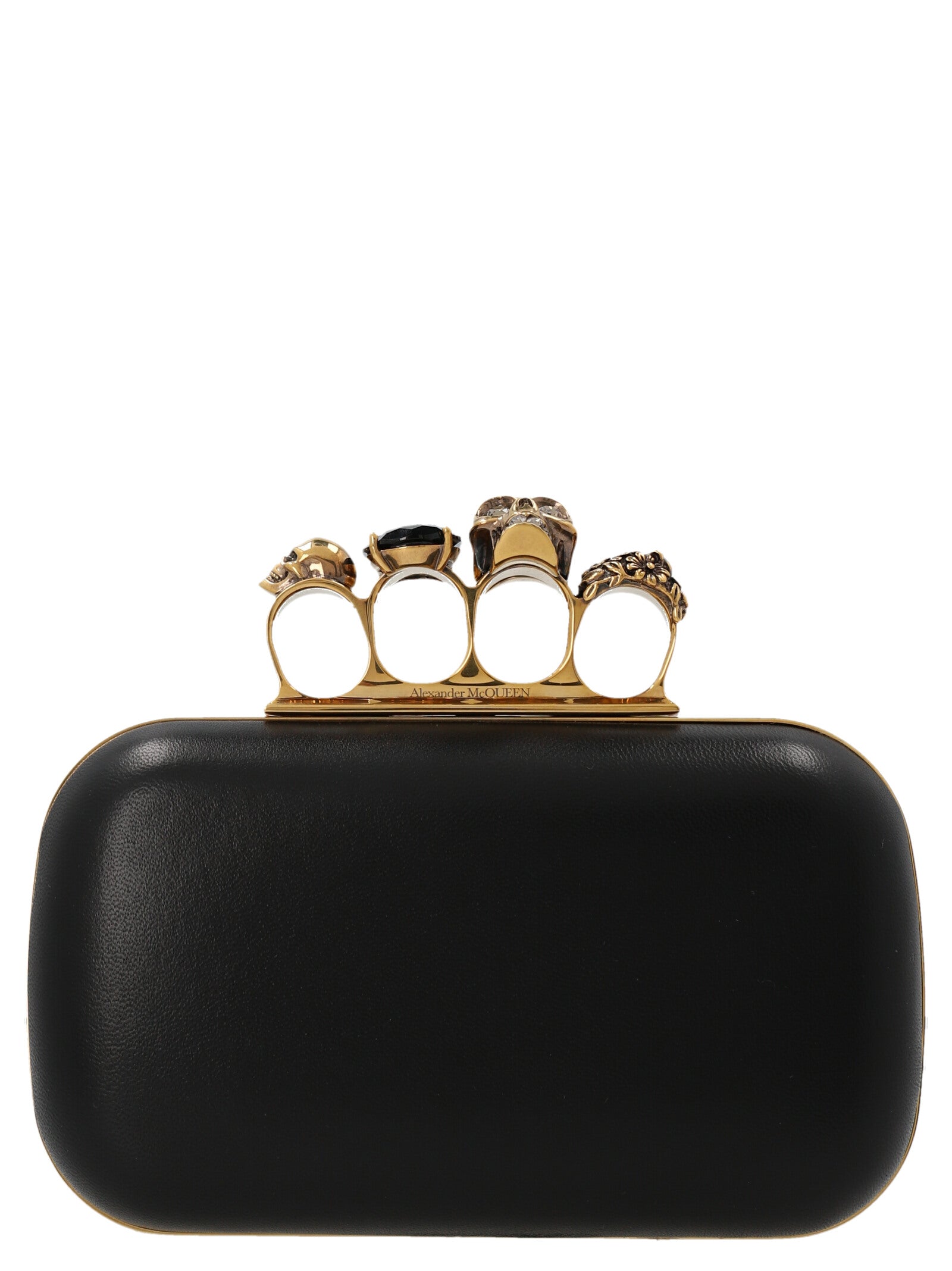 Frizione in pelle nappa nera "Skull Four Ring" con un cranio e una maniglia con quattro anelli di finitura in oro antichi con cristalli Swarovski, una tracolla a catena rimovibile e accessori in ottone in metallo con una finitura in oro antichi.