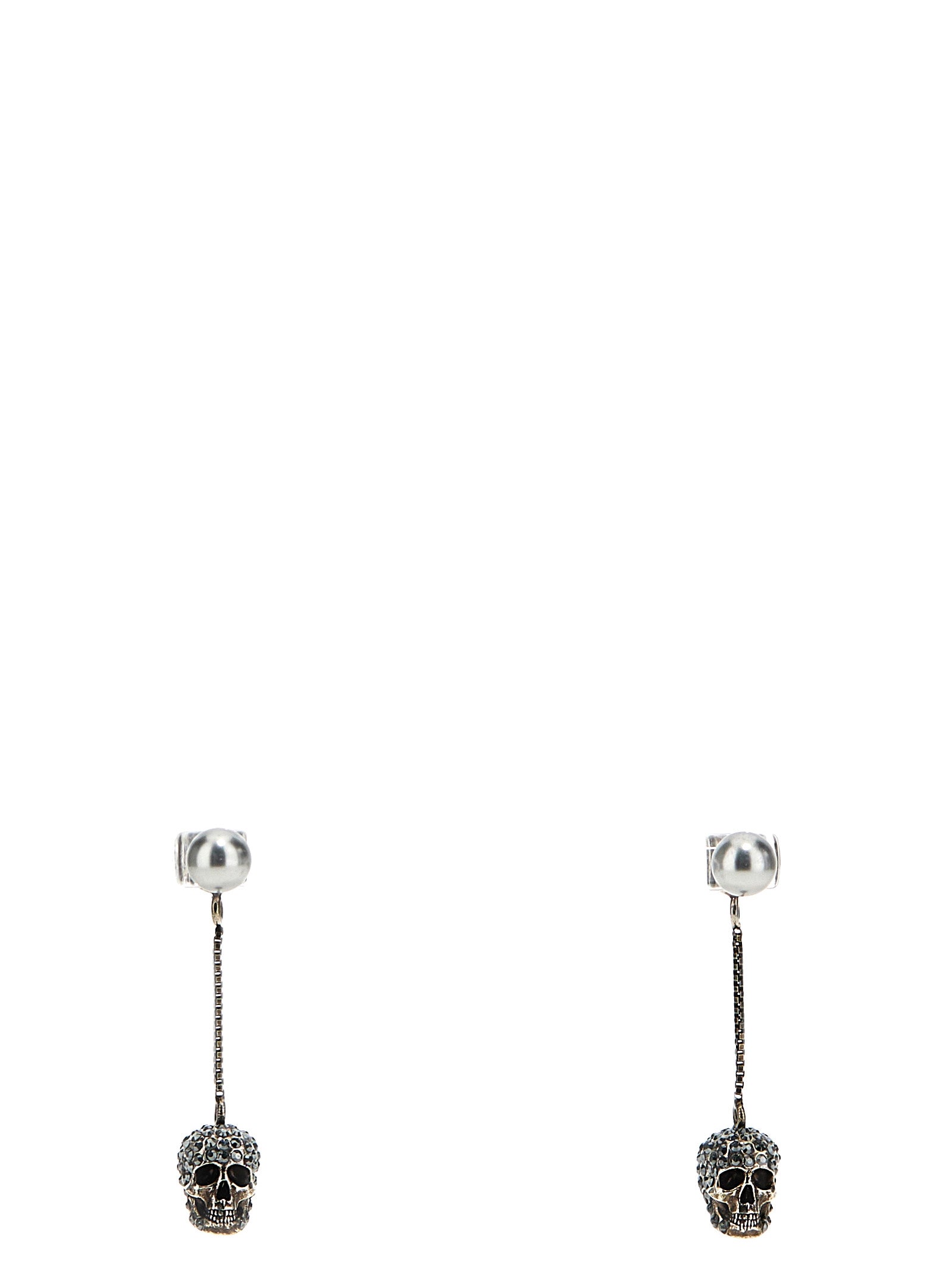 Orecchini in metallo argento con perle e un ciondolo "cranio" con cristalli. L'elemento non può essere restituito